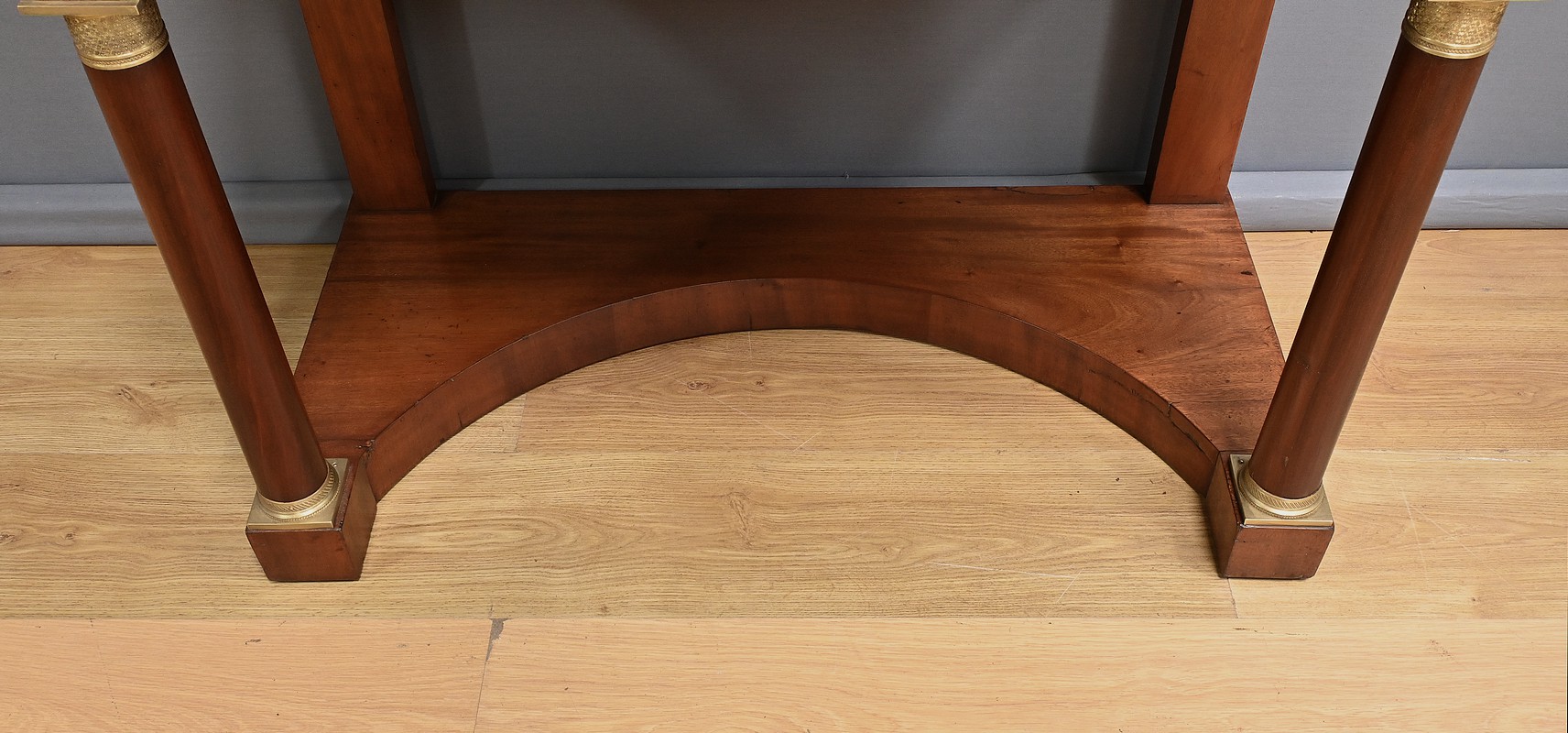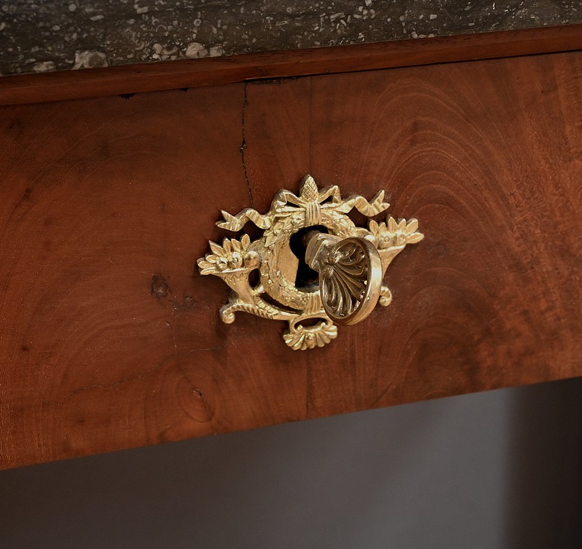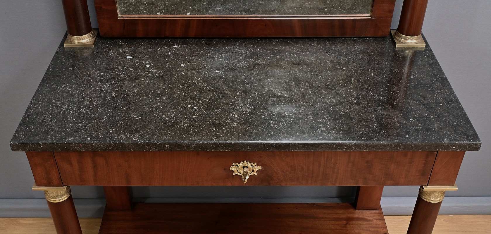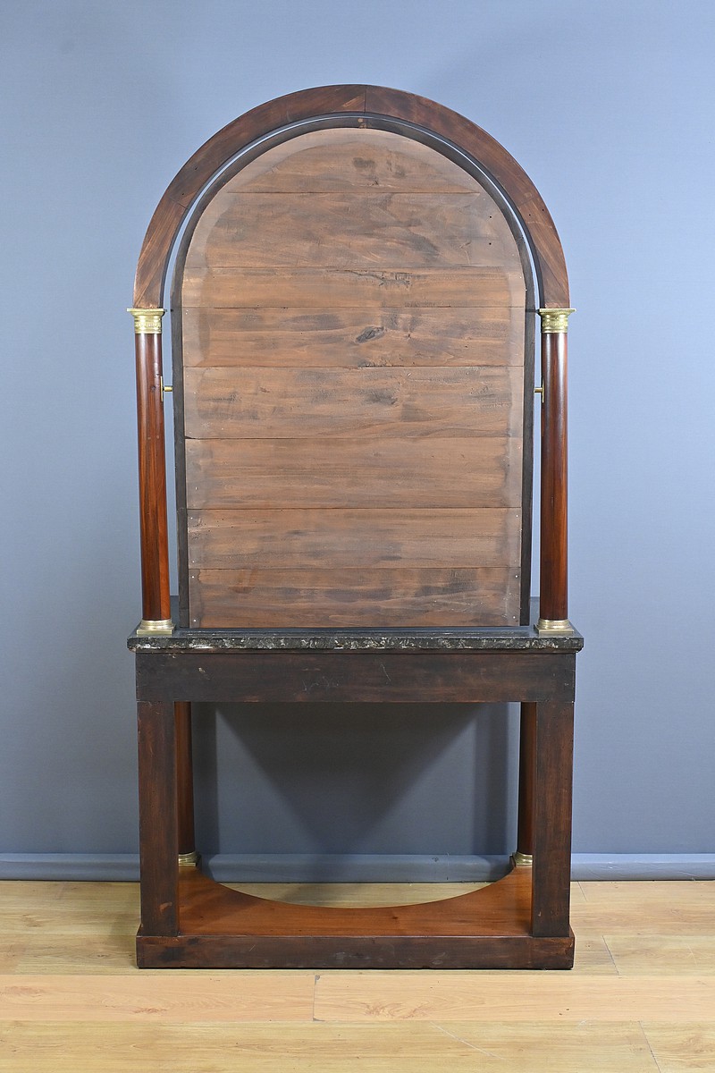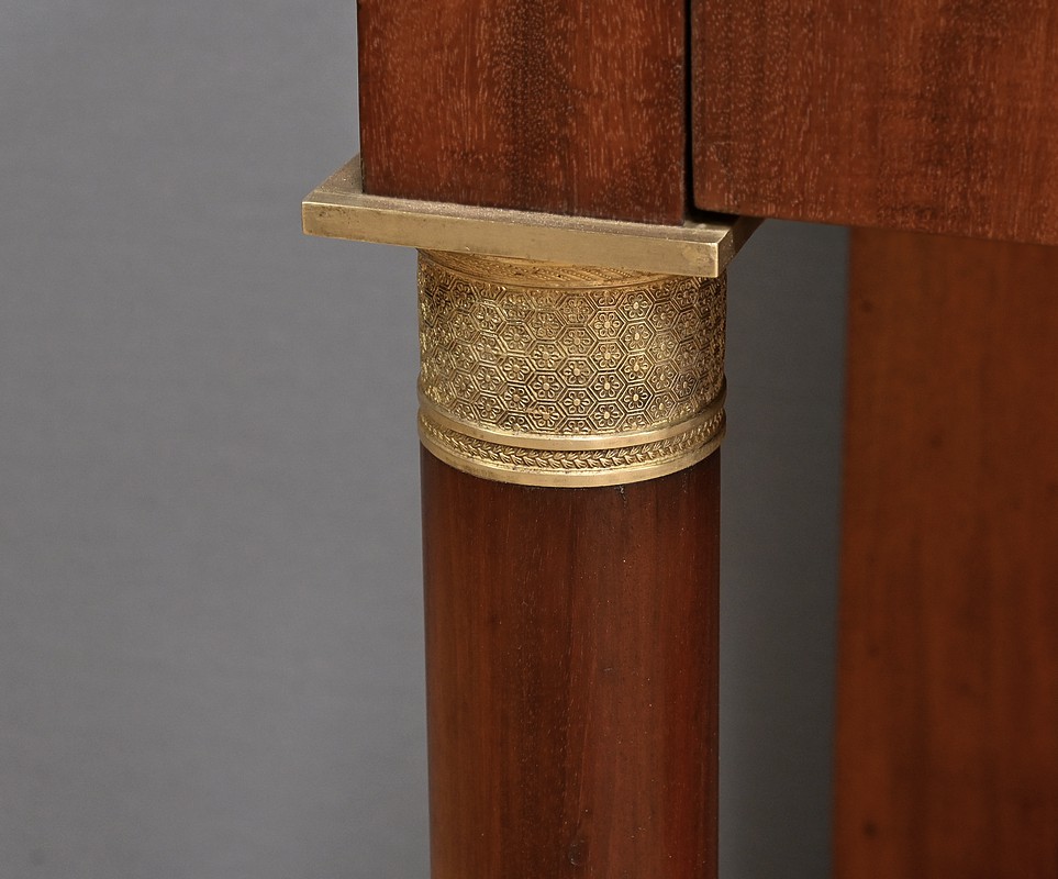Superbe coiffeuse Empire en acajou et placage de ronce d’acajou doté d’un grand miroir pivotant de forme rectangulaire avec arche en partie supérieure. Cette glace est entourée de colonnes agrémentées de bagues ciselées en bronze en partie haute et basse. Elles sont surmontées d’un arc en acajou suivant les lignes du miroir. Cet ensemble repose sur un marbre granité belge surmontant la ceinture ouvrant par un tiroir. Ce dernier est équipé d’une serrure fonctionnelle, d’une clé et entrée en bronze doré finement ouvragées. Cette coiffeuse possède des colonnes à l’avant garnies de bagues et collerettes en bronze. A l’arrière les pieds sont droits. Ils reposent sur une base concave assurant stabilité à l’ensemble.