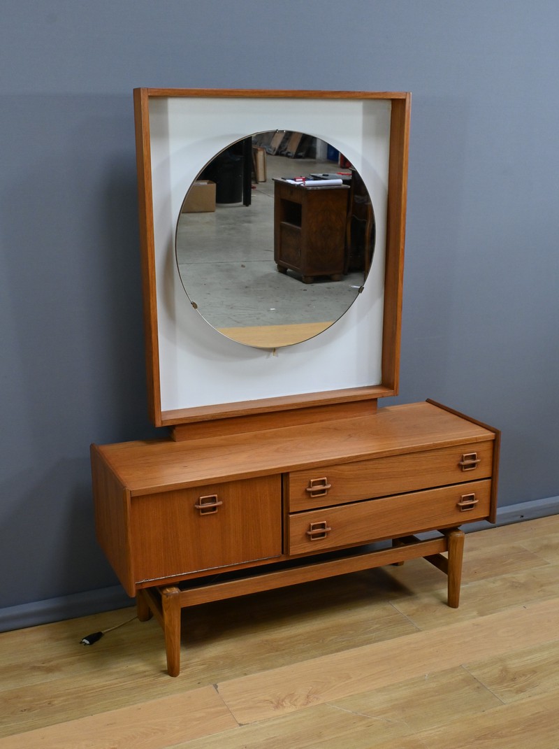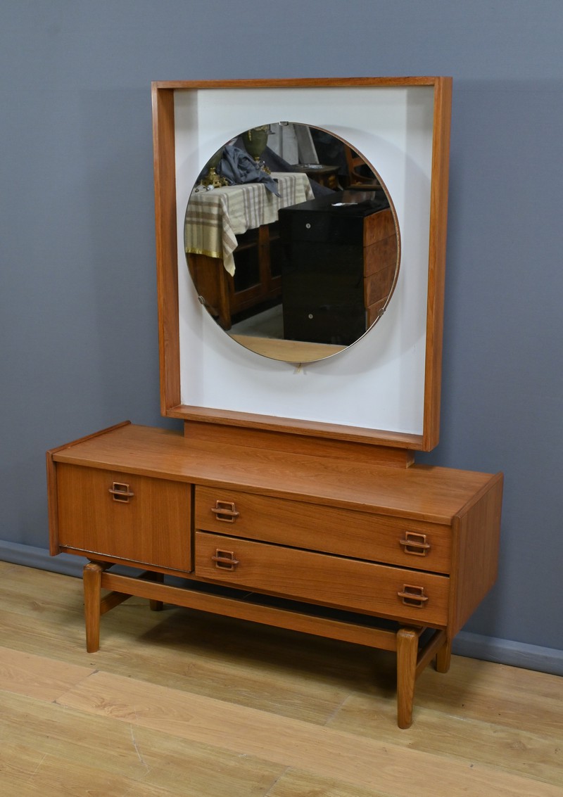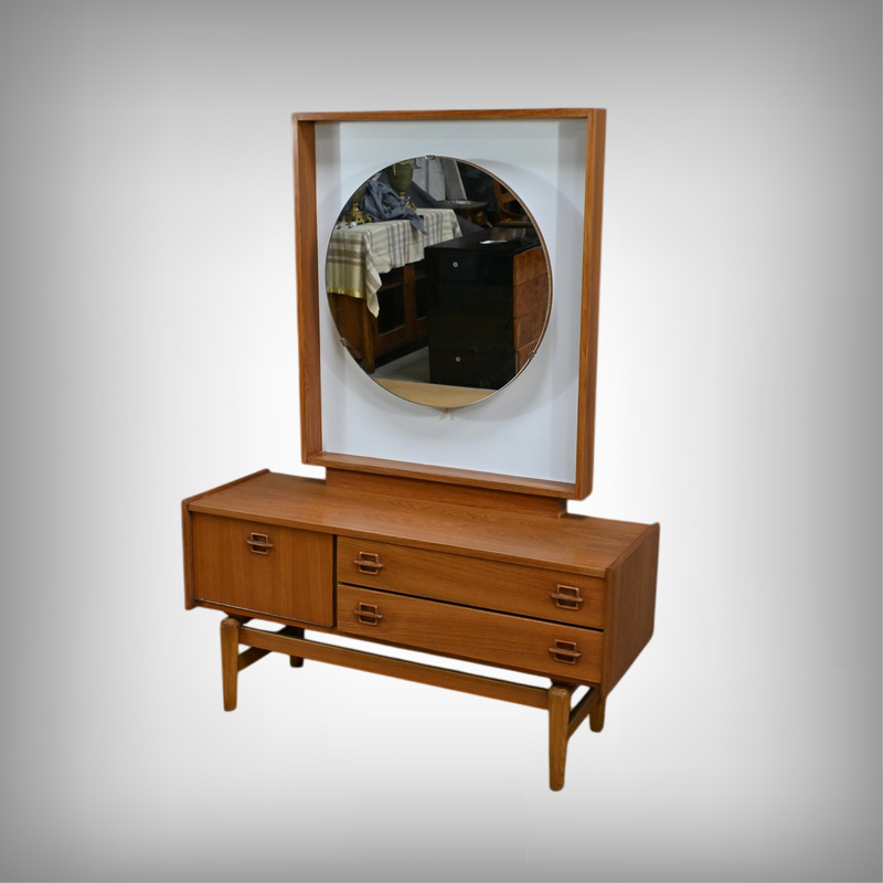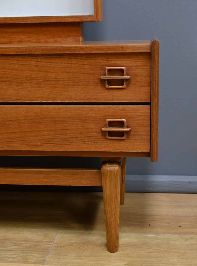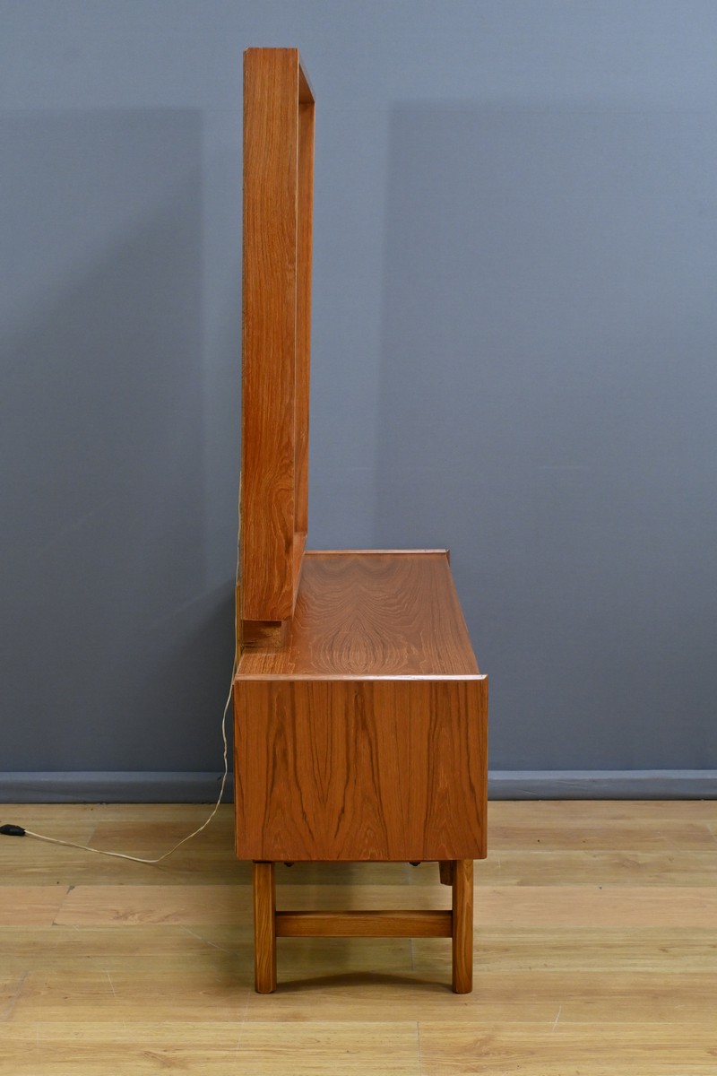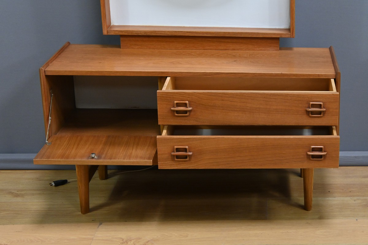 Témoin du raffinement et du design fonctionnel du mobilier nordique, cette coiffeuse scandinave en teck des années 1960 incarne à la fois modernité et praticité.