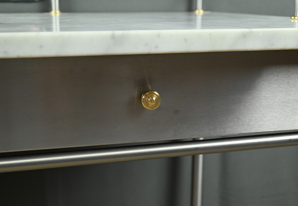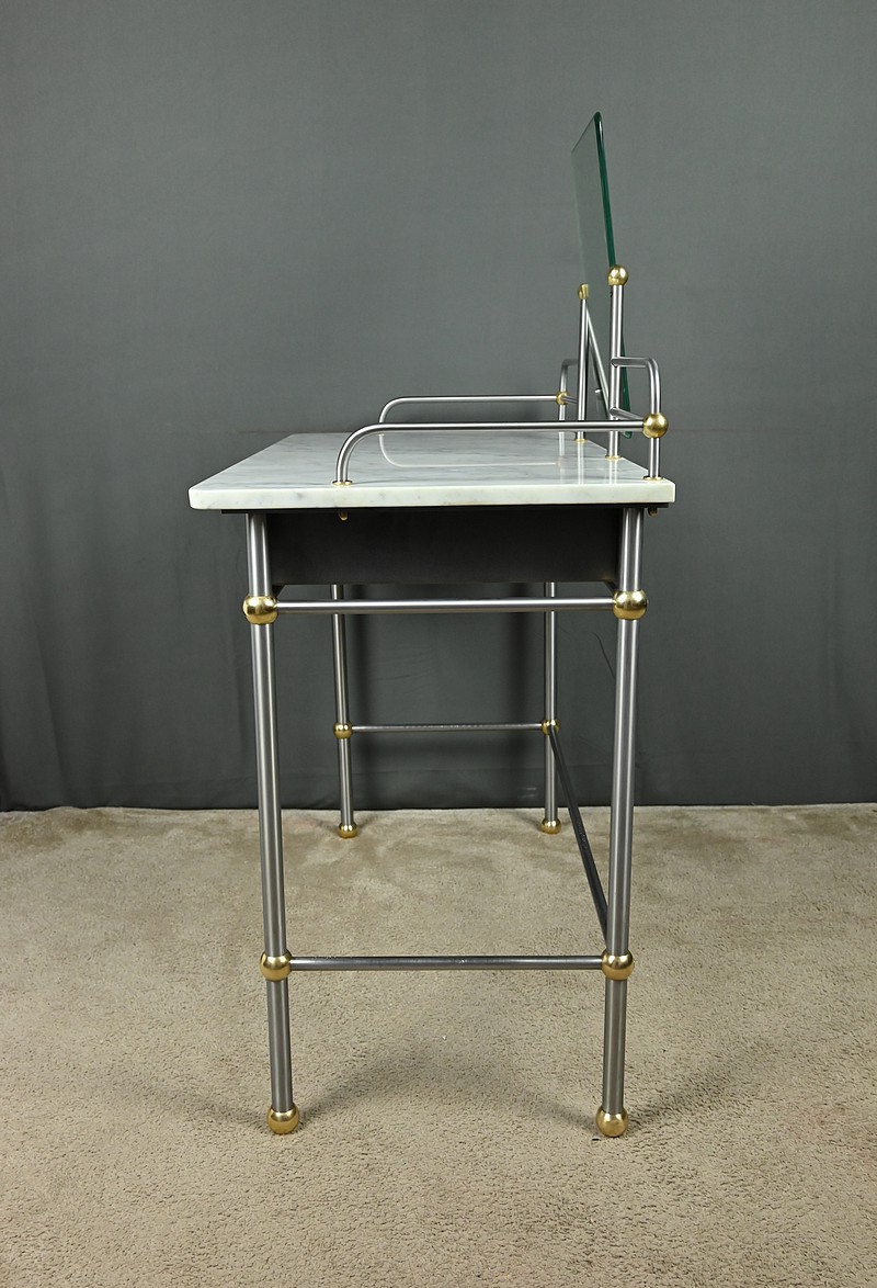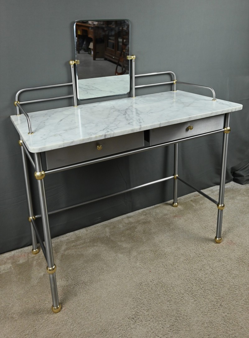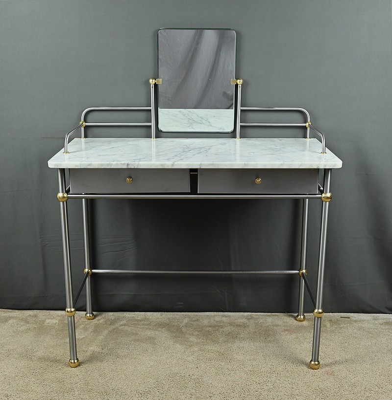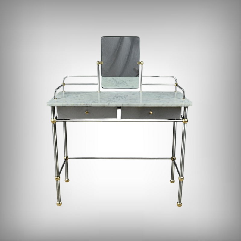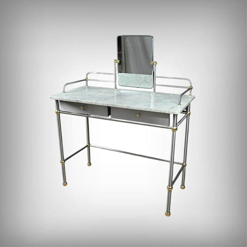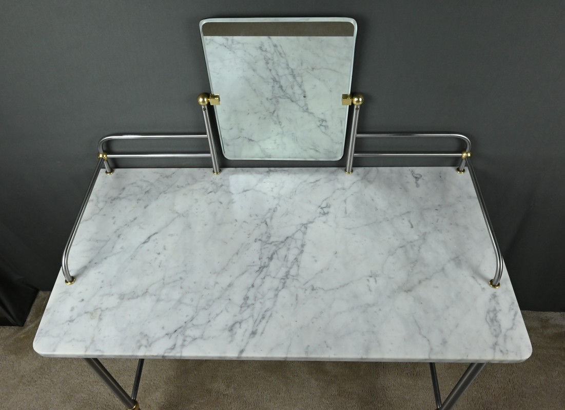 Cette coiffeuse vintage de belle qualité séduit par son design élégant et ses matériaux nobles. Son plateau en marbre de Carrare, aux veines grises délicates et au fini lumineux, apporte une touche de raffinement à l’ensemble. La structure tubulaire en métal chromé, à la fois solide et brillante, souligne le style intemporel de la pièce.