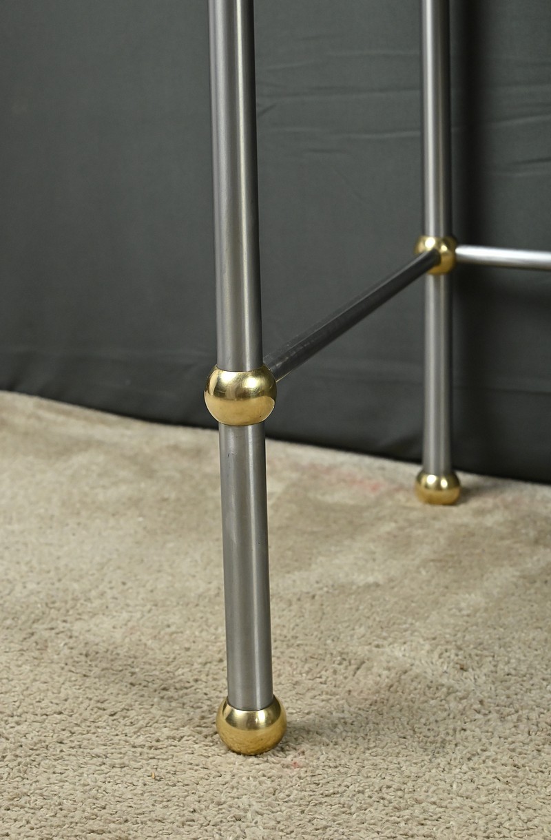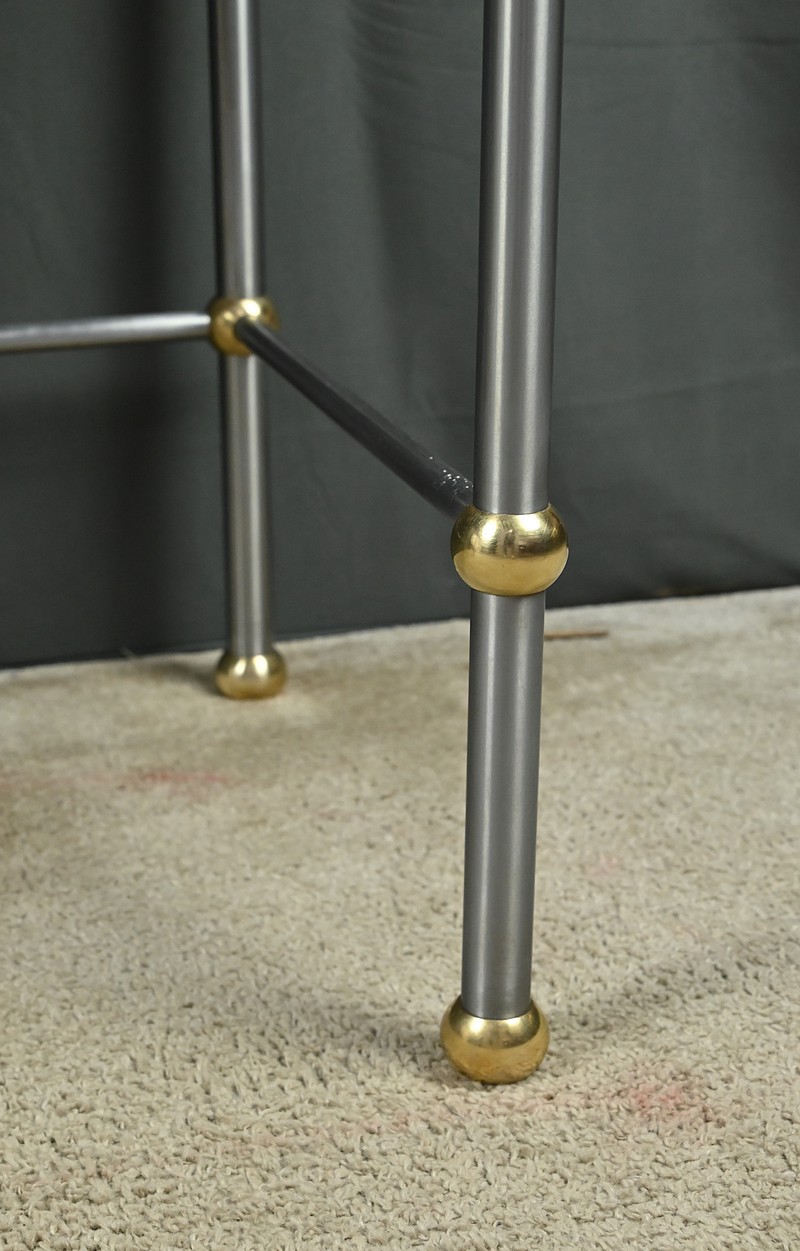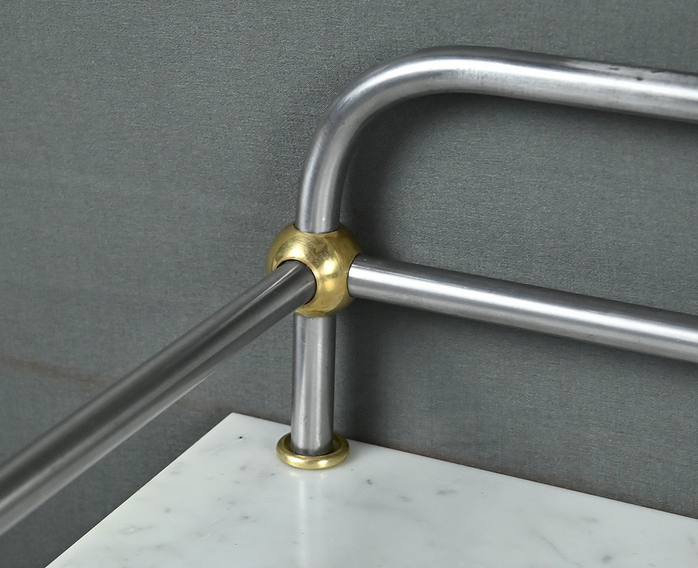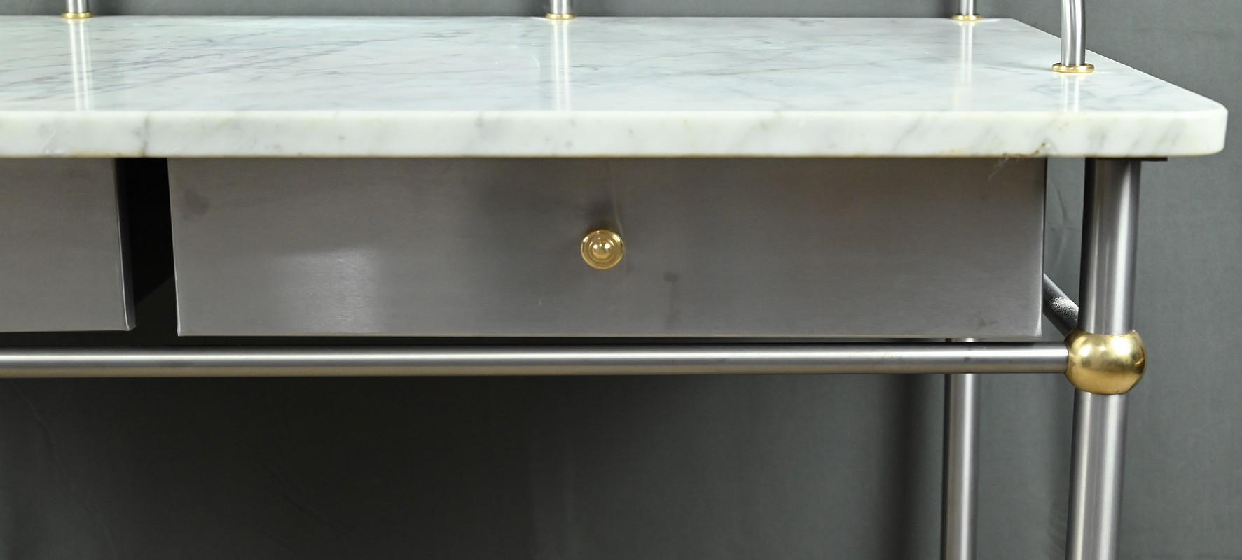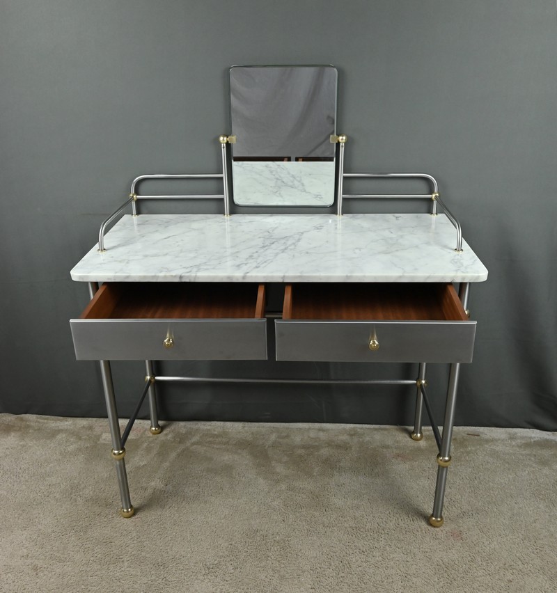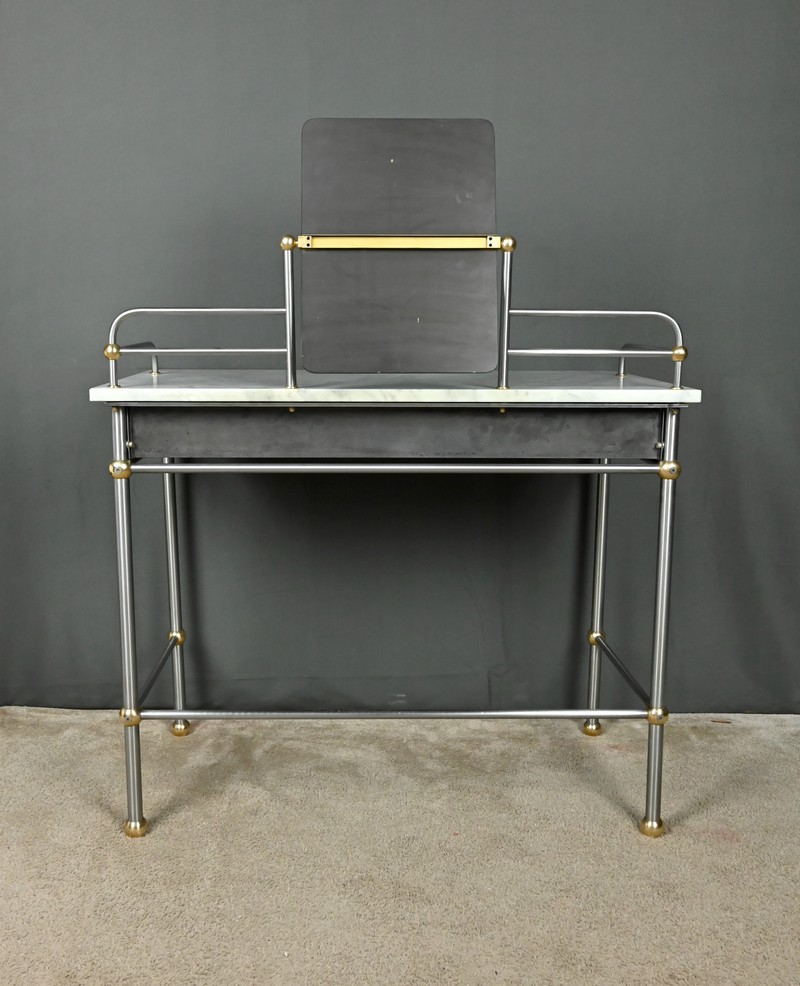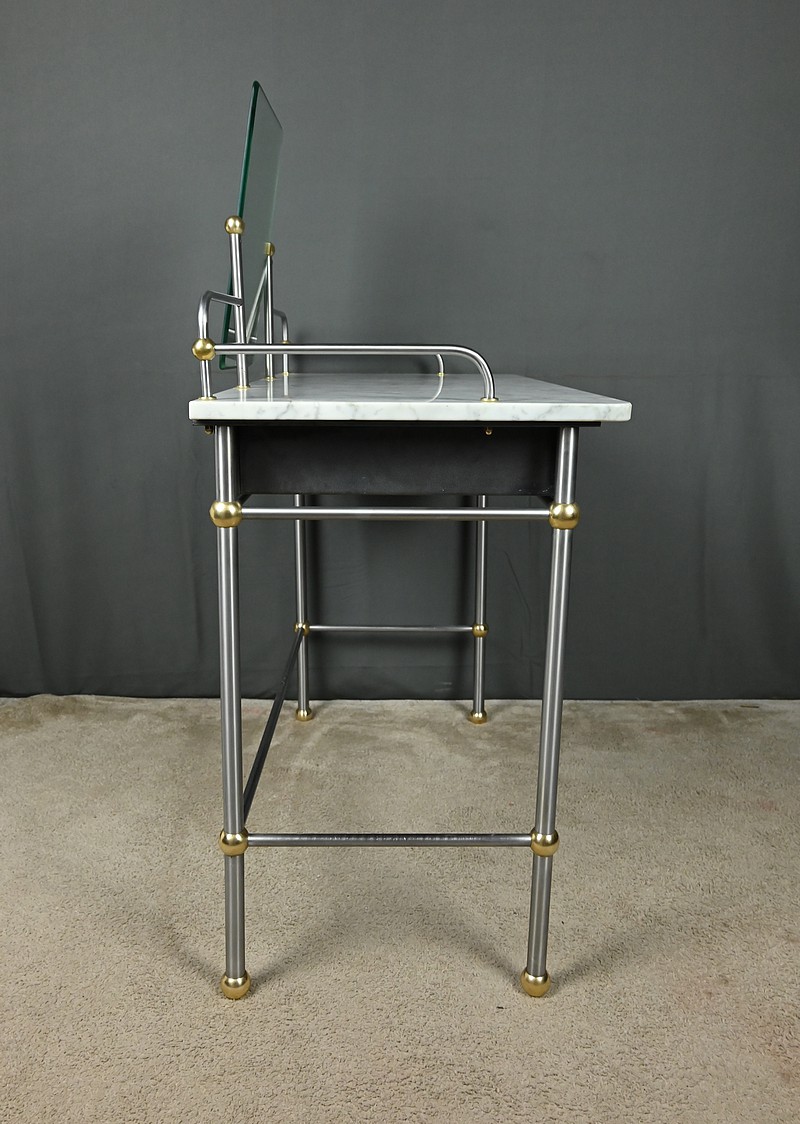 Cette coiffeuse vintage de belle qualité séduit par son design élégant et ses matériaux nobles. Son plateau en marbre de Carrare, aux veines grises délicates et au fini lumineux, apporte une touche de raffinement à l’ensemble. La structure tubulaire en métal chromé, à la fois solide et brillante, souligne le style intemporel de la pièce.