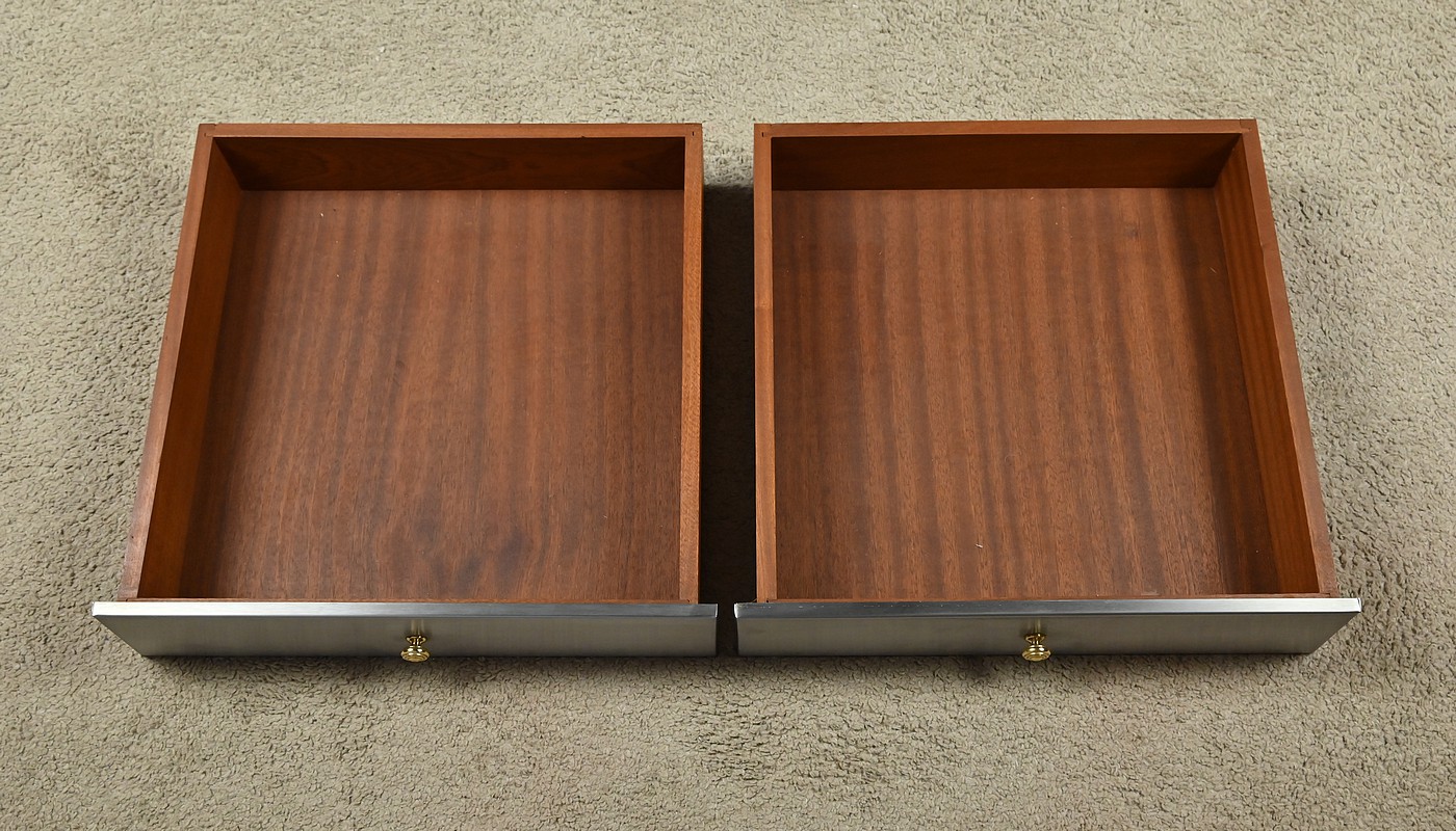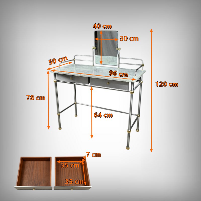 La coiffeuse dispose de deux tiroirs spacieux, parfaits pour ranger les accessoires de beauté ou les objets personnels. Leurs façades métallisées s’accordent harmonieusement avec la structure, tandis que les boutons de tirage en laiton doré apportent une finition soignée.