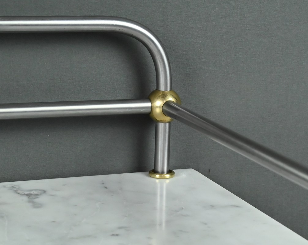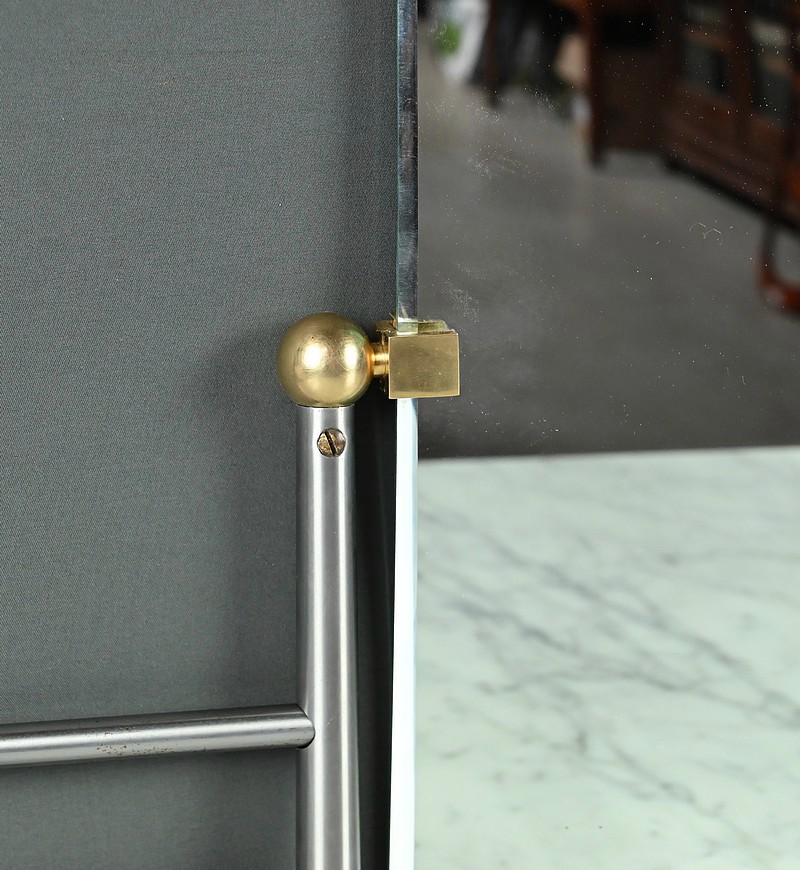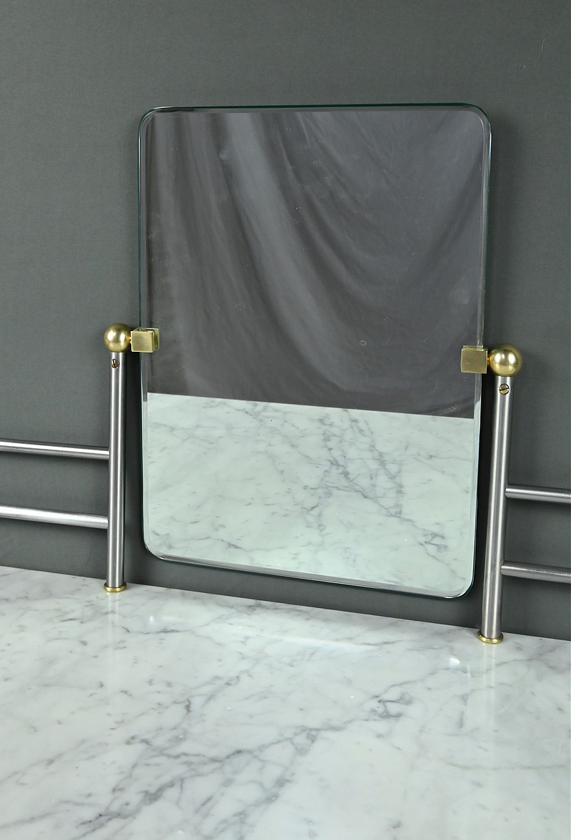 Le miroir en verre biseauté, monté sur des rails en laiton, peut être incliné selon les besoins, offrant confort et praticité.