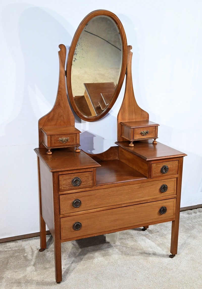 Cette petite coiffeuse est surmontée d’un miroir au mercure ovale pivotant monté sur axe.