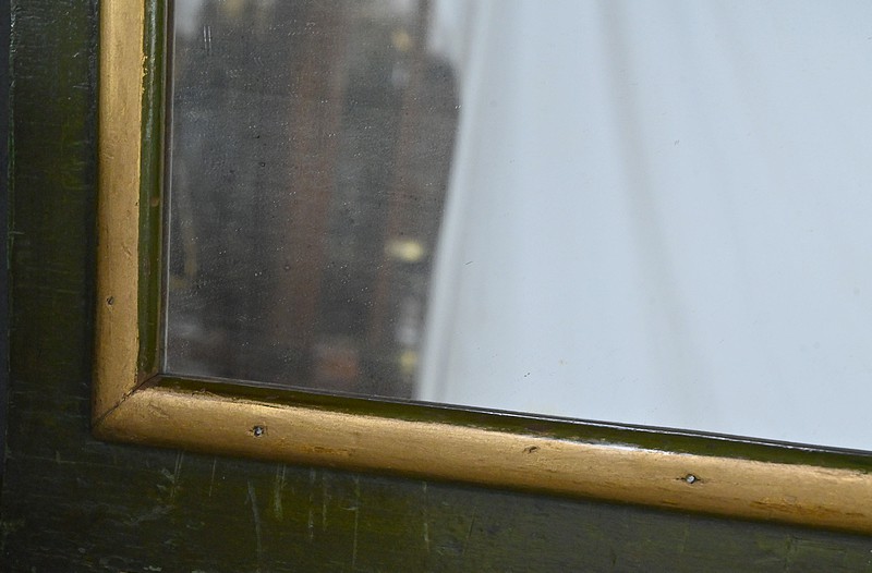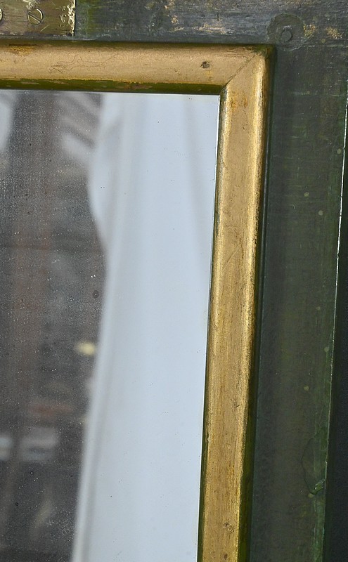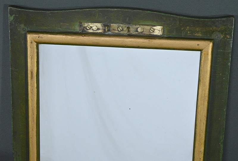 Cette petite coiffeuse en chêne peint couleur vert fougère ouvre en ceinture par un tiroir avec serrure d’origine avec entrée blason et clé.