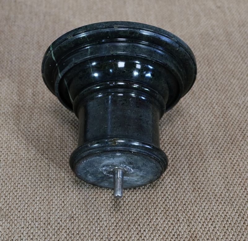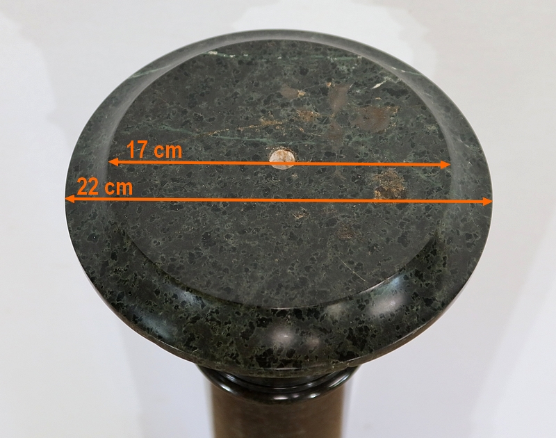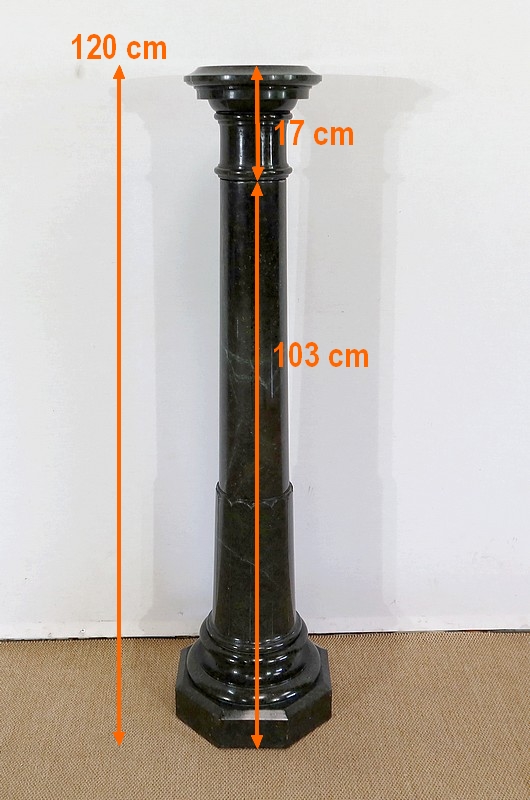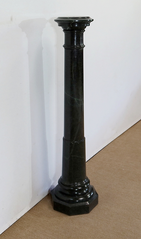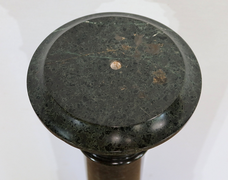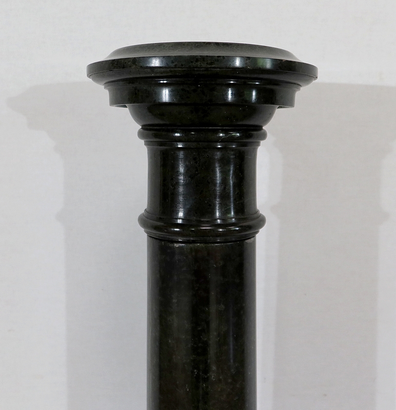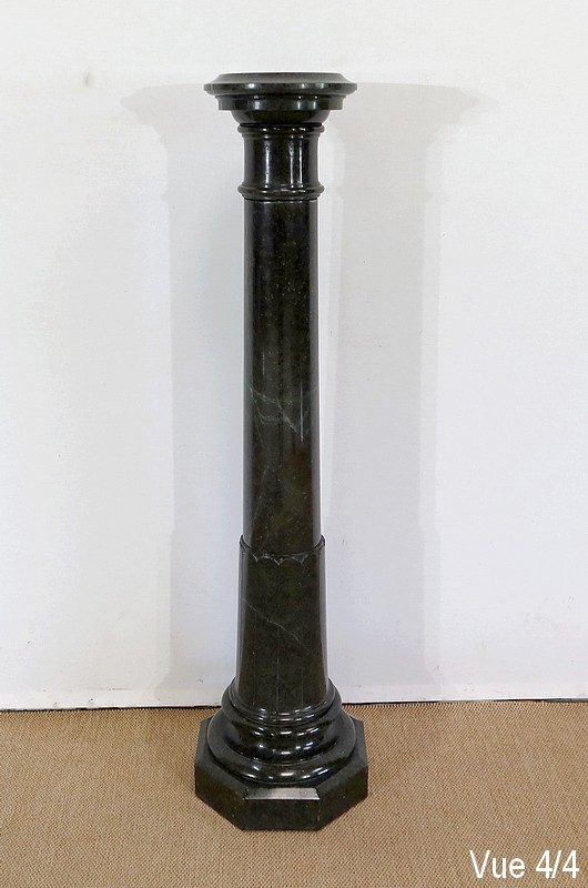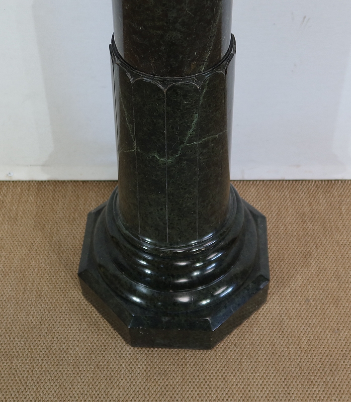 Belle colonne en marbre vert de mer, appelé également vert de Gênes, reposant sur un socle octogonal chanfreiné composé d’importantes moulures surplombé d’une partie festonnée. Cette colonne raffinée est dotée d’un fût cylindrique s’amincissant vers le haut et d’un plateau tournant circulaire à débordement.