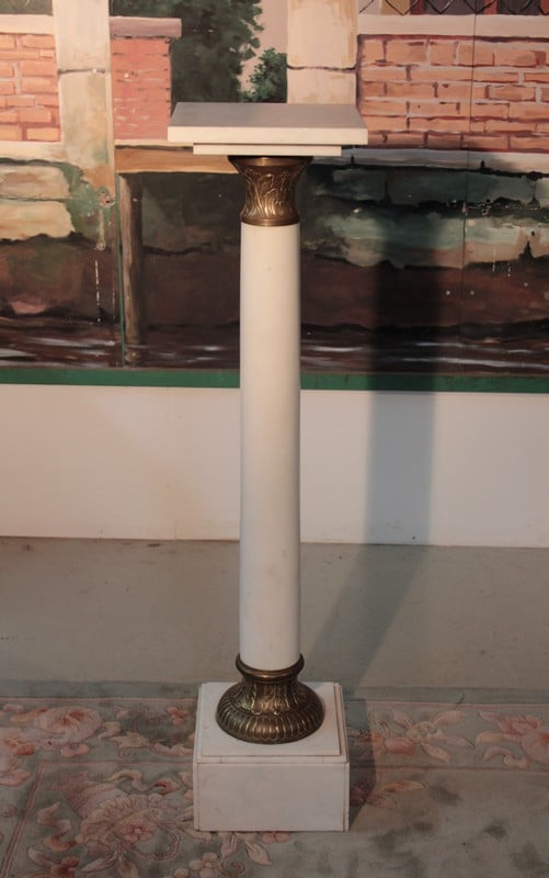 Colonne de marbre blanc reposant sur un socle mesurant 25cm de côté par 15cm de hauteur. Le support mesure 27cm x 27cm. La colonne est baguée de bronze en bas et en haut. La hauteur totale est de 114cm.