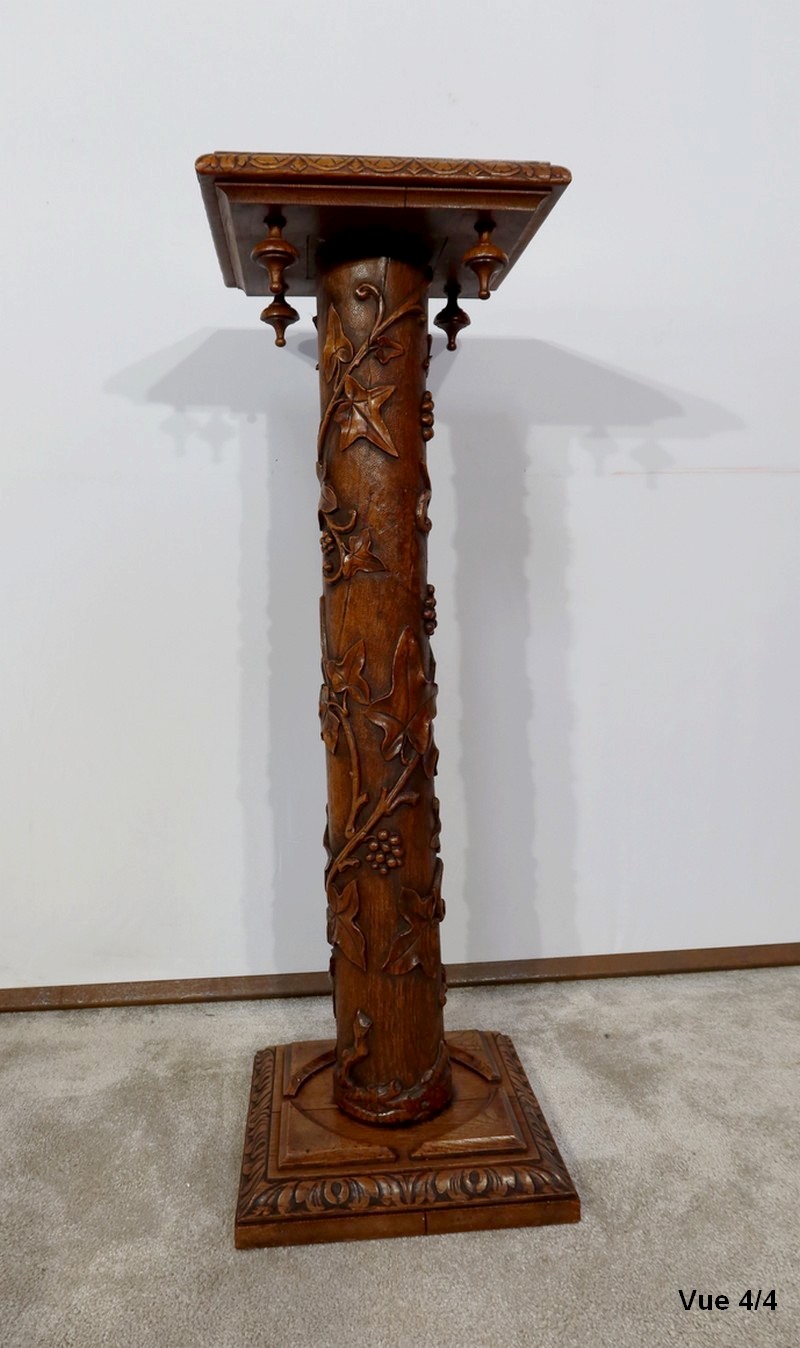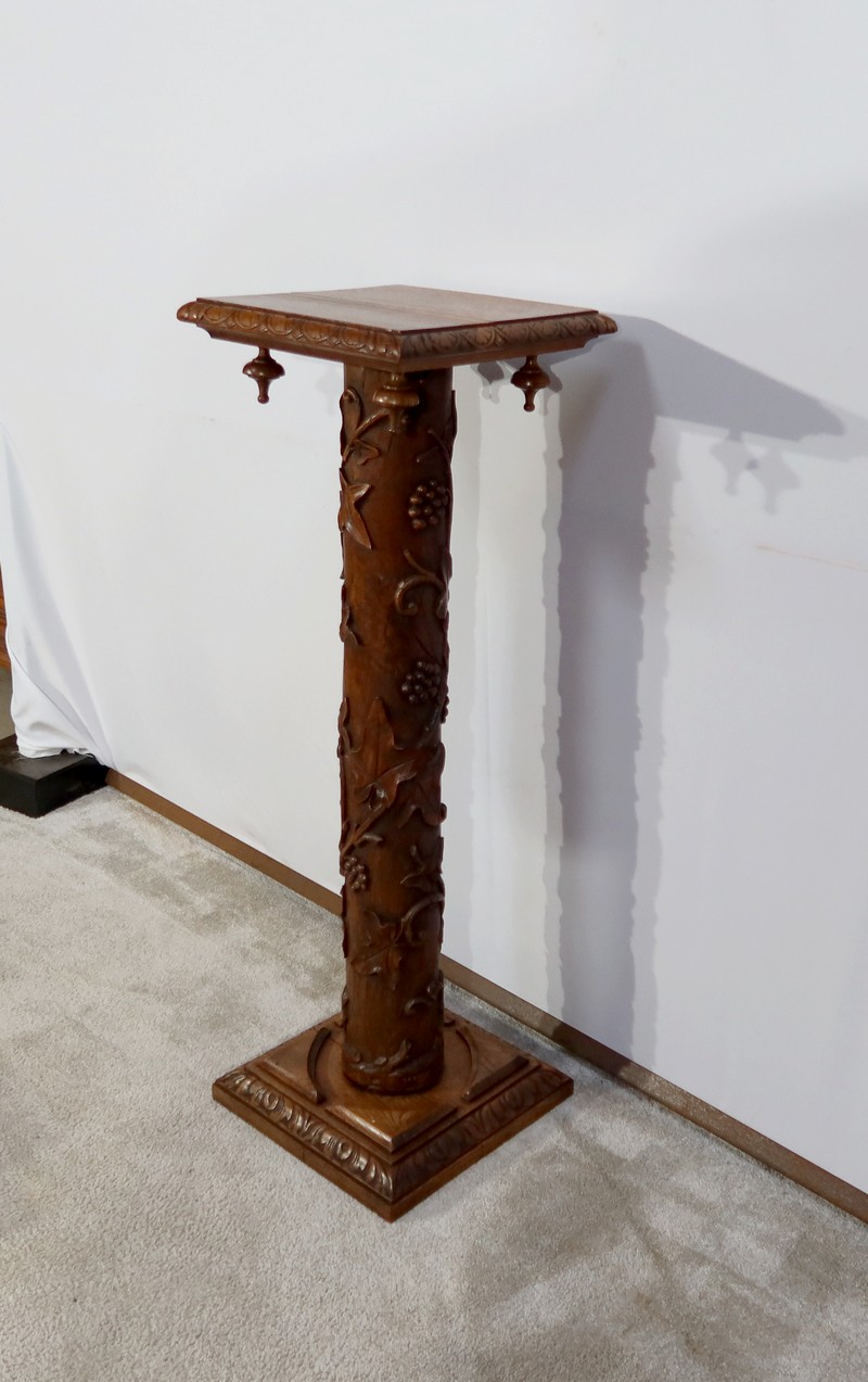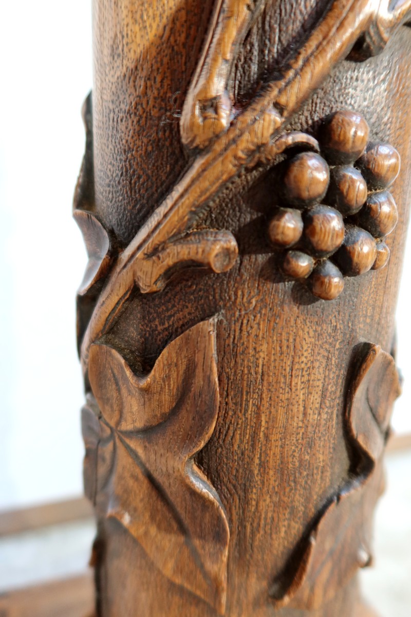 Colonne en chêne composée d’un fût cylindrique sculpté en relief de feuilles de vigne et de grappes de raisin.