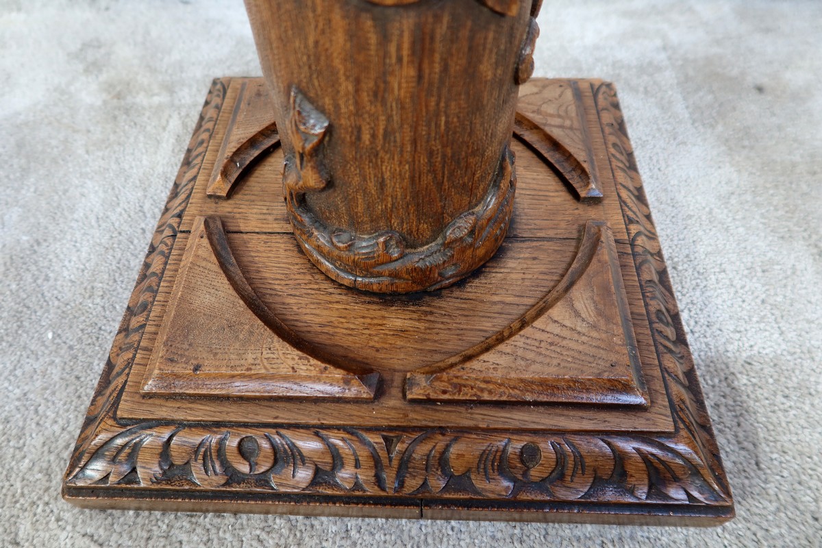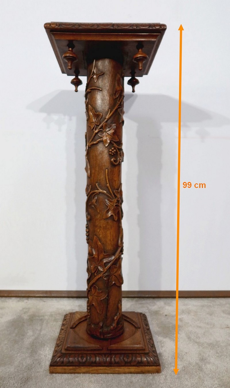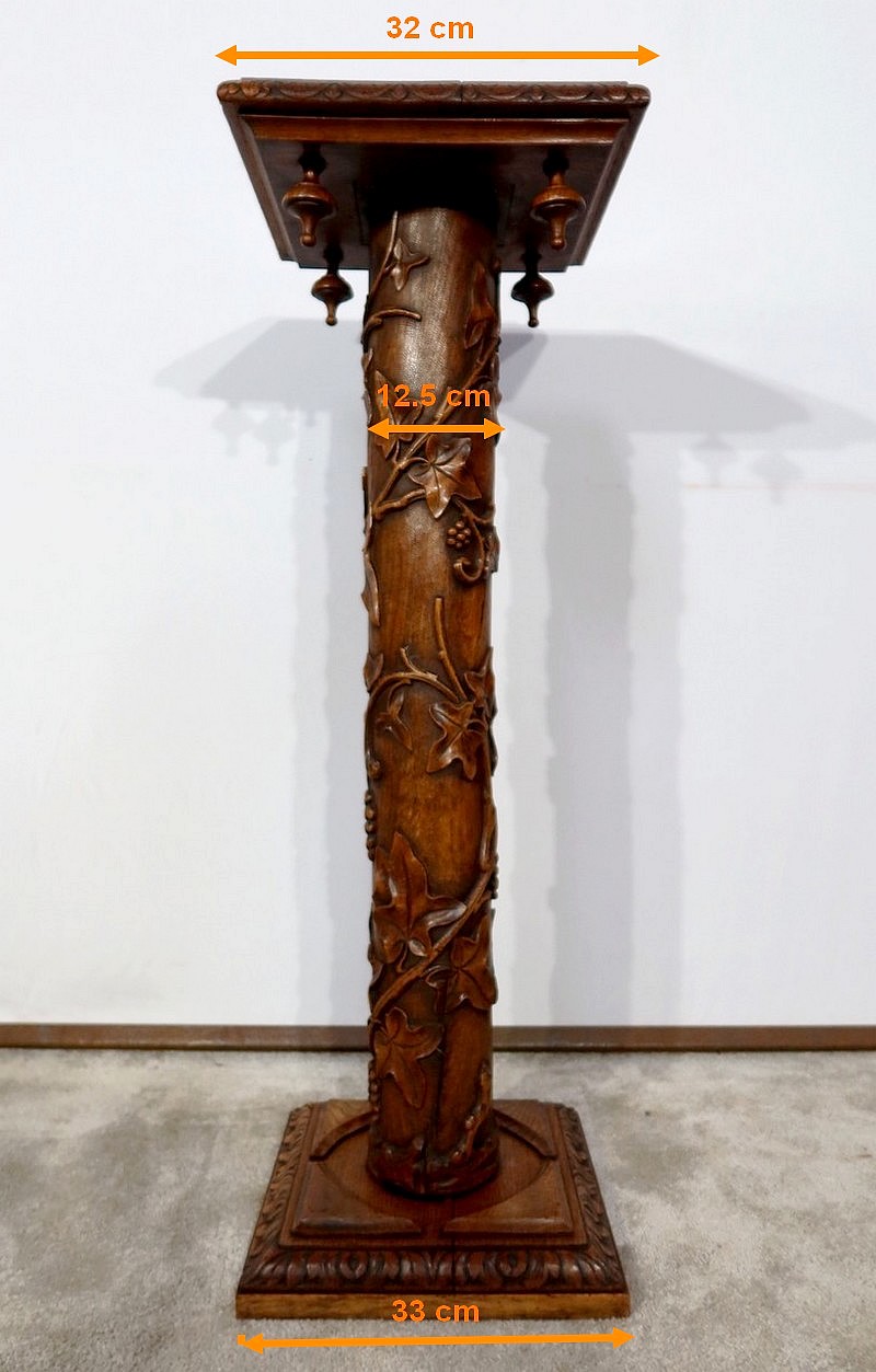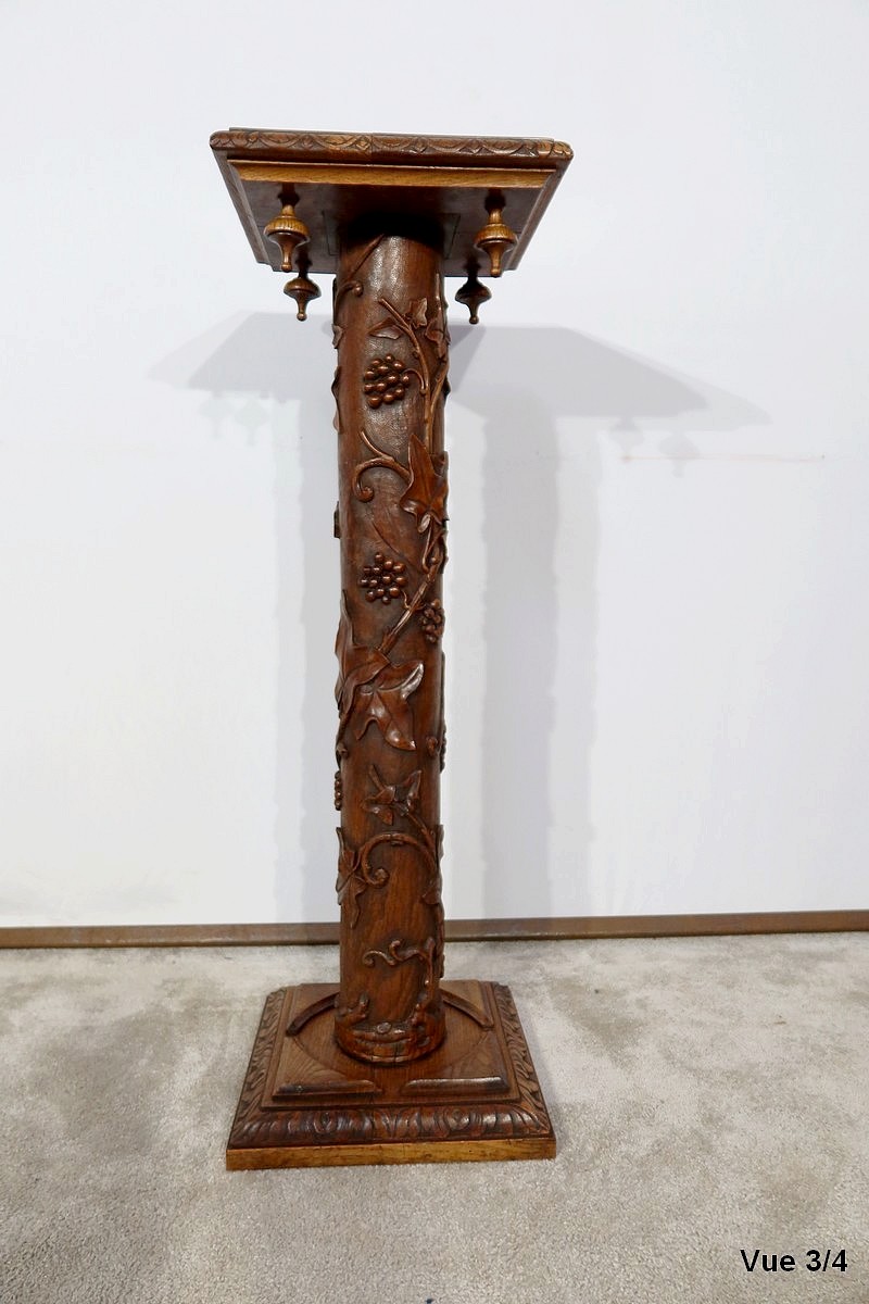 Colonne en chêne composée d’un fût cylindrique sculpté en relief de feuilles de vigne et de grappes de raisin.