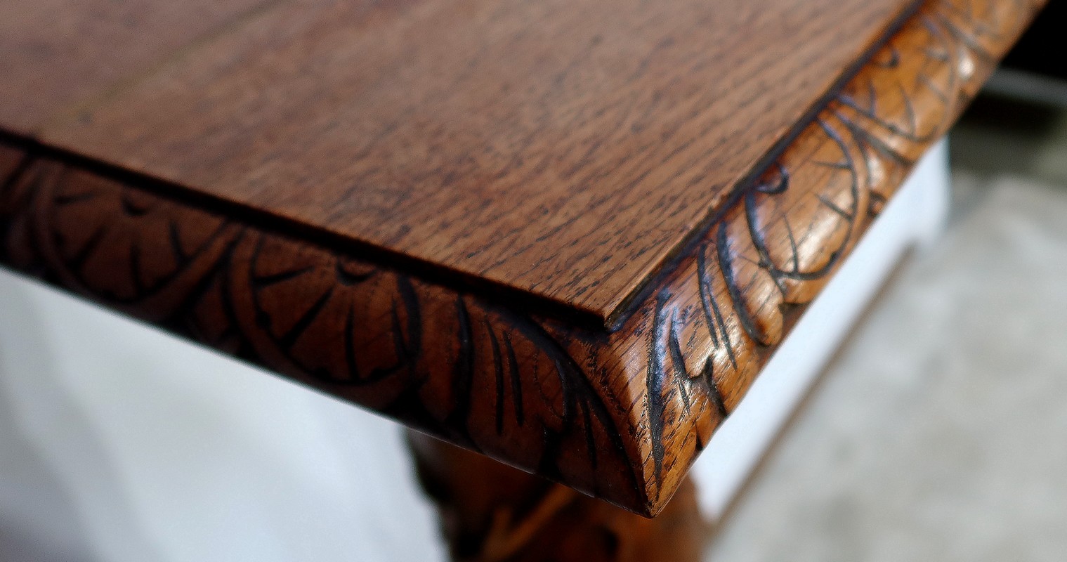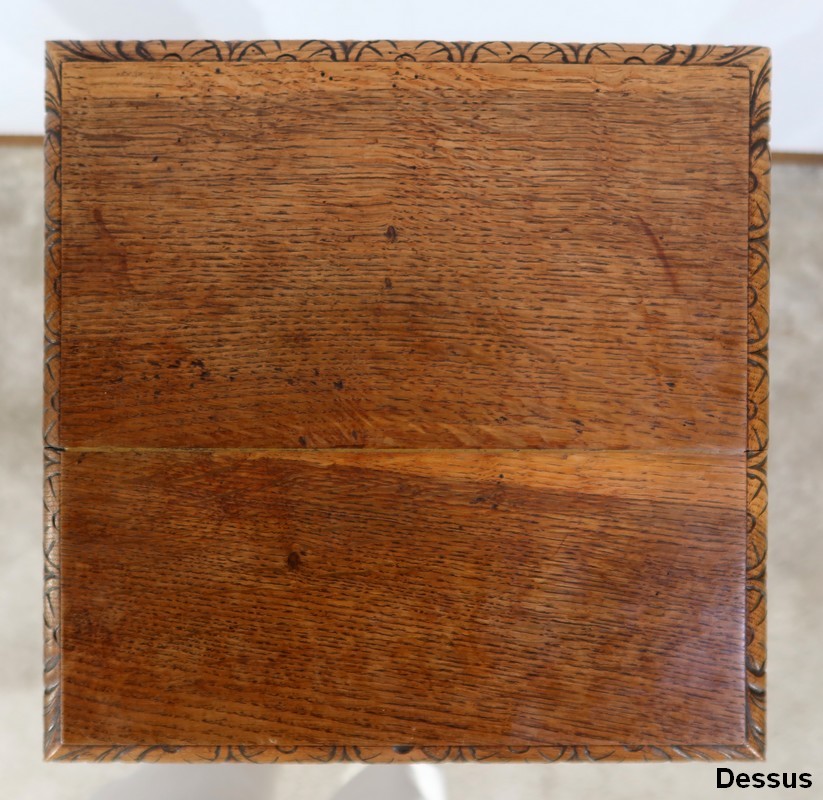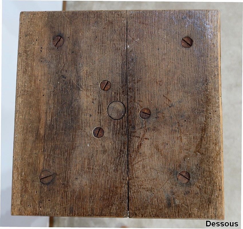 Le plateau, au pourtour en bec de corbin à motifs, est habillé, en dessous, de quatre petites moulures dans l’esprit de toupies renversées.