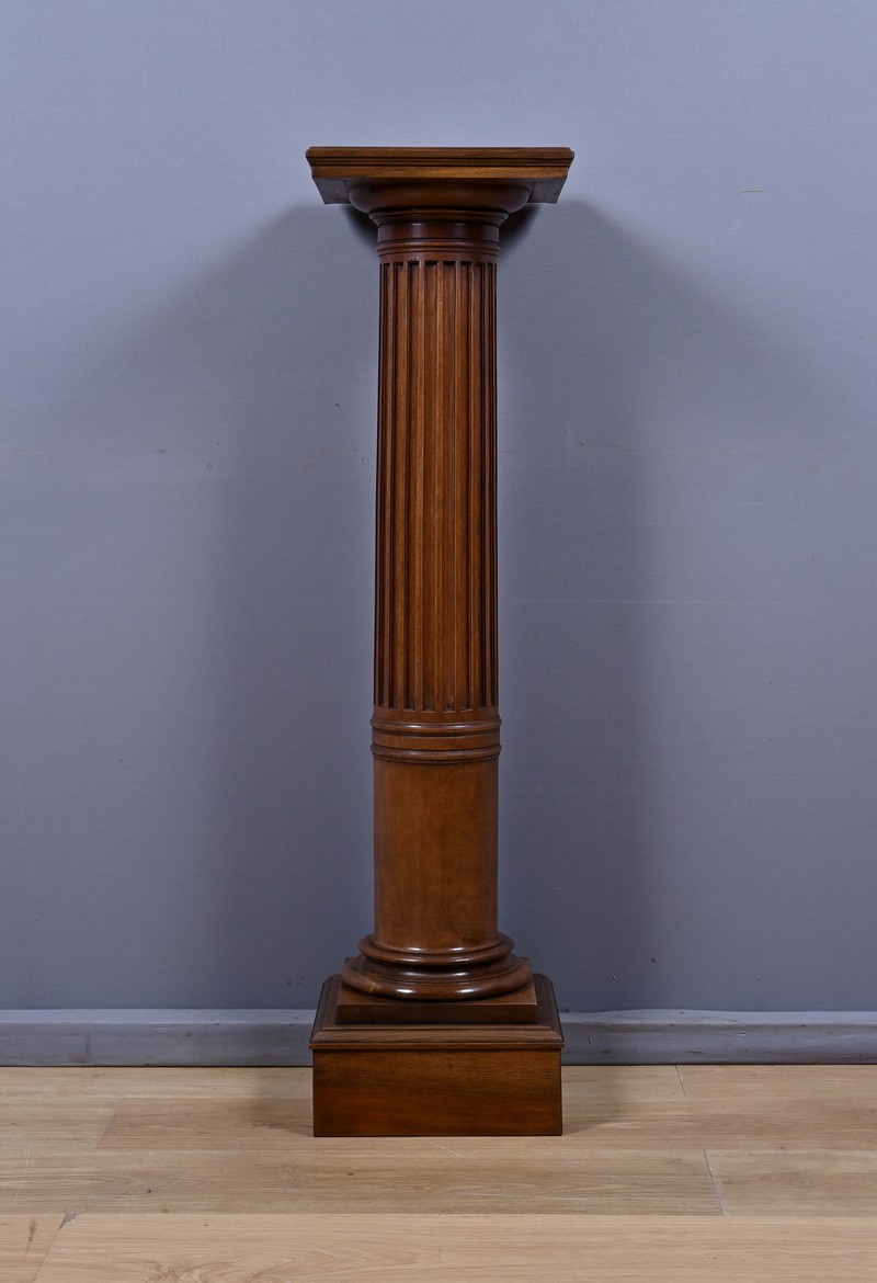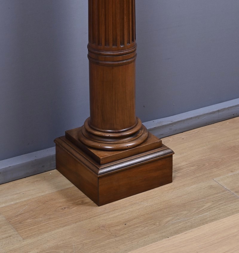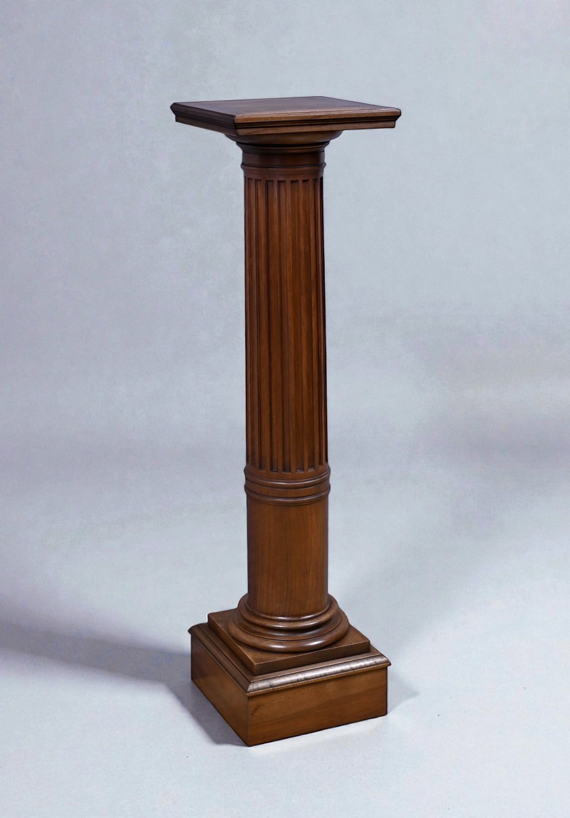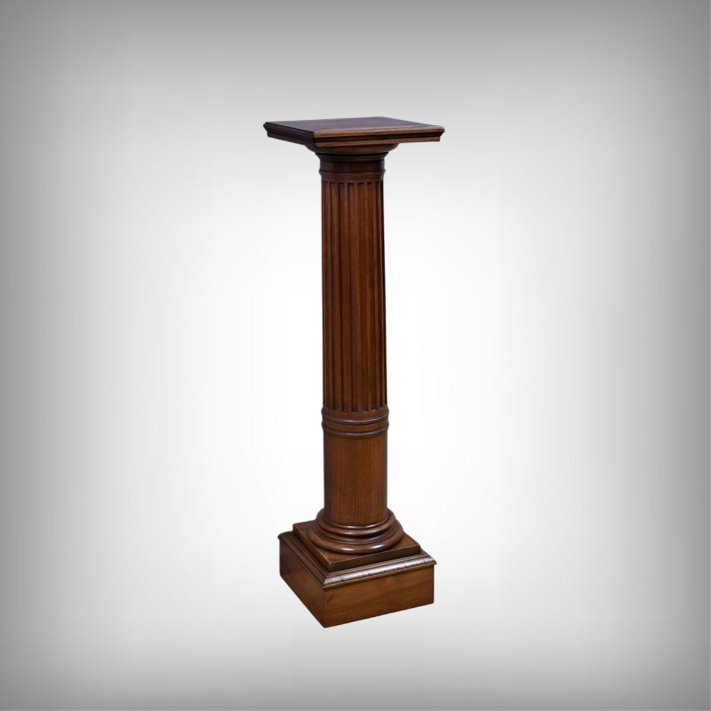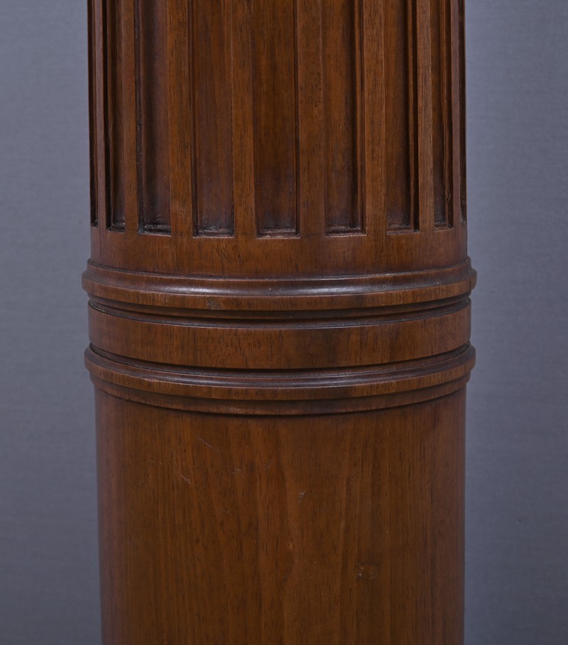 Le noyer, offre une patine chaude et profonde, aux nuances brunes, révélant le veinage noble du bois. La finition témoigne d’un savoir-faire artisanal exigeant, où chaque détail – des cannelures régulières à l’équilibre des proportions – reflète le goût classique hérité de l’architecture antique. Cette pièce, à la fois décorative et fonctionnelle, s’intègre avec élégance dans un intérieur classique, éclectique ou contemporain, apportant une touche de verticalité et de distinction. Elle peut être utilisée comme support d’exposition dans un salon, une galerie ou une entrée, ou détournée en élément scénographique dans une vitrine ou un décor événementiel.