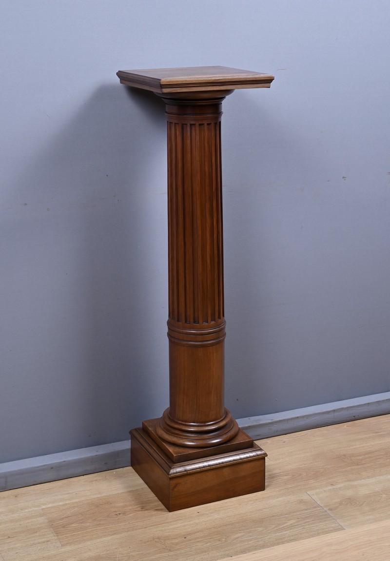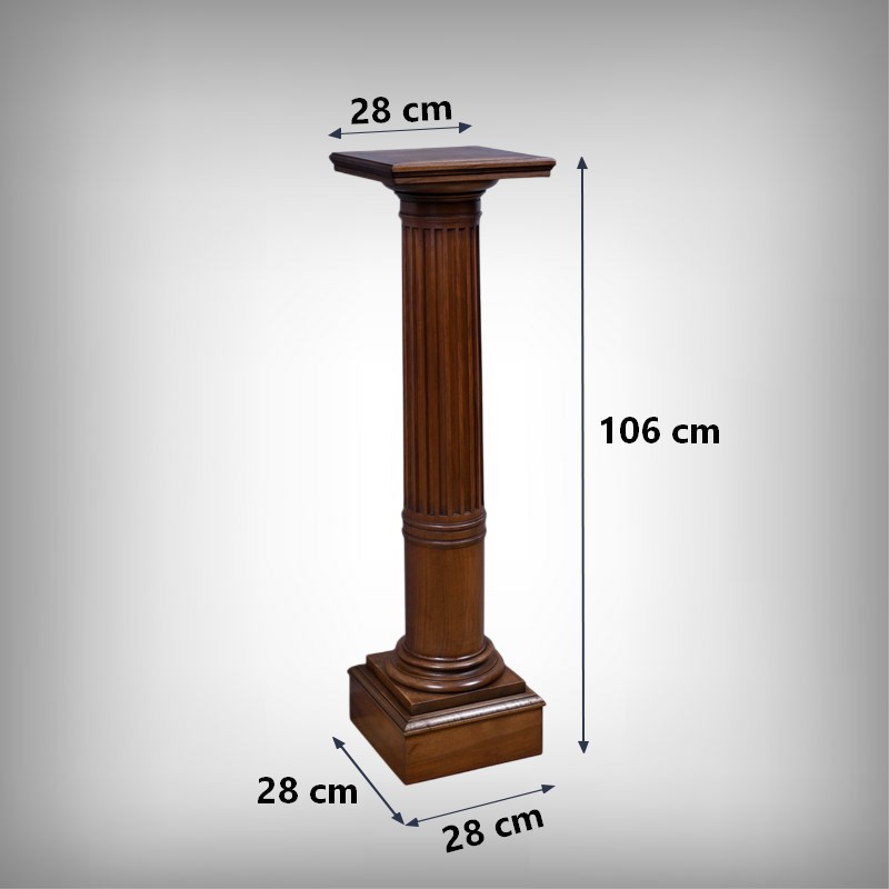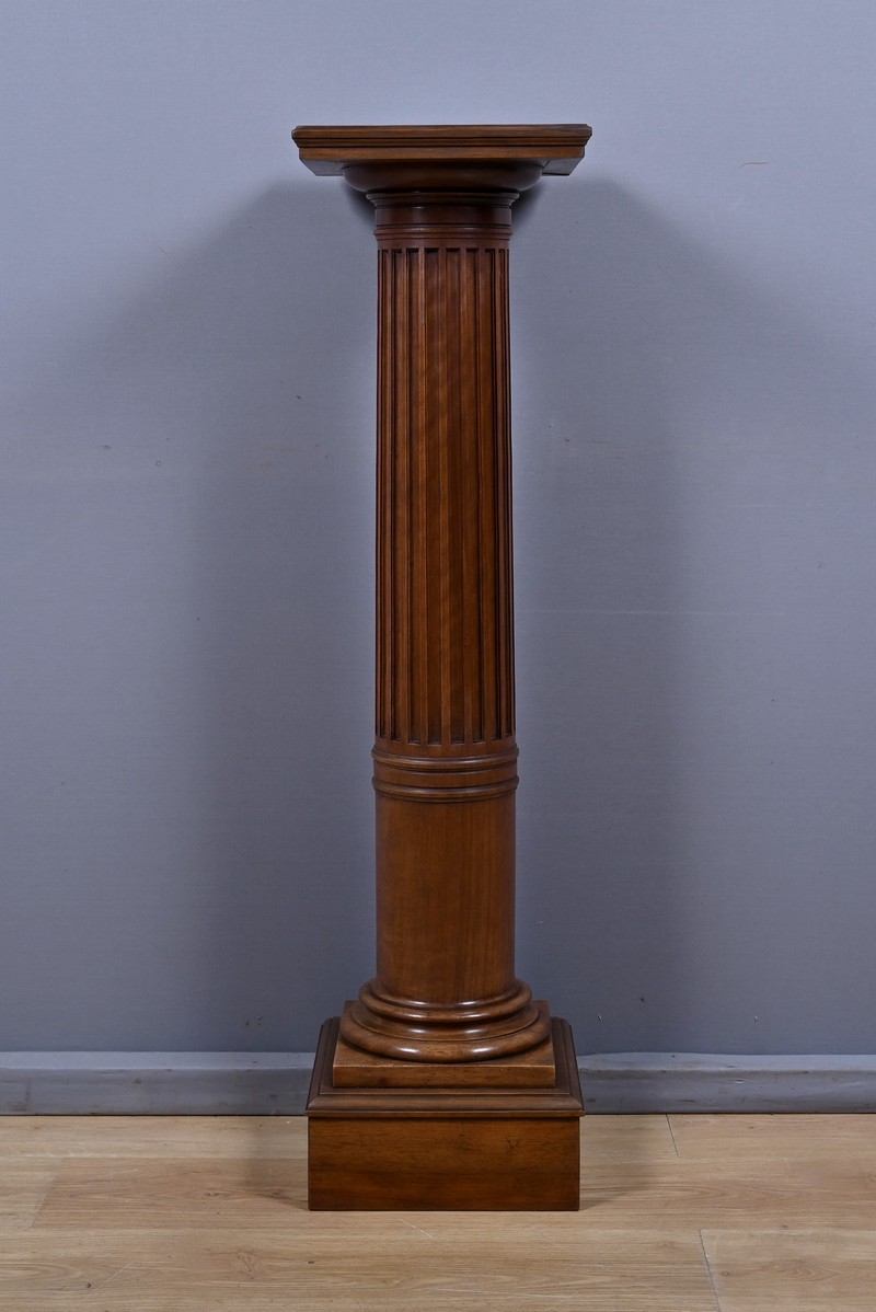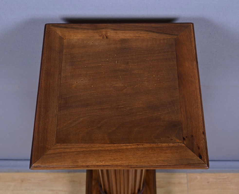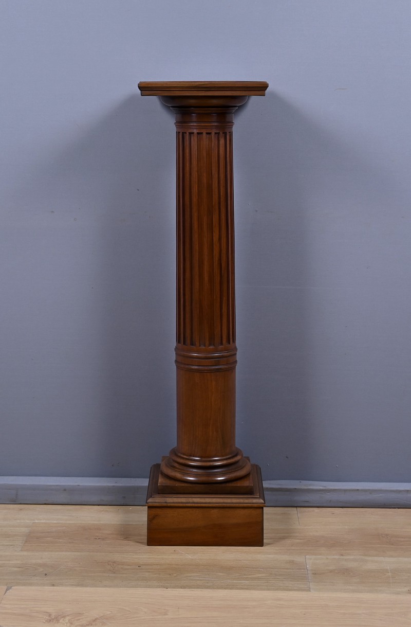 Le noyer, offre une patine chaude et profonde, aux nuances brunes, révélant le veinage noble du bois. La finition témoigne d’un savoir-faire artisanal exigeant, où chaque détail – des cannelures régulières à l’équilibre des proportions – reflète le goût classique hérité de l’architecture antique. Cette pièce, à la fois décorative et fonctionnelle, s’intègre avec élégance dans un intérieur classique, éclectique ou contemporain, apportant une touche de verticalité et de distinction. Elle peut être utilisée comme support d’exposition dans un salon, une galerie ou une entrée, ou détournée en élément scénographique dans une vitrine ou un décor événementiel.