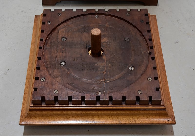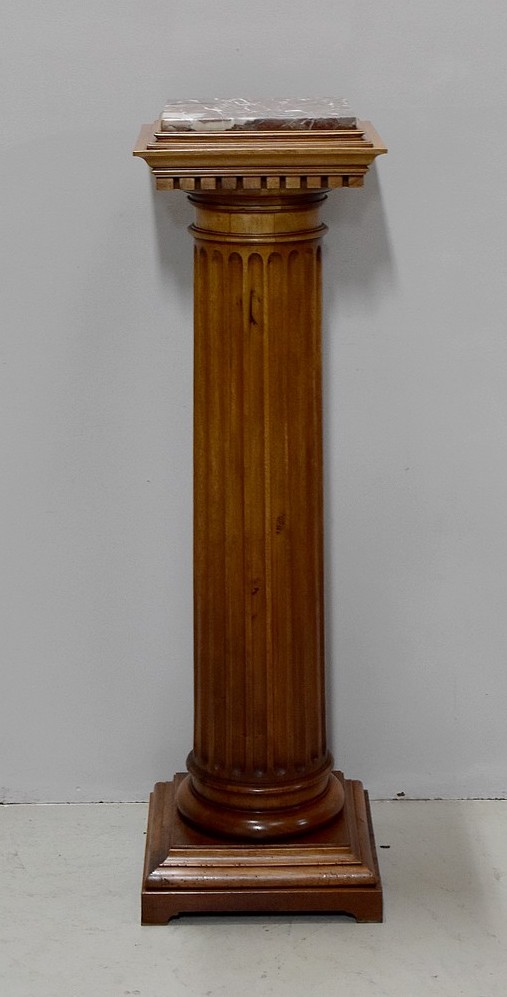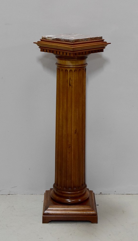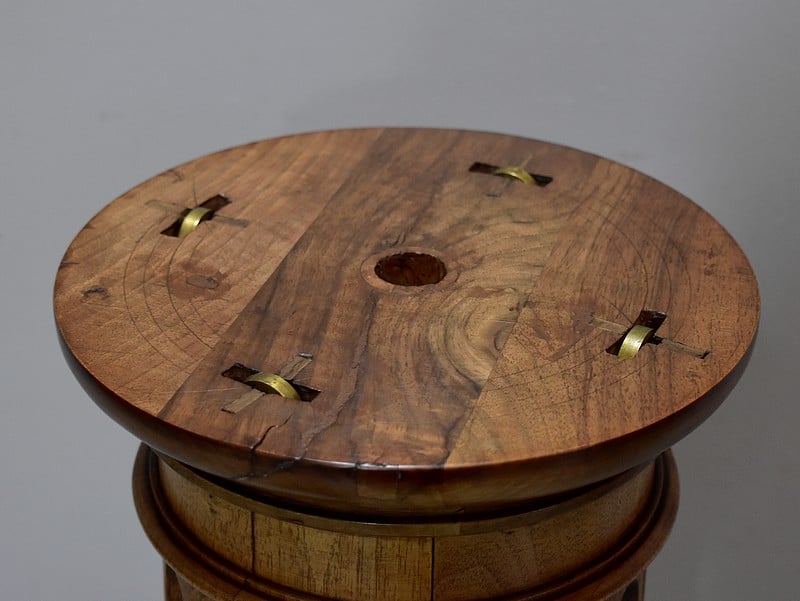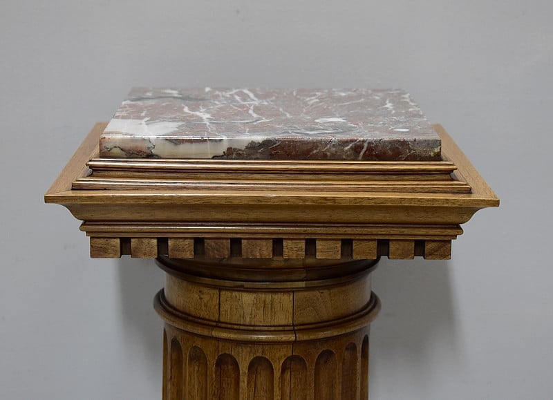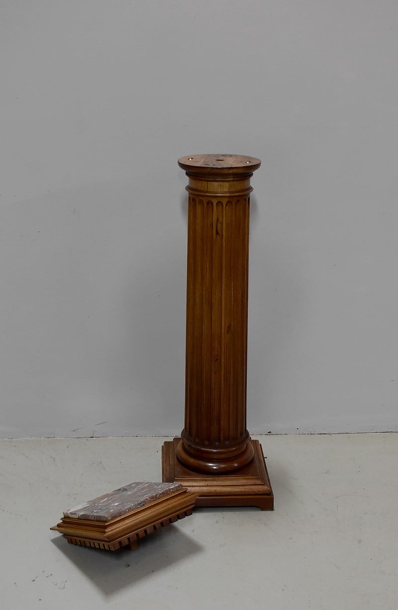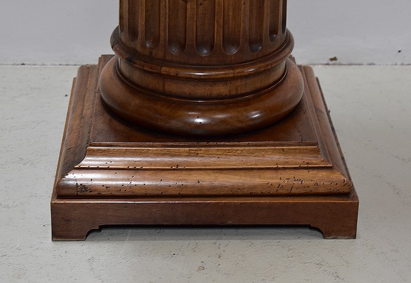 Colonne en Noyer massif à plateau tournant avec dessus en marbre ‘Rose vif des Pyrénées’ encastré.