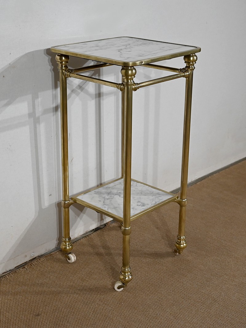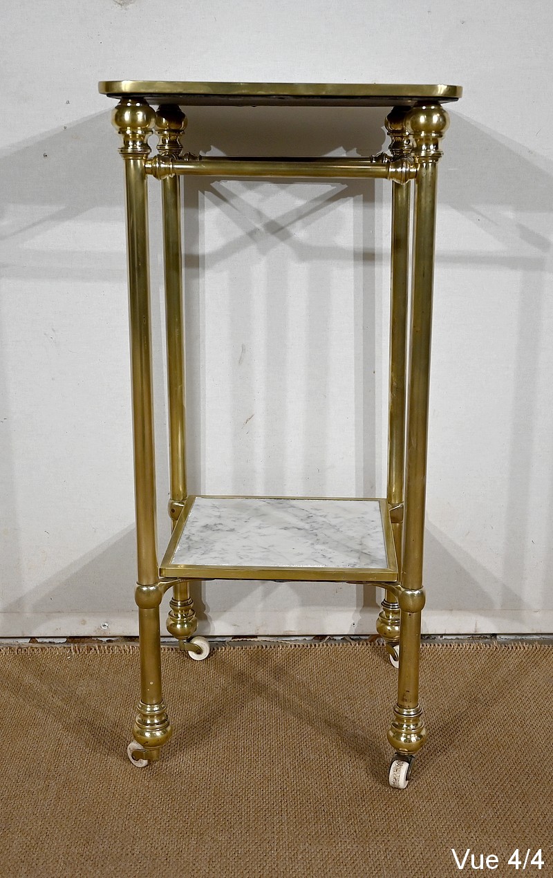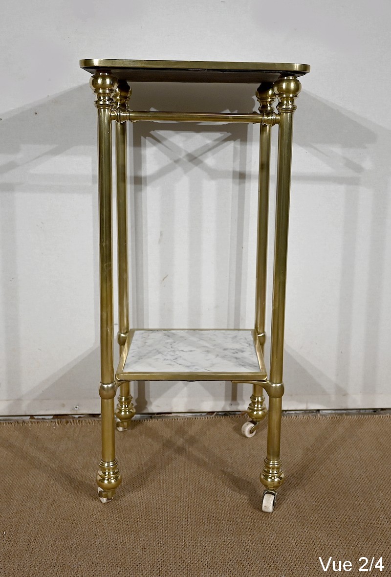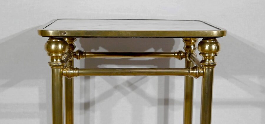 En partie basse et en retrait, un plateau en marbre de plus petite taille est relié aux pieds par des bagues en laiton et apporte un espace de rangement supplémentaire.