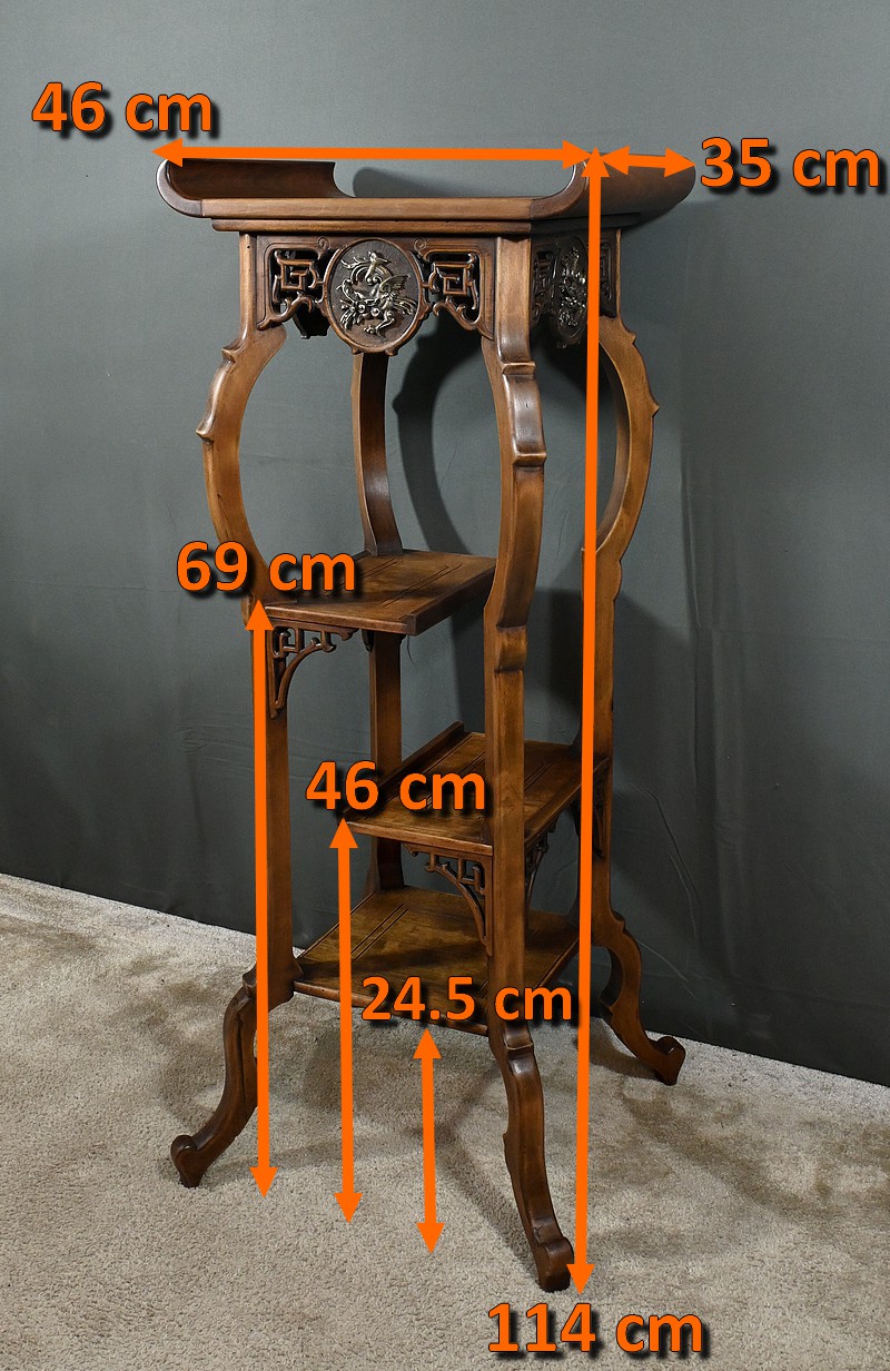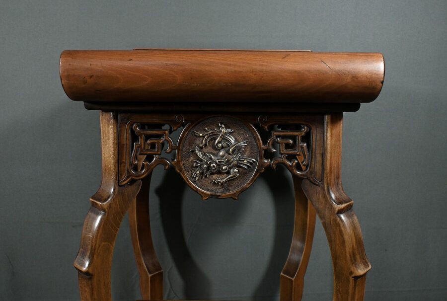 Magnifique sellette haute en hêtre teinté sculpté et ajouré, inspirée des créations de Gabriel Viardot. Inspirée par l’esprit d’Extrême-Orient, cette sellette se distingue par ses tablettes d’entrejambe finement incisées de motifs géométriques et accompagnée de rebords. Ses façades sont agrémentées de grands médaillons en bronze en partie supérieure. Ils représentent chacun un dragon en vol, ajoutant une dimension mystique à ce mobilier. Ce dernier possède des pieds mouvementés et un plateau encastré en marbre griotte de Belgique qui offre une surface lisse et durable, idéale pour mettre en valeur vos objets décoratifs.