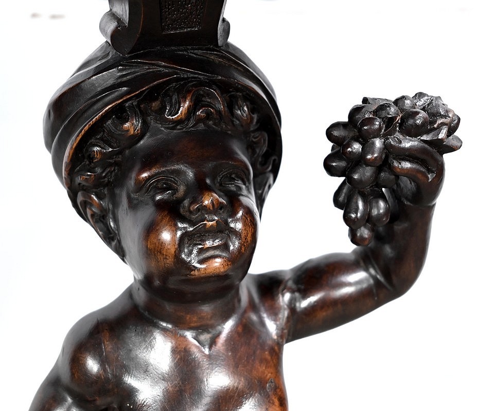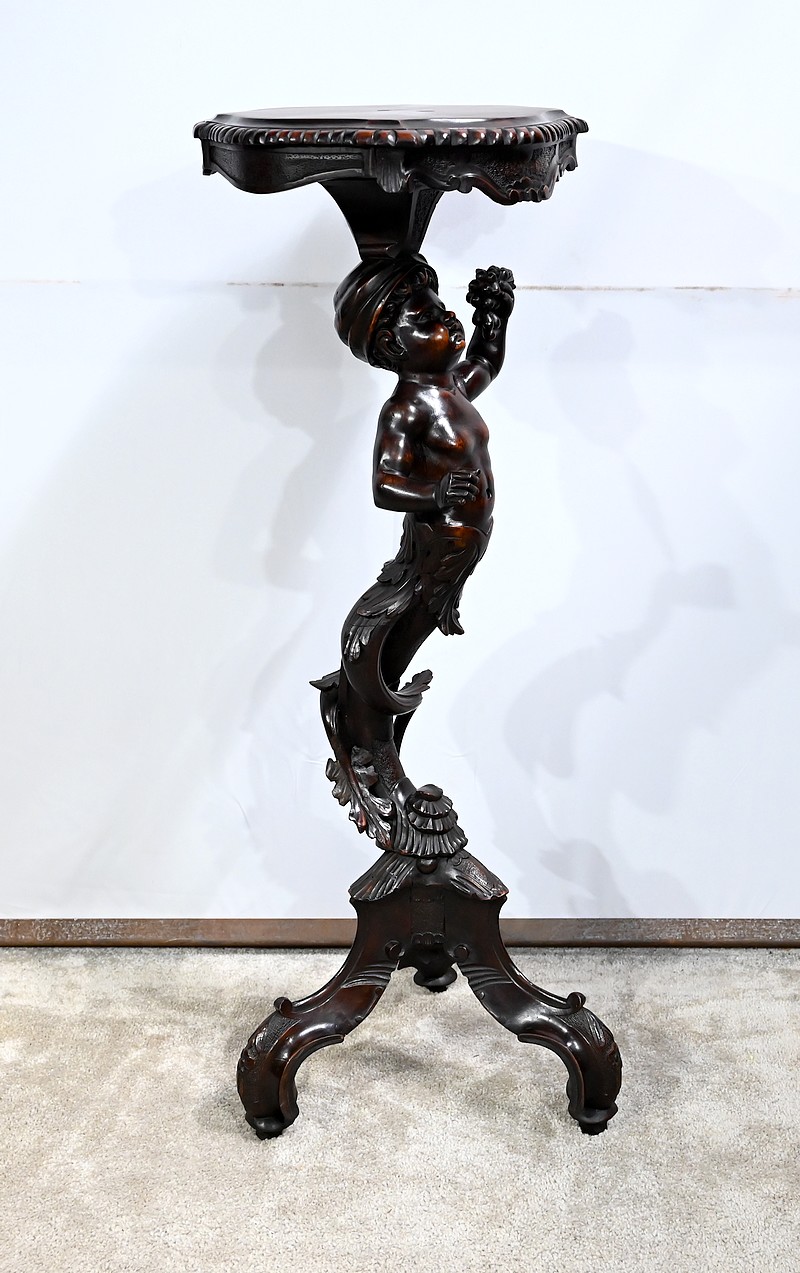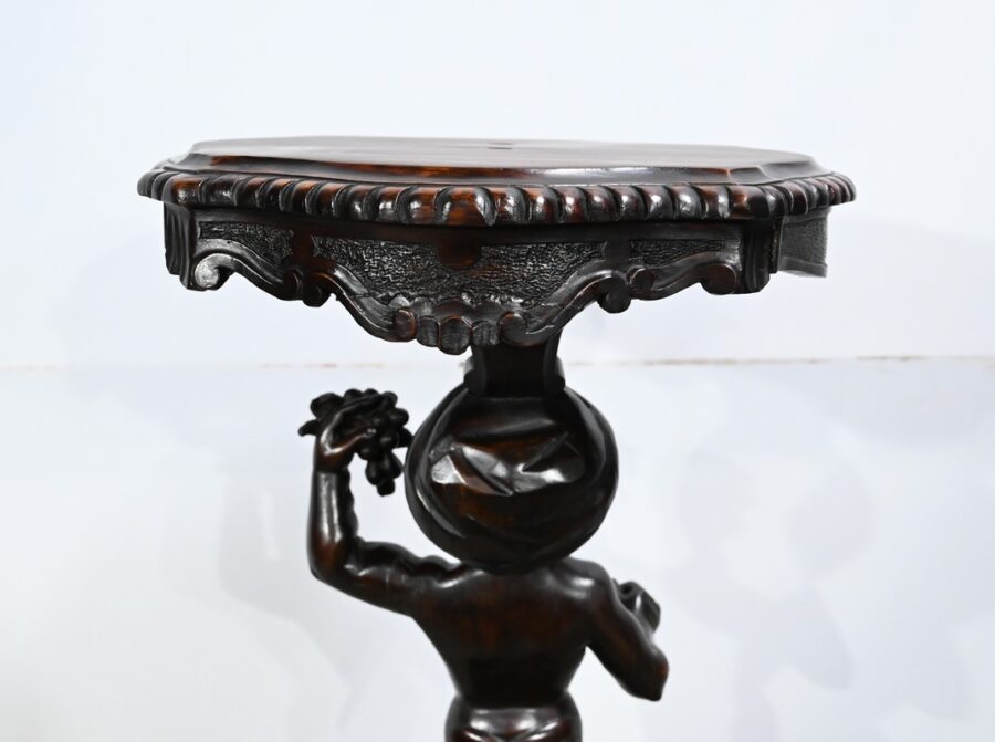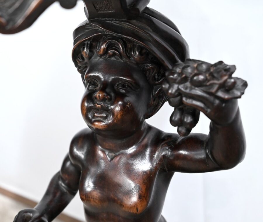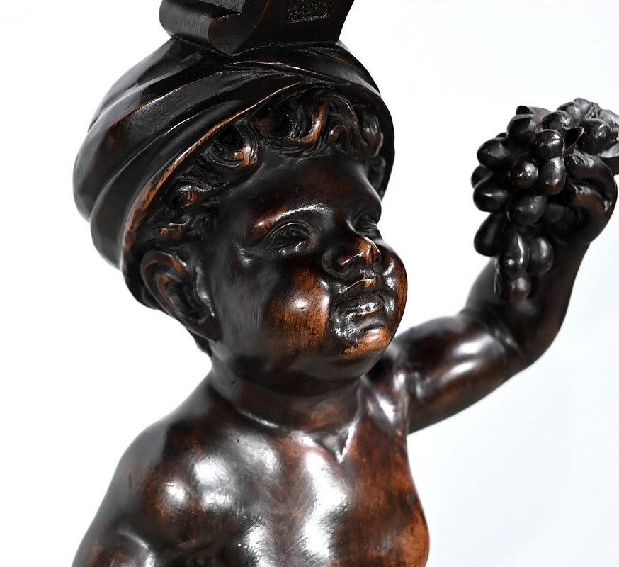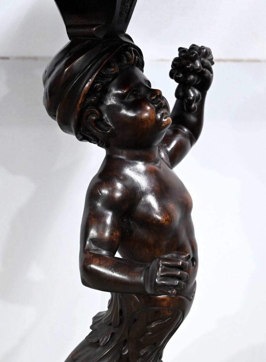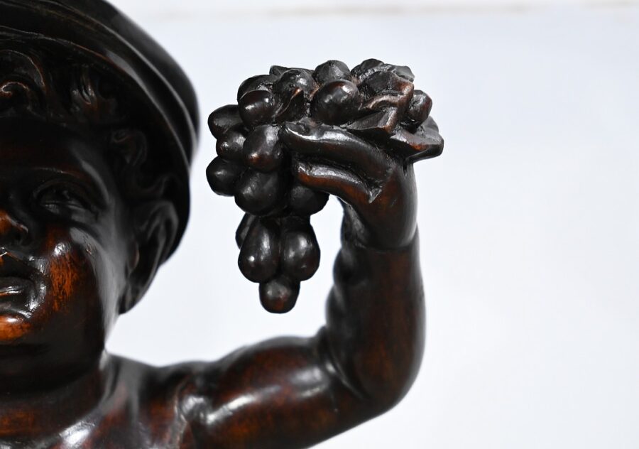 Cette sellette en bois patiné, noirci, possède un dessus à découpe composé d’une gorge et d’une moulure festonnée. En dessous, une petite ceinture mouvementée est composée de volutes sculptées sur un fond granité. Cet ensemble est soutenu par une grande sculpture figurant un enfant « sirène » à queue double. Potelé et joufflu, il tient une grappe de raisin dans sa main gauche et semble la tendre vers son spectateur.