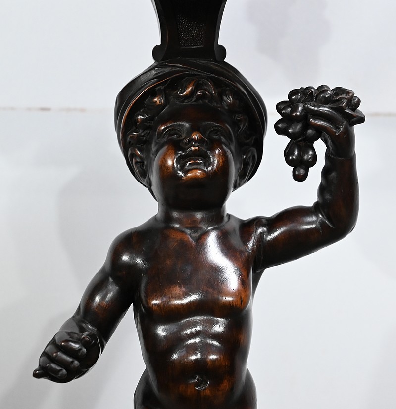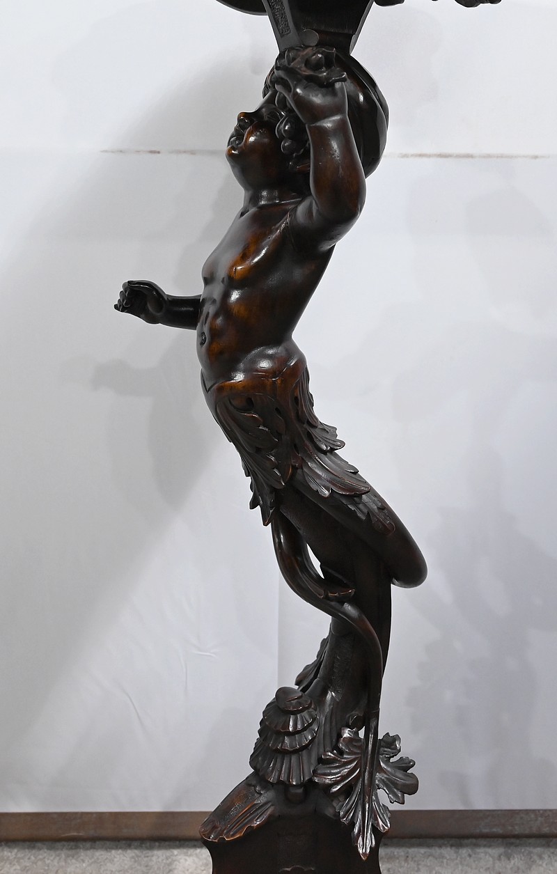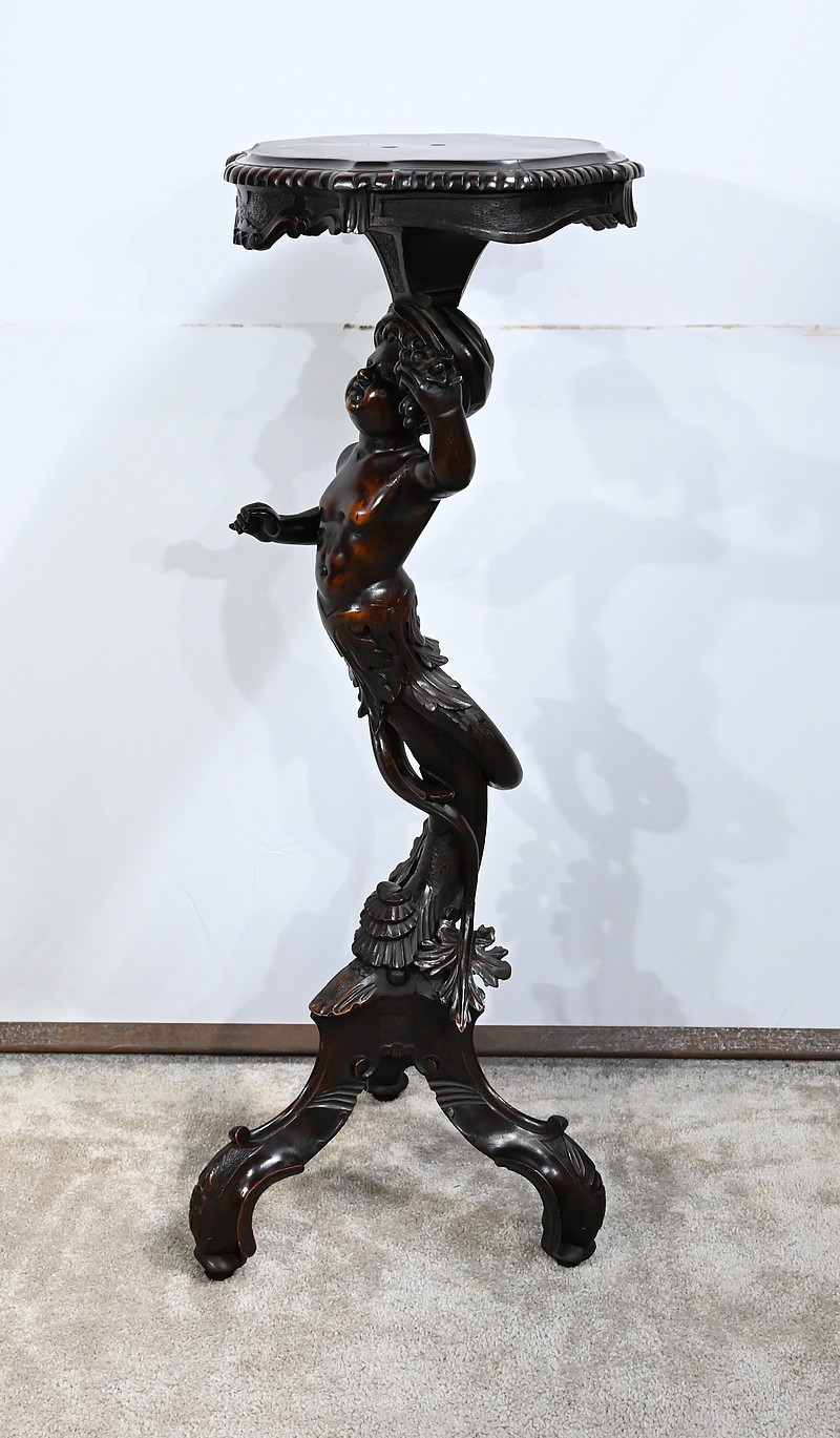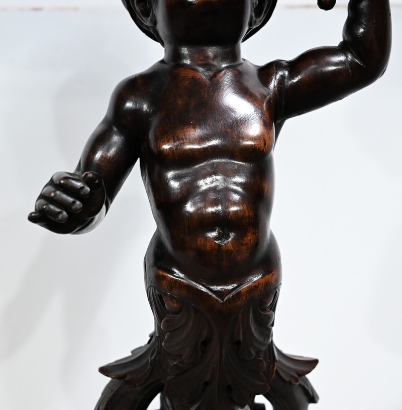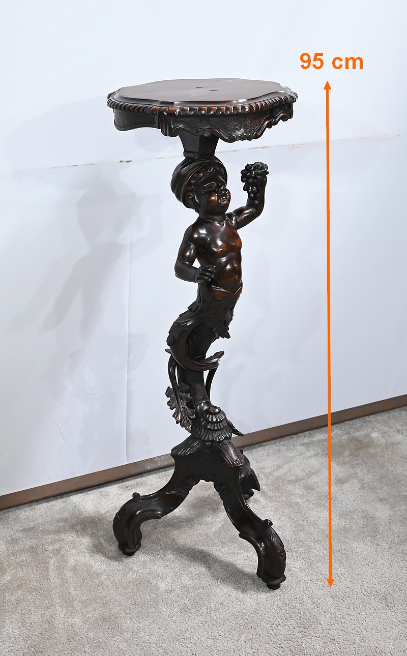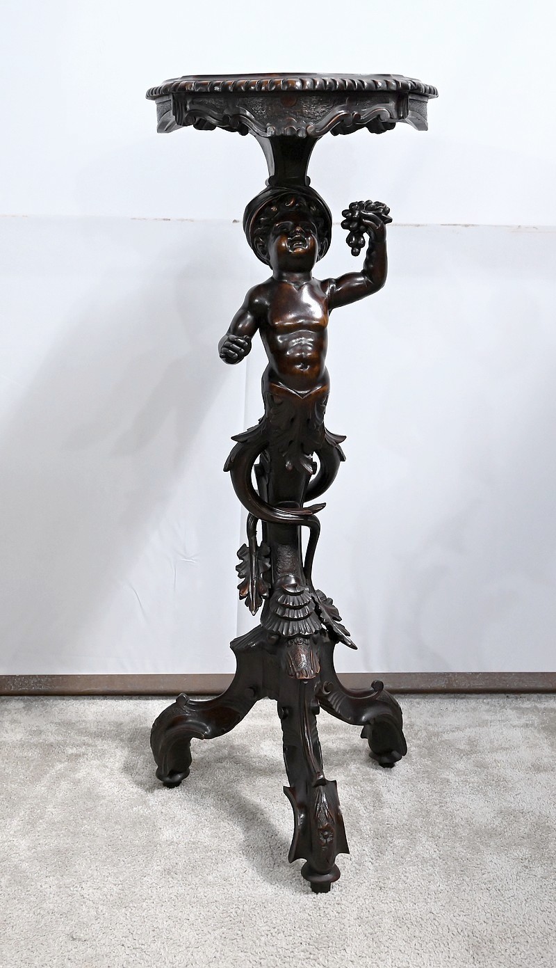 Cette sellette en bois patiné, noirci, possède un dessus à découpe composé d’une gorge et d’une moulure festonnée. En dessous, une petite ceinture mouvementée est composée de volutes sculptées sur un fond granité. Cet ensemble est soutenu par une grande sculpture figurant un enfant « sirène » à queue double. Potelé et joufflu, il tient une grappe de raisin dans sa main gauche et semble la tendre vers son spectateur.