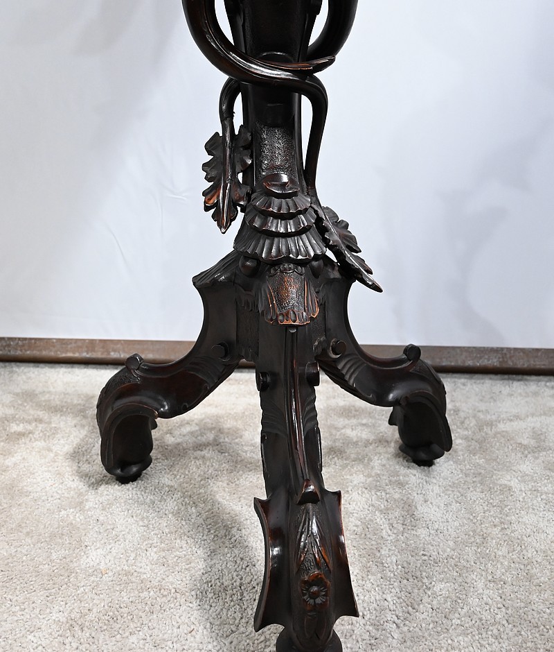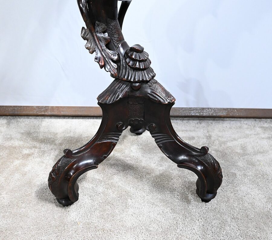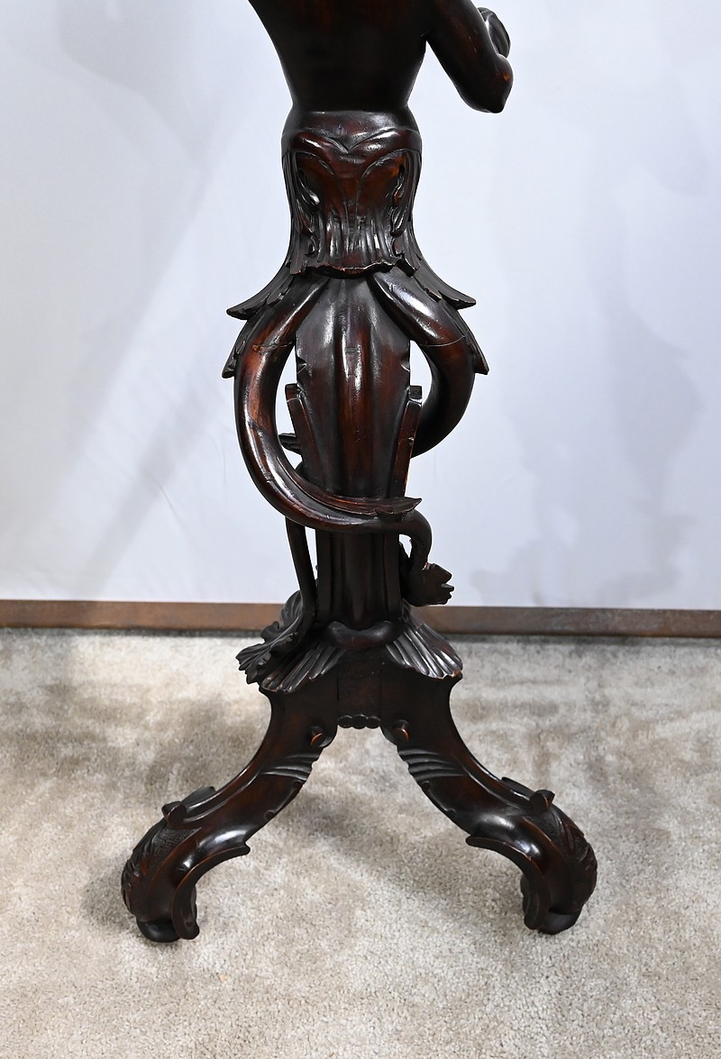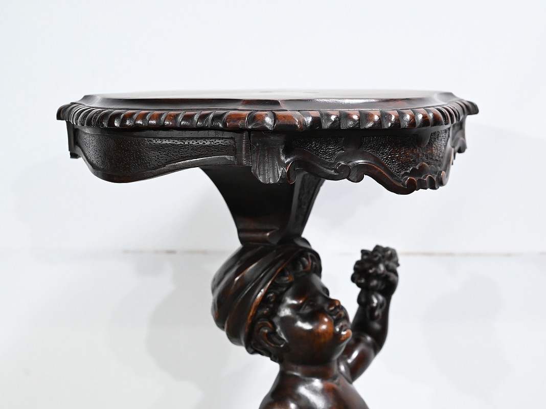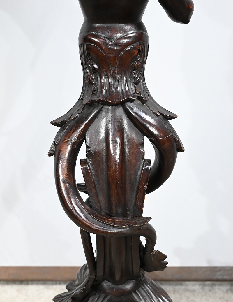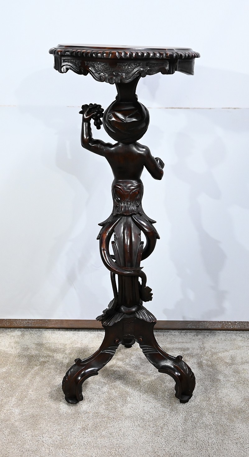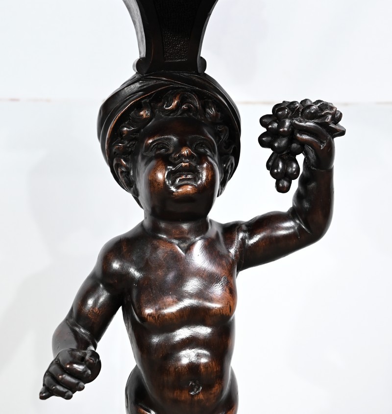 Cette sellette en bois patiné, noirci, possède un dessus à découpe composé d’une gorge et d’une moulure festonnée. En dessous, une petite ceinture mouvementée est composée de volutes sculptées sur un fond granité. Cet ensemble est soutenu par une grande sculpture figurant un enfant « sirène » à queue double. Potelé et joufflu, il tient une grappe de raisin dans sa main gauche et semble la tendre vers son spectateur.