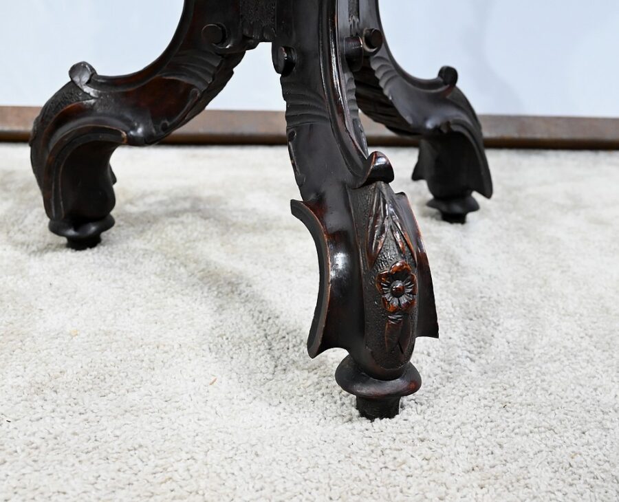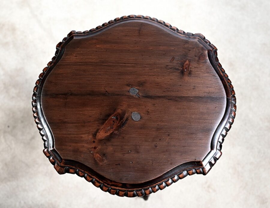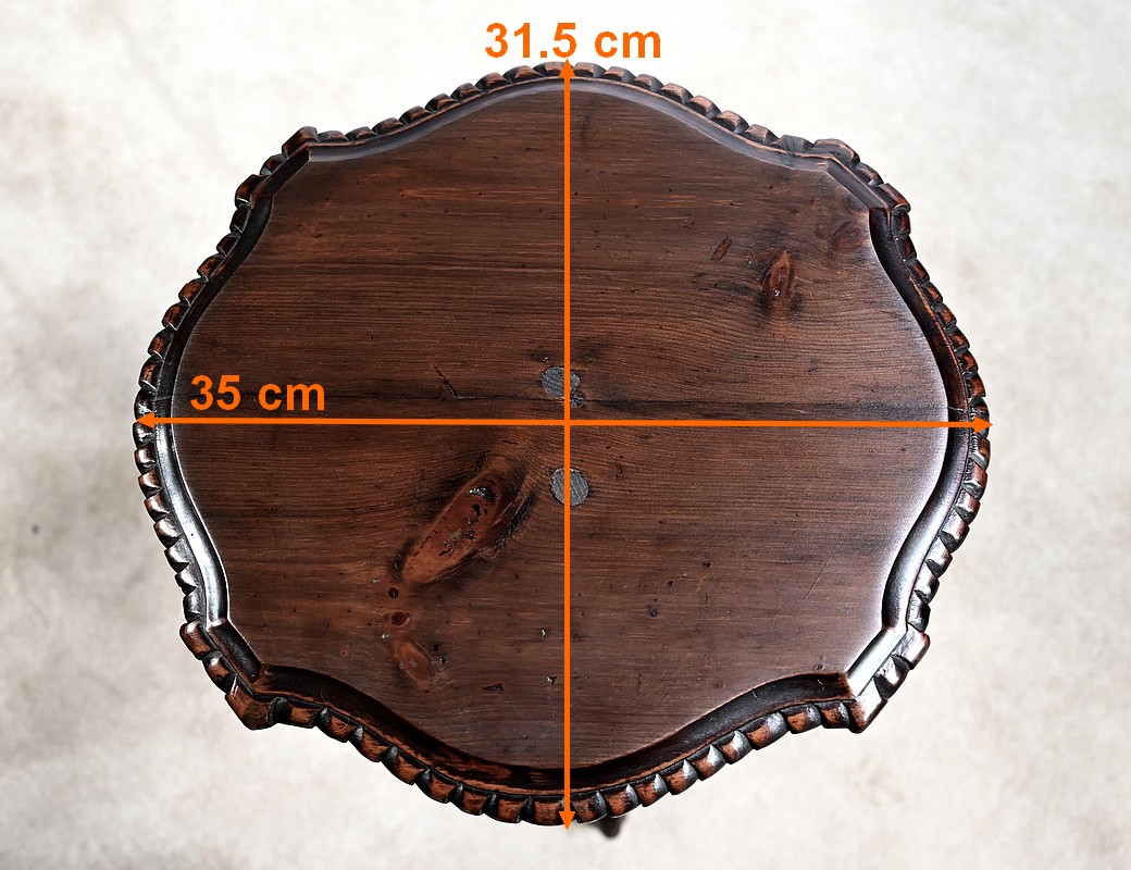 Cette sellette repose sur un large pied tripode mouluré et sculpté d’une large coquille en partie haute, de volutes et de fleurs en partie basse.