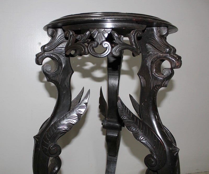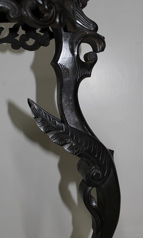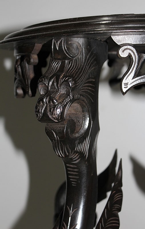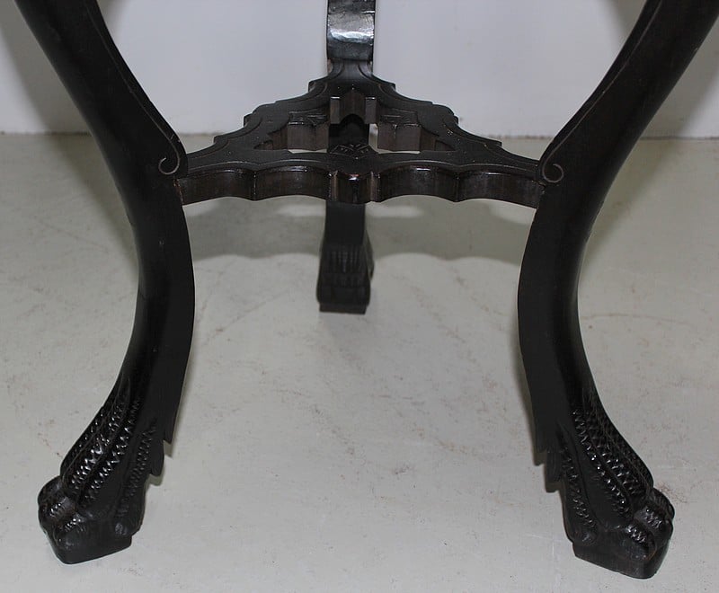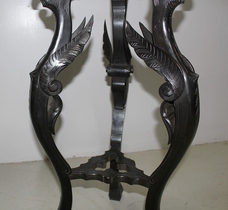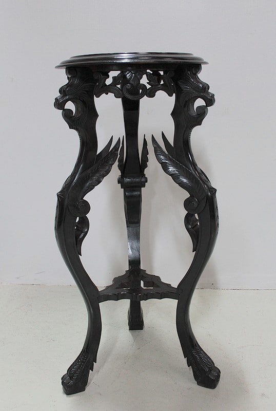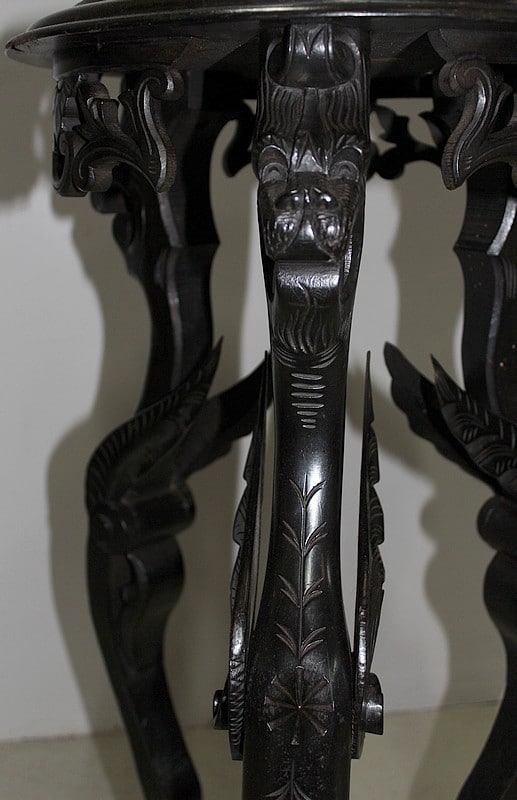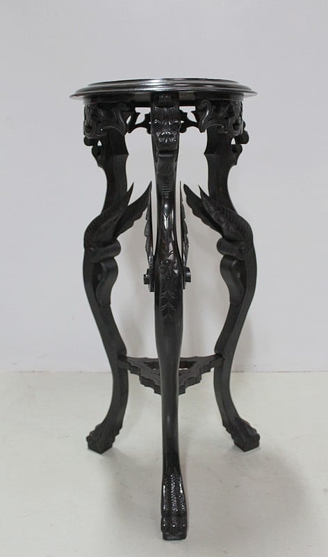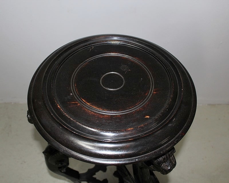Sellette en bois noirci reposant sur 3 pieds galbés à décors de Sphinges : Têtes de lions en partie haute, ailes d’oiseau et pieds en pattes de lion en partie basse.