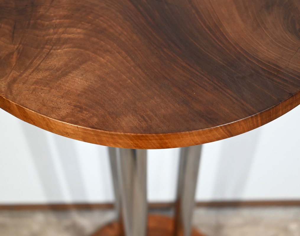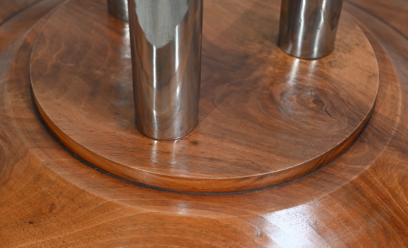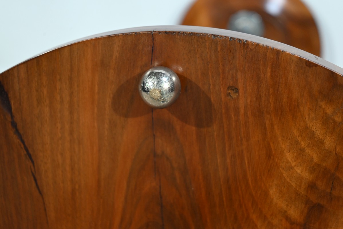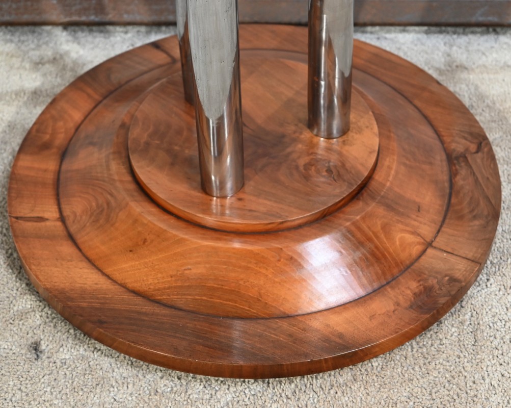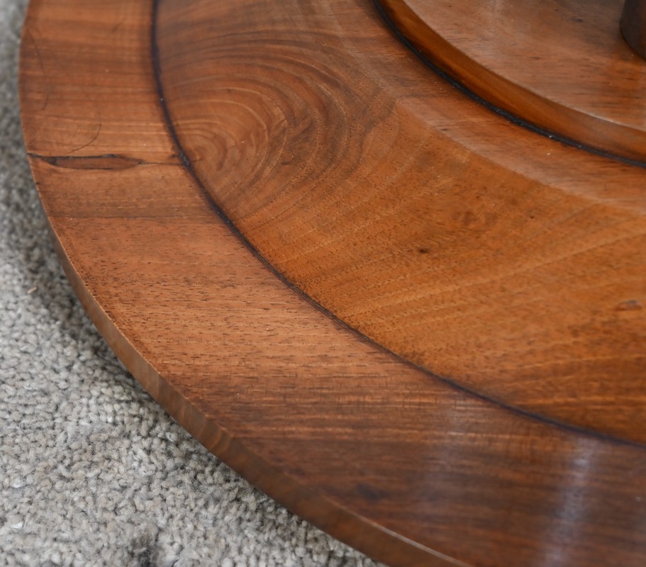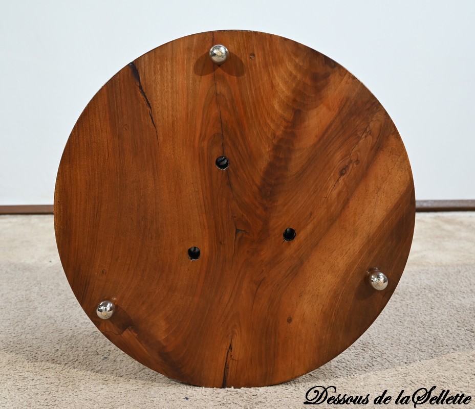 Cette sellette* présente un dessus circulaire en un seul élément de ronce de noyer reposant sur une partie en pan coupé.