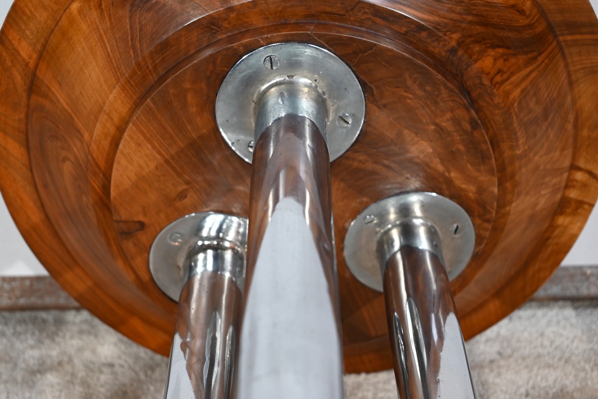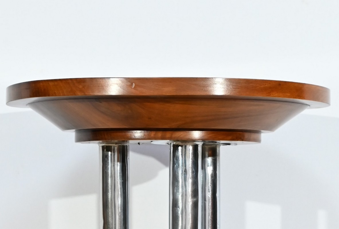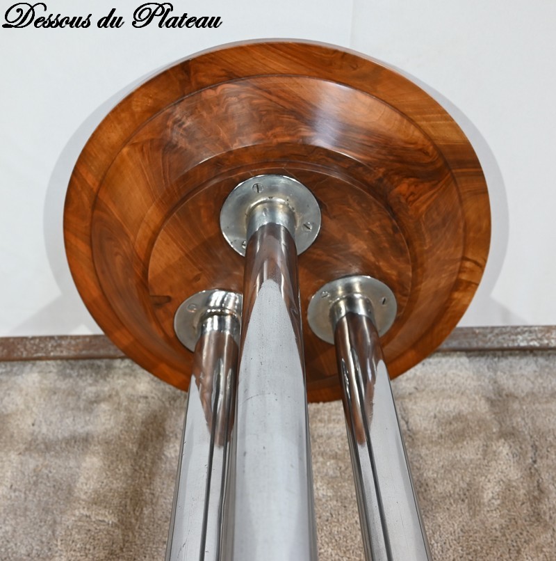 Ce plateau se profile par trois tubes en métal chromé se terminant sur un socle rond à plusieurs dégradés.