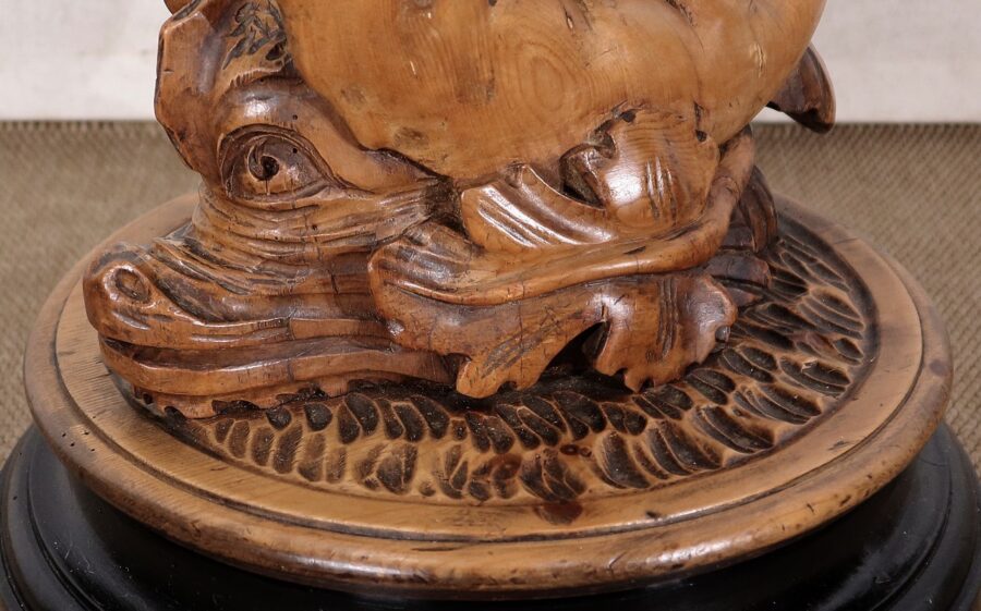 Cette sellette se remarque par son fût sculpté inusuel, représentant la longue queue d’un dauphin dont la tête est chevauchée par un chérubin. Cette queue ressemble à une branche sinueuse décorée de feuilles d’acanthe.