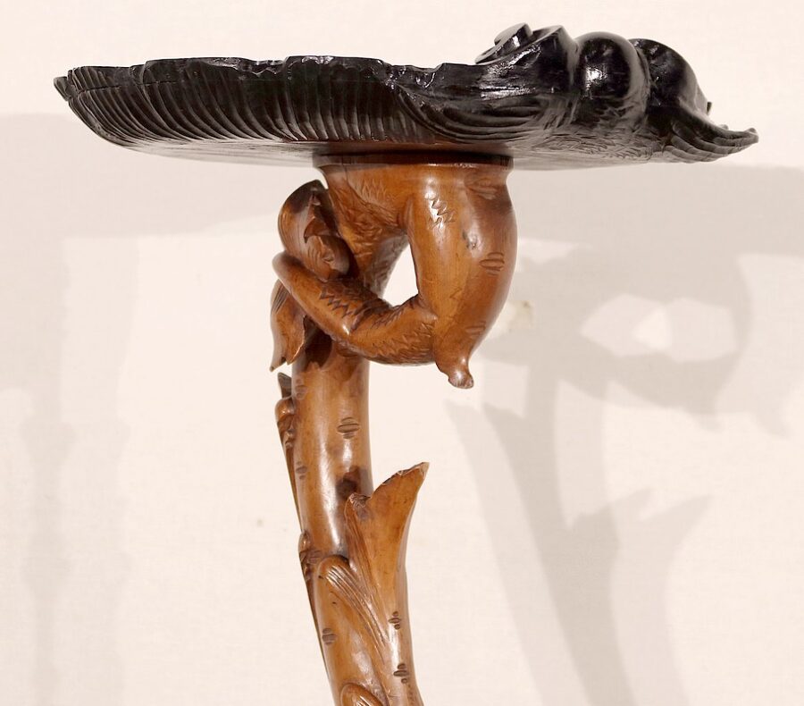 Charmante sellette dans le goût Napoléon III, sommée d’un plateau en bois noirci, travaillé en forme de coquille St Jacques, et pourvue d’une base ronde, également en bois noirci, agrémentée de moulurations et reposant sur des pieds galette.