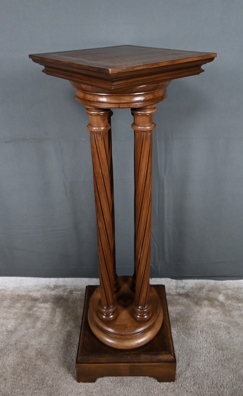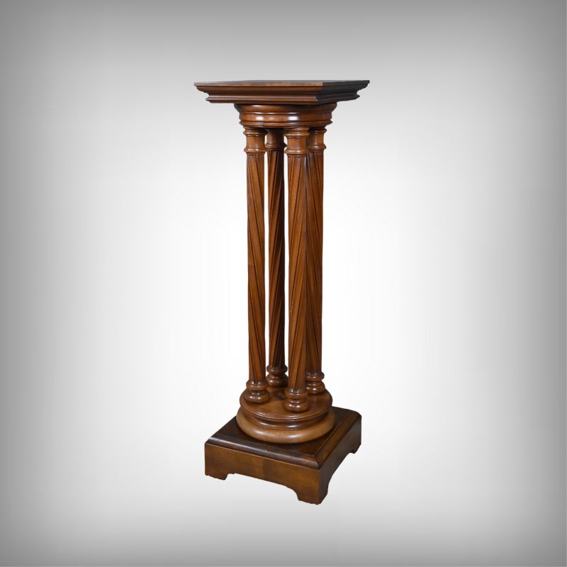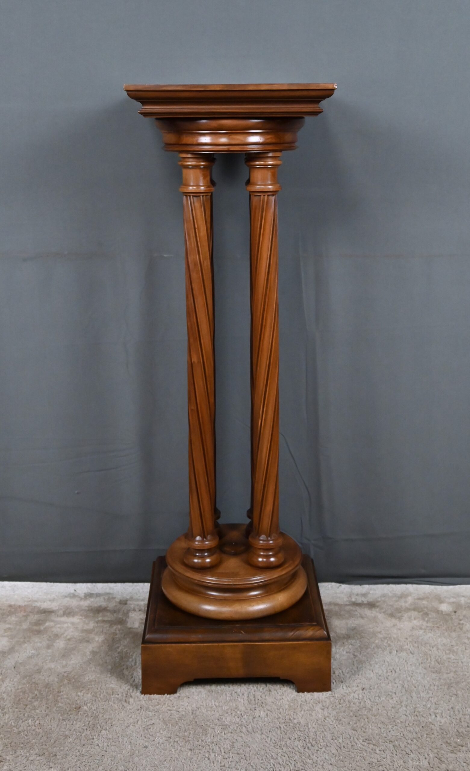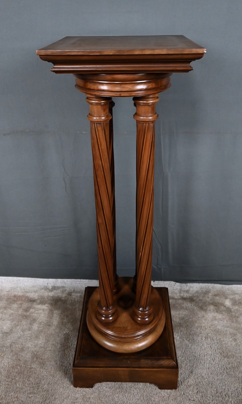 Élégante et singulière, cette sellette en noyer se distingue par son plateau supérieur tournant, posé sur quatre fûts torsadés. Ces colonnettes, finement sculptées, créent un jeu de lignes dynamiques qui anime la silhouette de la pièce et témoignent d’un savoir‑faire artisanal précis. Les fûts prennent appui sur un support circulaire, lui‑même solidement ancré sur une base carrée soulignée en son pourtour d’un quart de rond renversé. L’ensemble offre une une architecture raffinée. Le noyer chaleureux révèle un veinage élégant mis en valeur par une belle patine. Cette sellette néo-gothique, à la fois décorative et fonctionnelle, constitue un support idéal pour une sculpture, un vase ou tout objet d’art, tout en apportant une note classique et intemporelle à un intérieur.