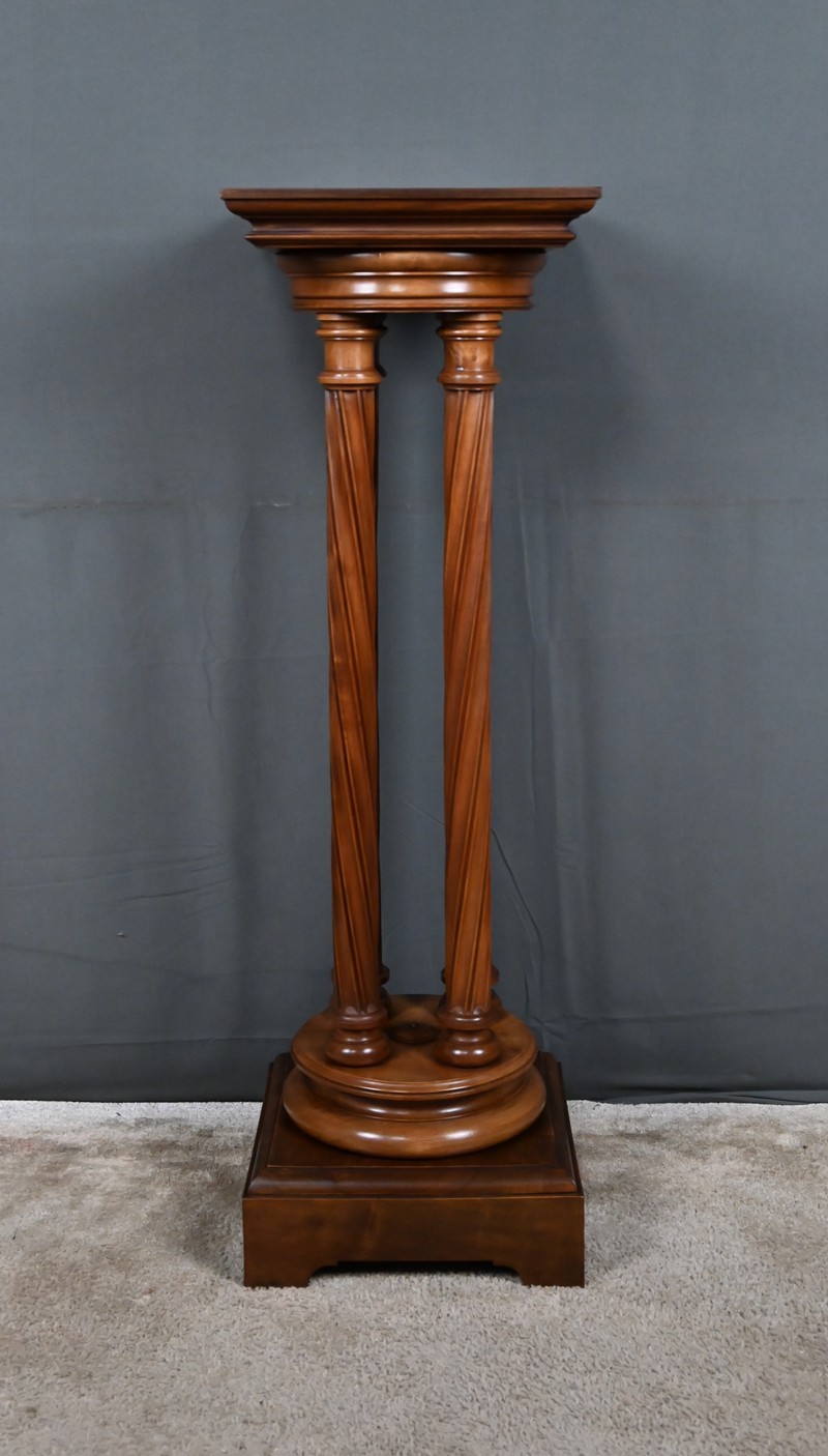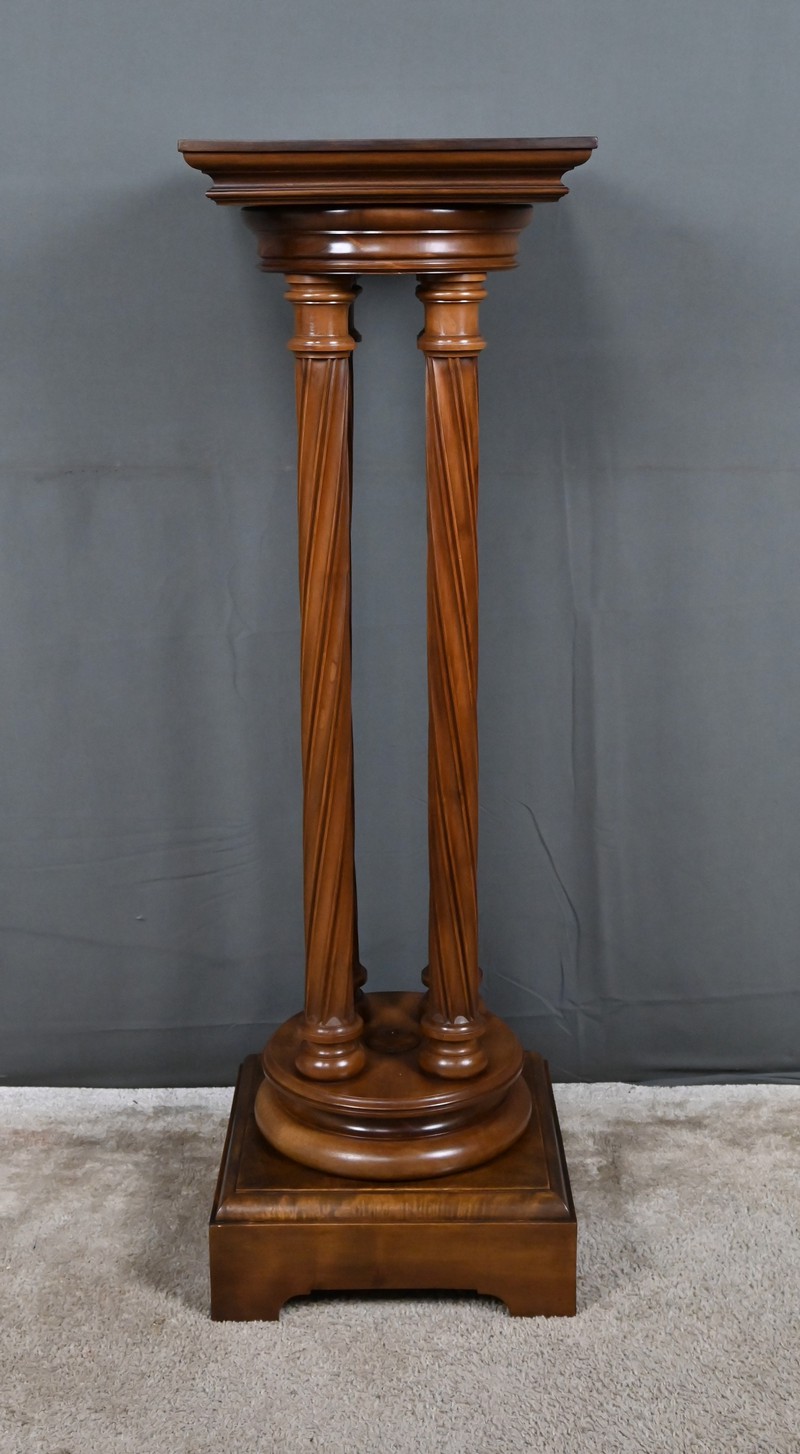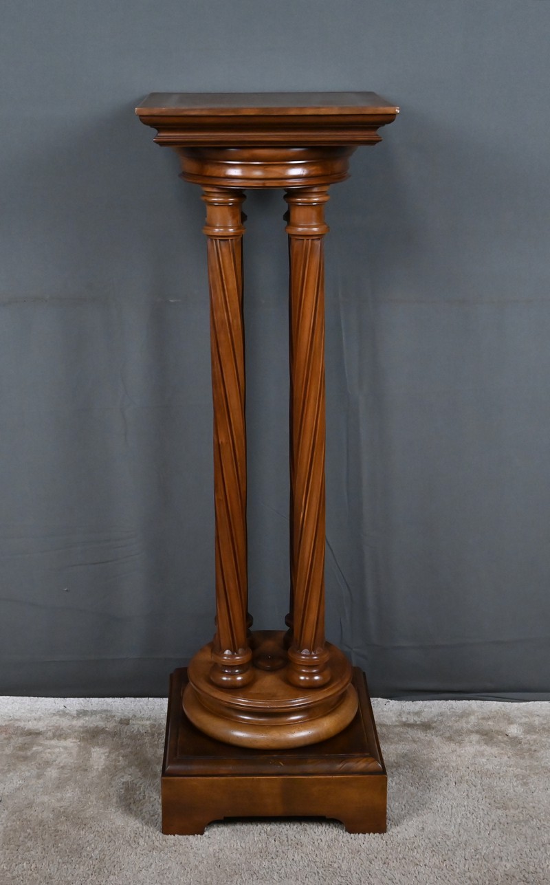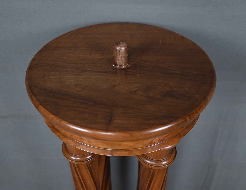 Élégante et singulière, cette sellette en noyer se distingue par son plateau supérieur tournant, posé sur quatre fûts torsadés. Ces colonnettes, finement sculptées, créent un jeu de lignes dynamiques qui anime la silhouette de la pièce et témoignent d’un savoir‑faire artisanal précis. Les fûts prennent appui sur un support circulaire, lui‑même solidement ancré sur une base carrée soulignée en son pourtour d’un quart de rond renversé. L’ensemble offre une une architecture raffinée. Le noyer chaleureux révèle un veinage élégant mis en valeur par une belle patine. Cette sellette néo-gothique, à la fois décorative et fonctionnelle, constitue un support idéal pour une sculpture, un vase ou tout objet d’art, tout en apportant une note classique et intemporelle à un intérieur.