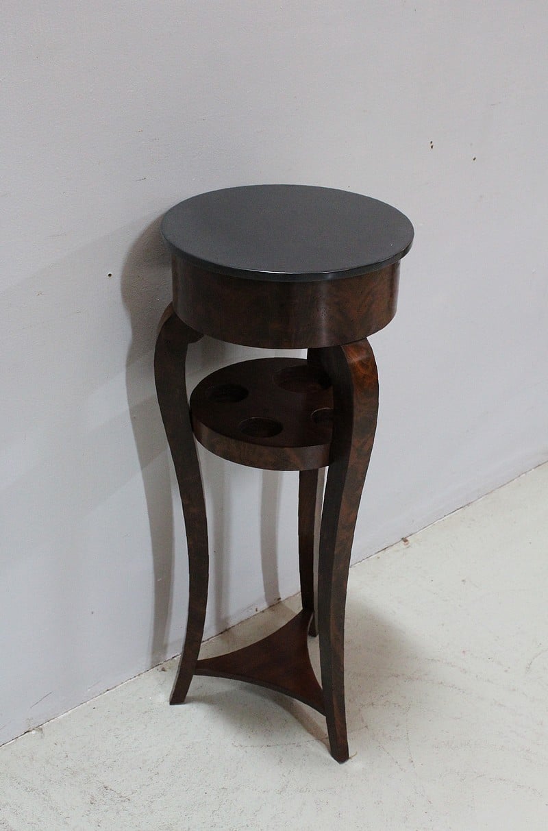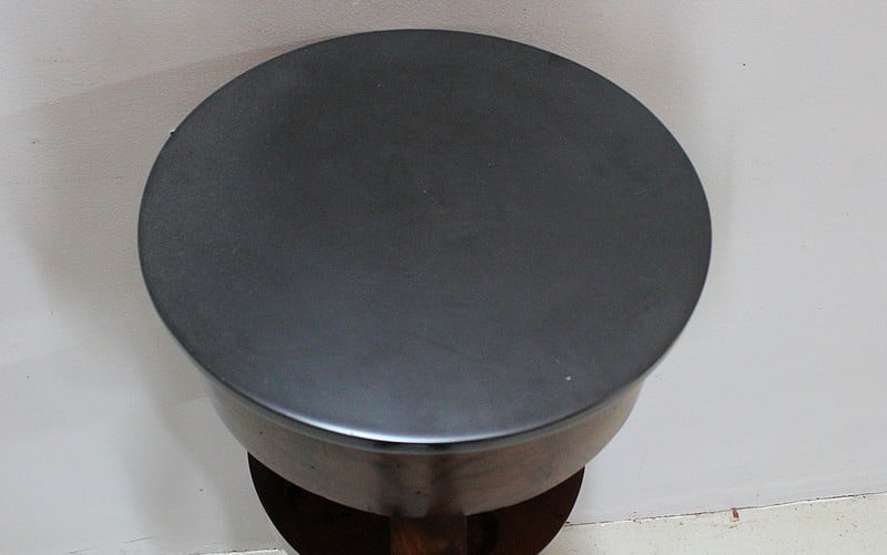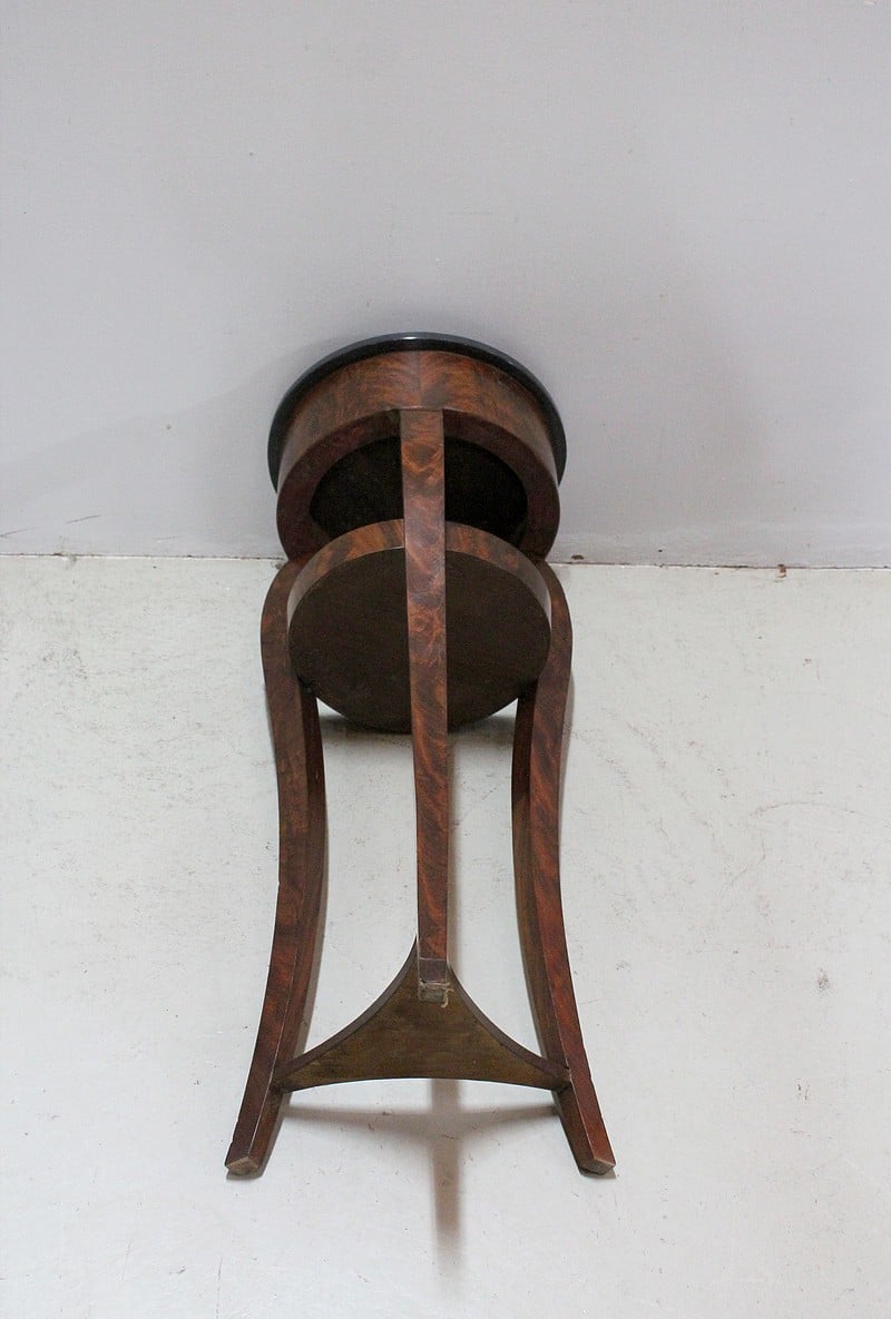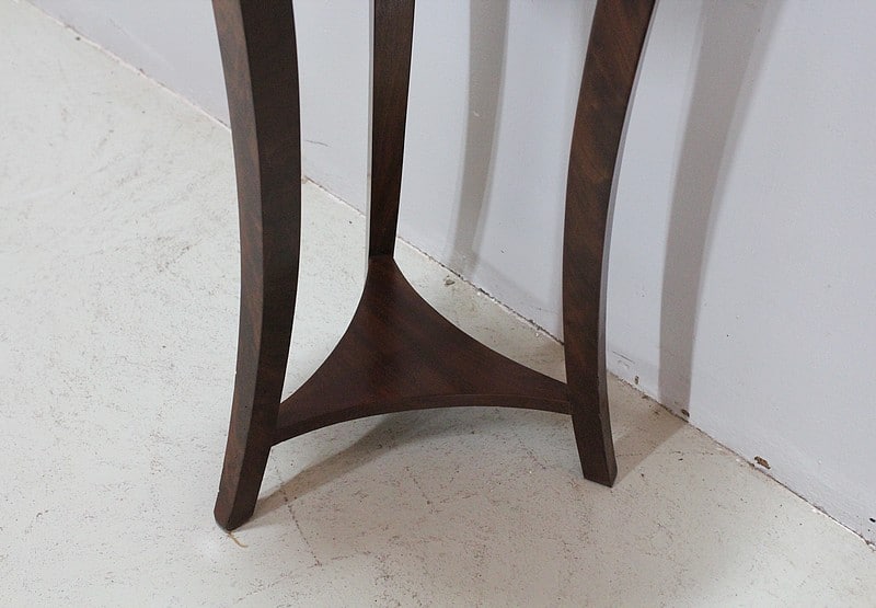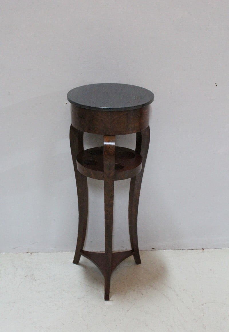 Sellette Restauration en placage d’Acajou qui est une ancienne barbière, avec son dessus refait en Ardoise.Elle dispose en dessous d’un plateau d’entretoise épais creusé de 4 emplacements circulaires.