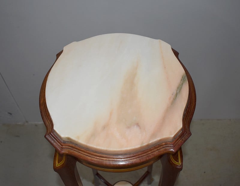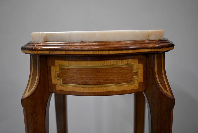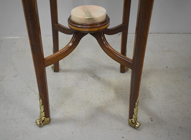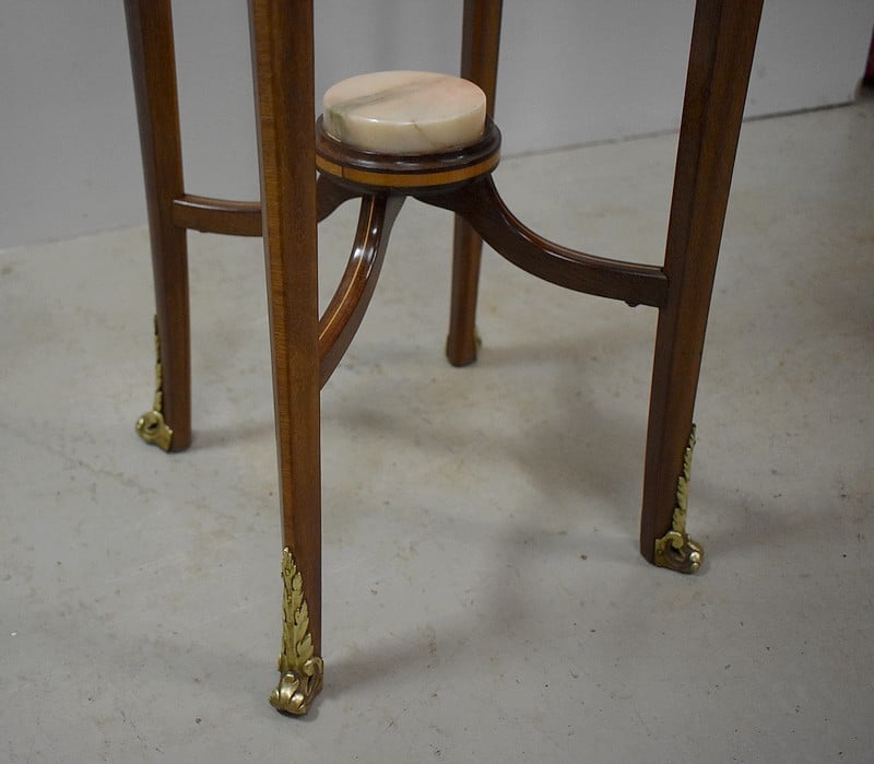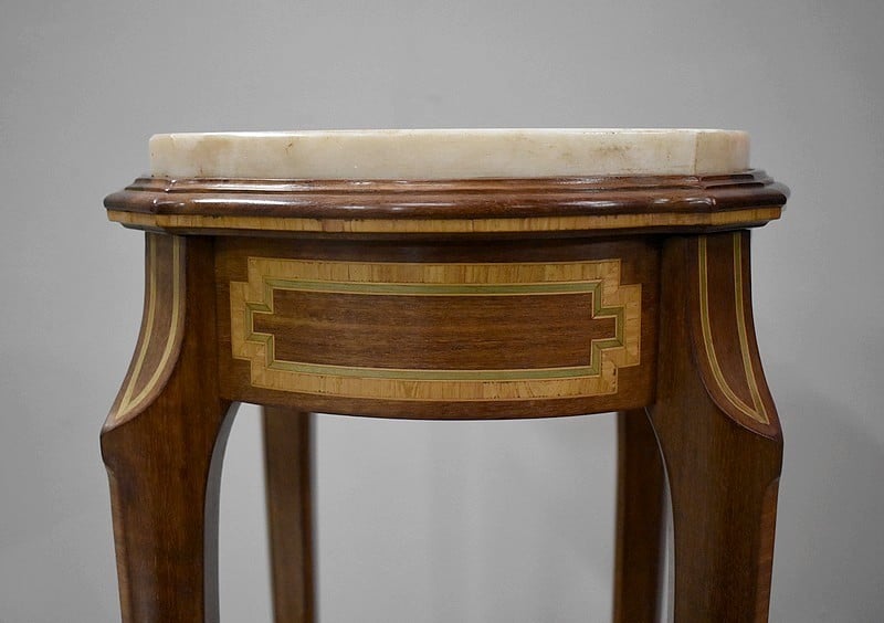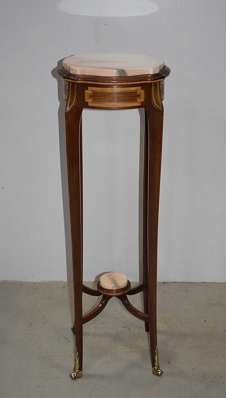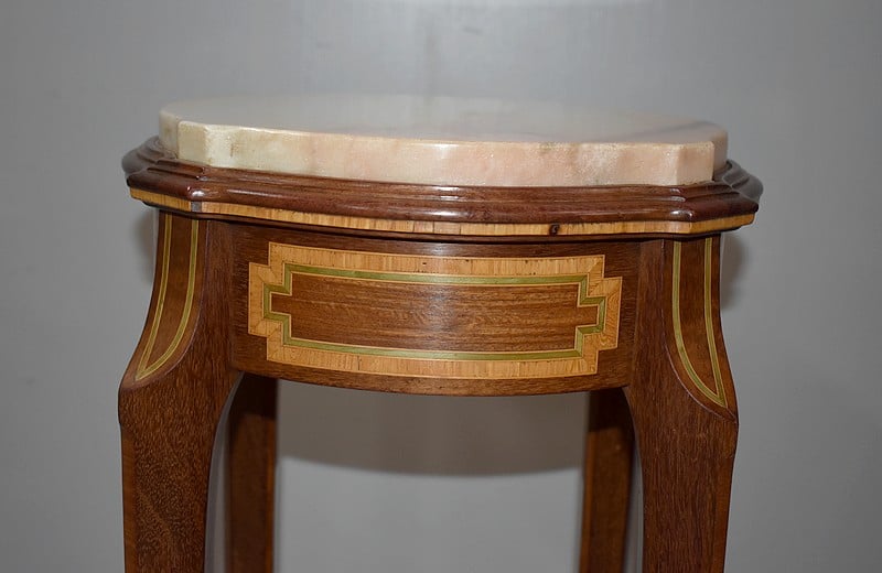 Élégante Sellette de style Transition Louis XV / Louis XVI en Acajou massif et placage d’acajou, avec incrustations de bois de rose et citronnier avec filets de bois teintés de couleur verte.