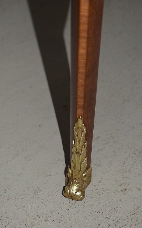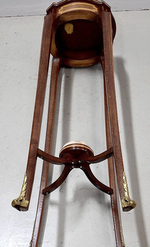 Elle repose sur 4 pieds entretoisés en partie basse et terminés par des sabots de bronze. L’entretoise est ornée d’un marbre cylindrique rappelant celui du plateau.