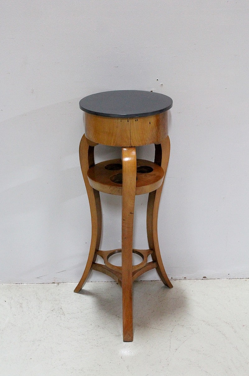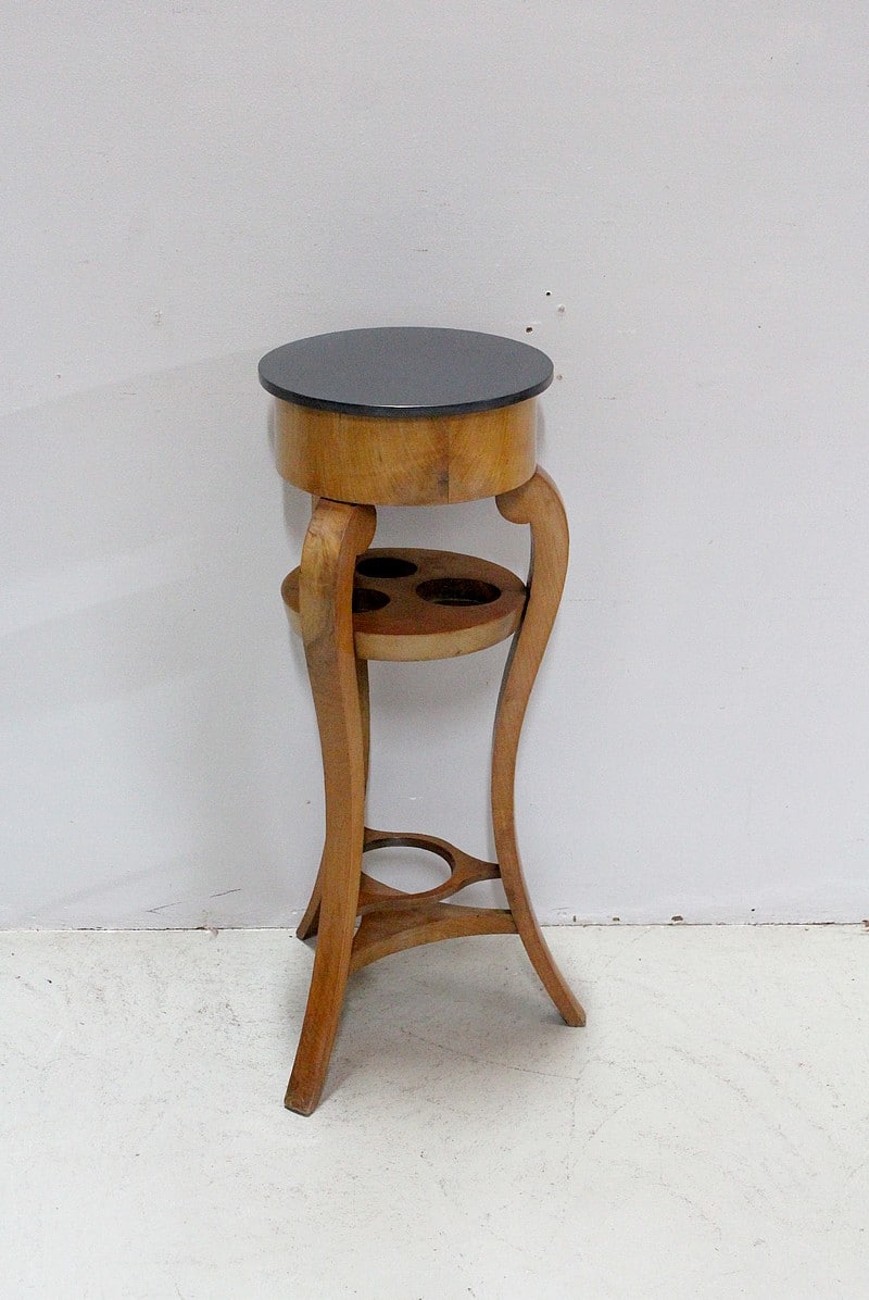 Sellette tripode, ancienne barbière, Restauration en Merisier massif.Son plateau du dessus refait est en ardoise.Elle dispose en dessous d’un plateau doté de 3 emplacements circulaires et est doublement entretoisée en partie basse.Elle repose sur 3 pieds découpés et galbés.