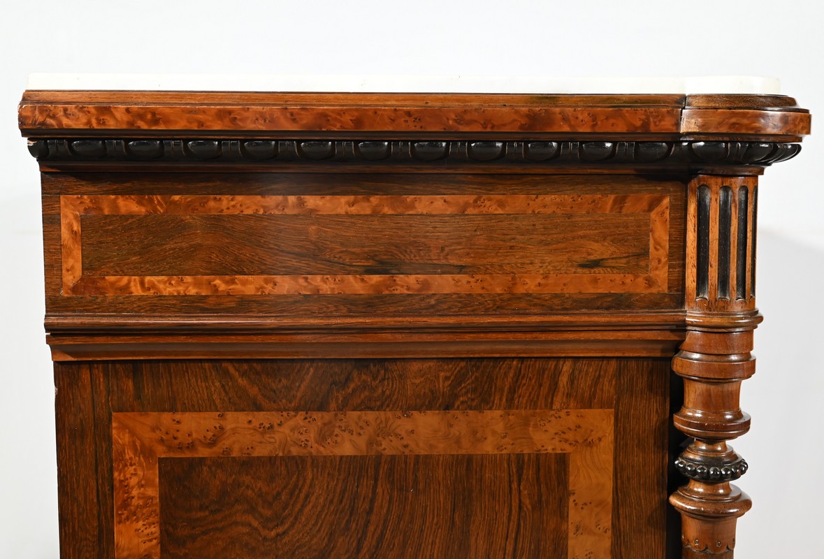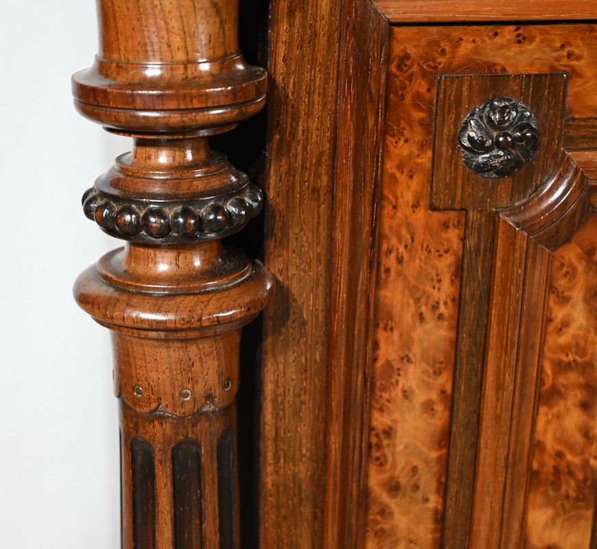 La partie basse présente une double porte en placage d’amboine, avec panneaux centraux, également mise en valeur par une bande de palissandre, de baguettes moulurées et de rosaces.