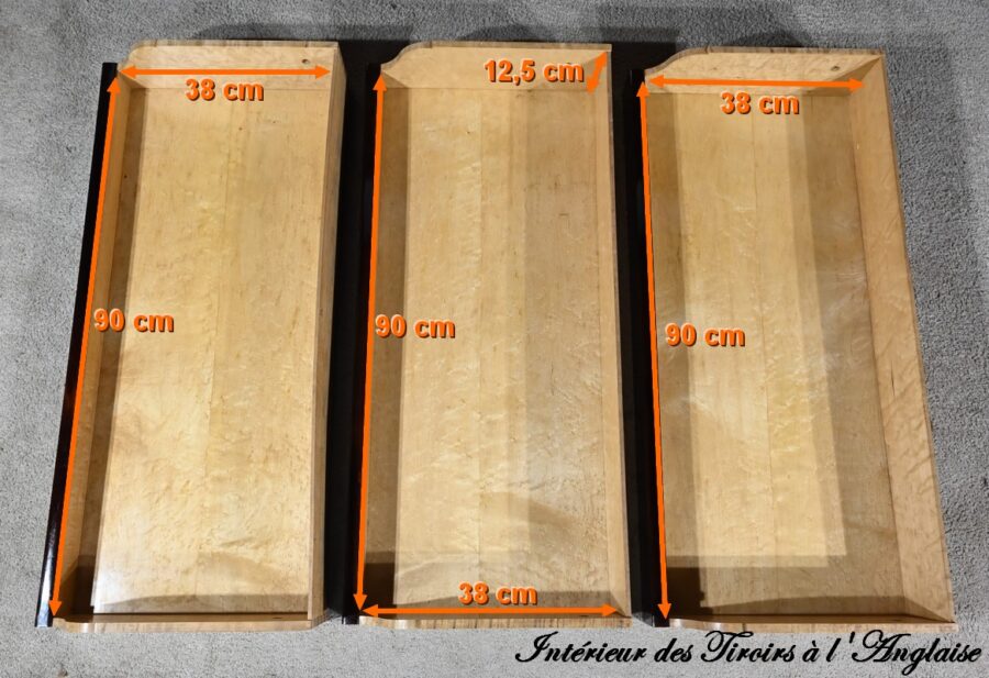 L’intérieur offre trois tiroirs à l’anglaise en moucheté d’érable avec façade en palissandre.