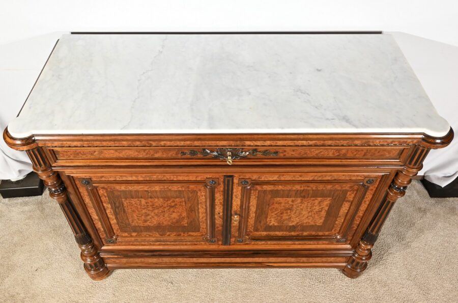 Le bâti, le parquet sous marbre et l’arrière sont en chêne.