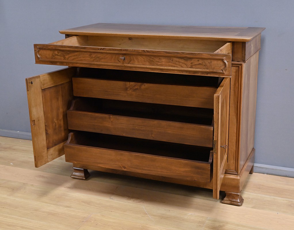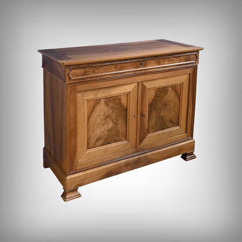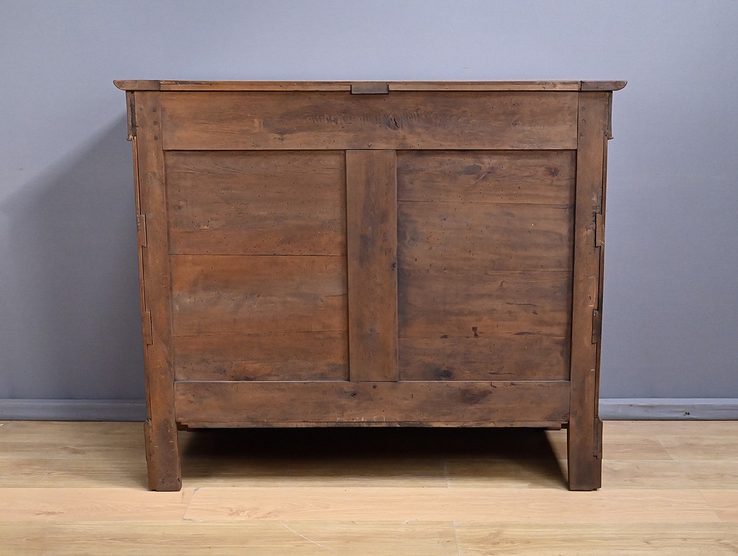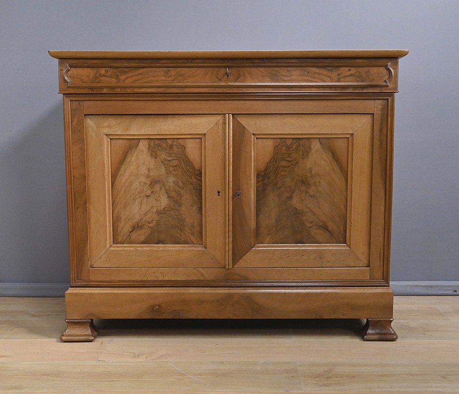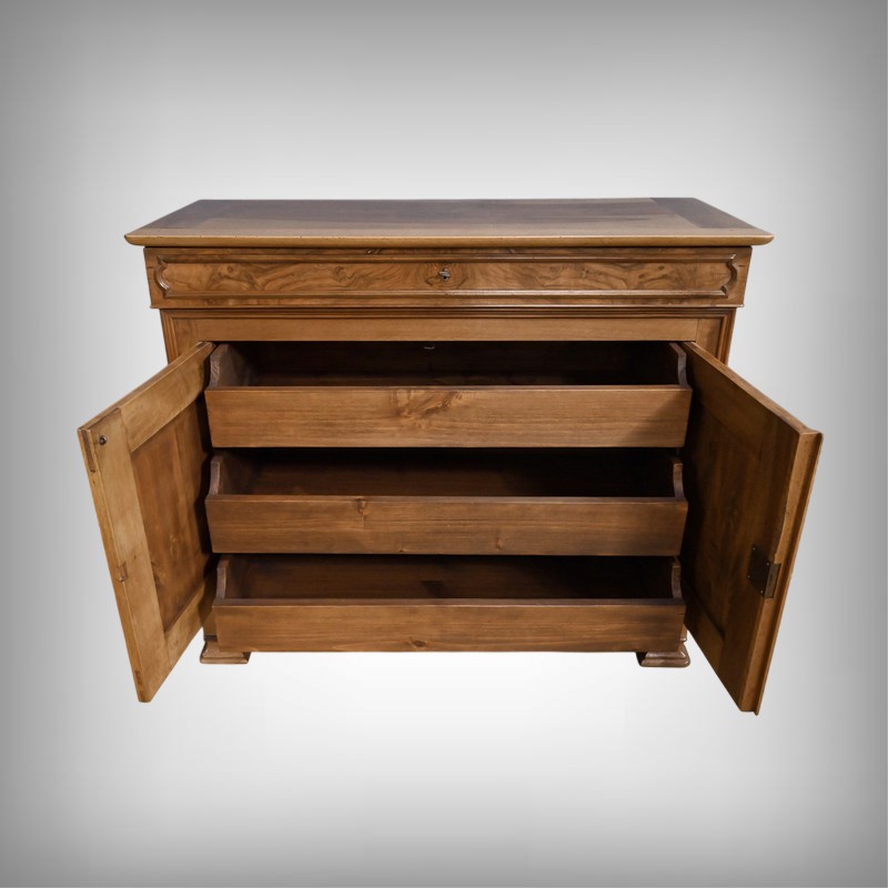 Ce buffet‑commode en noyer incarne parfaitement l’élégance sobre et raffinée du style Louis‑Philippe. Sa façade harmonieuse est structurée par un tiroir supérieur mouluré, dont les lignes douces soulignent la qualité du travail du bois. Ce dernier est équipé d’une clé et d’une serrure fonctionnelle.