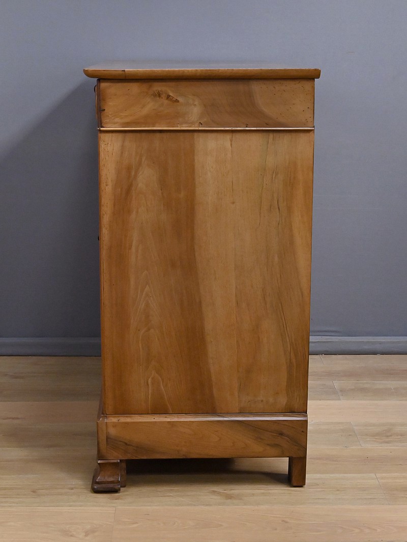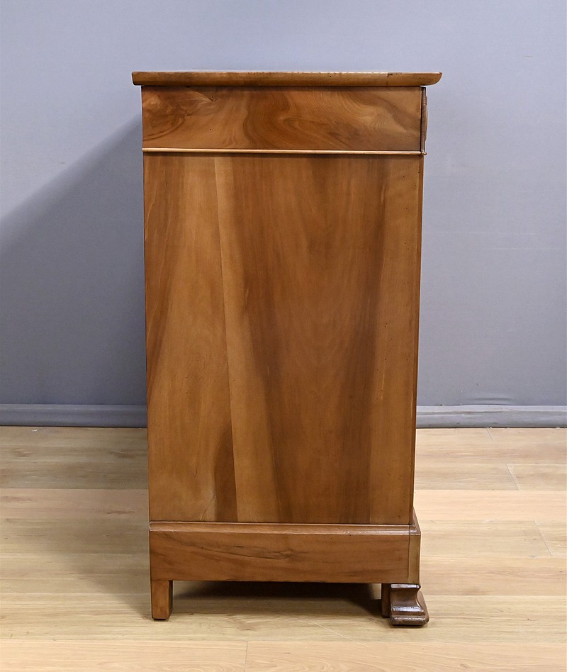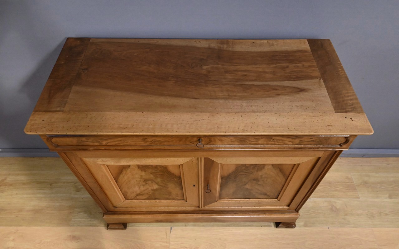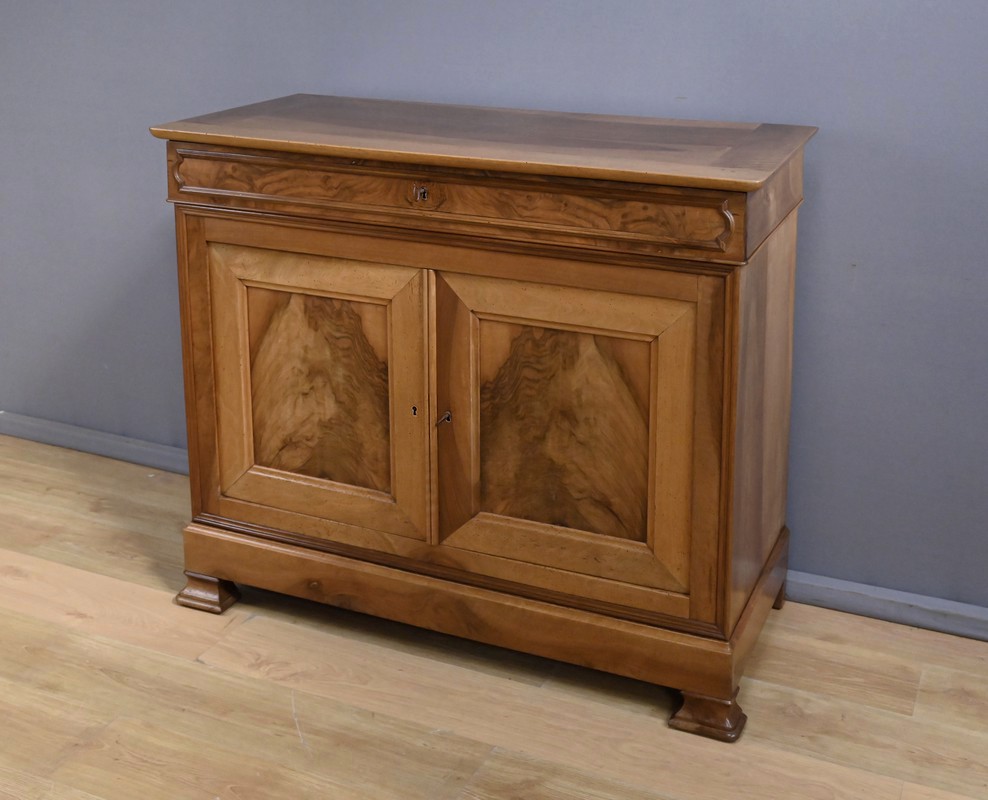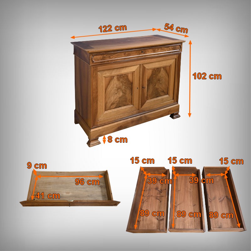 Ce buffet‑commode en noyer incarne parfaitement l’élégance sobre et raffinée du style Louis‑Philippe. Sa façade harmonieuse est structurée par un tiroir supérieur mouluré, dont les lignes douces soulignent la qualité du travail du bois. Ce dernier est équipé d’une clé et d’une serrure fonctionnelle.