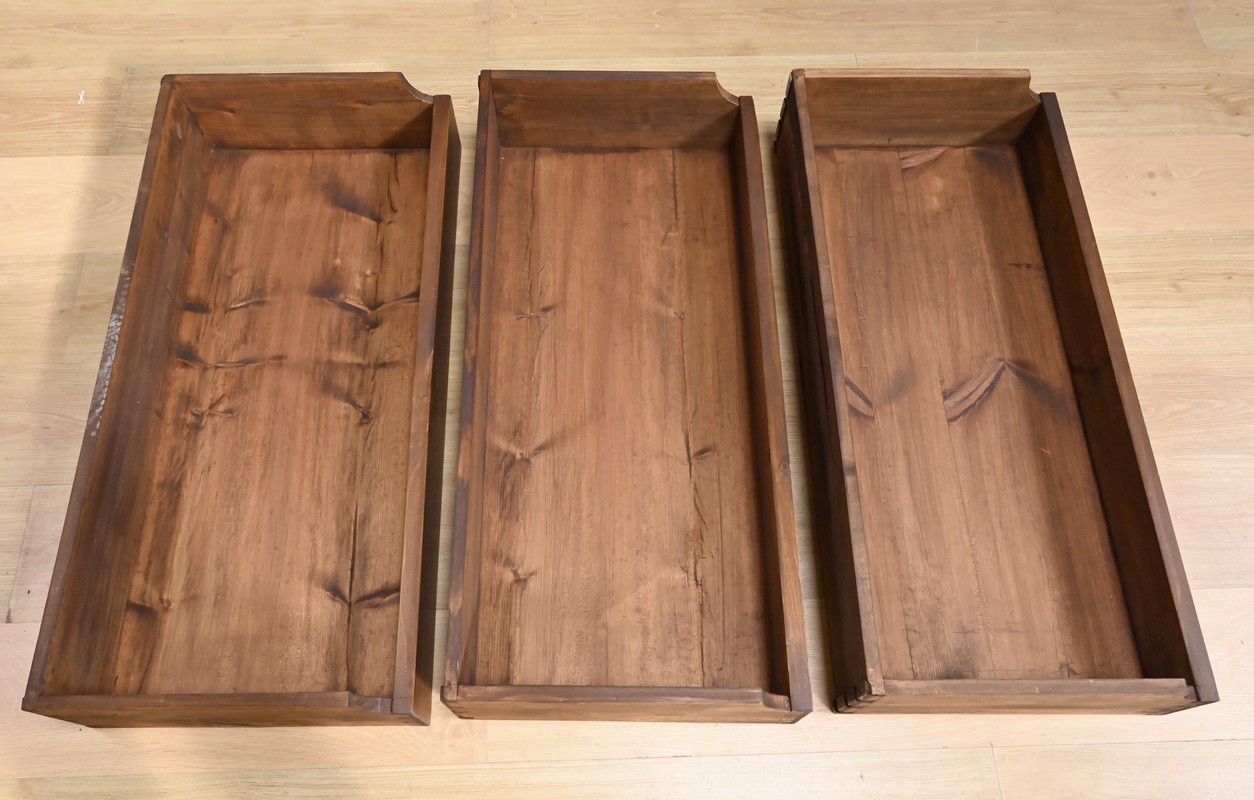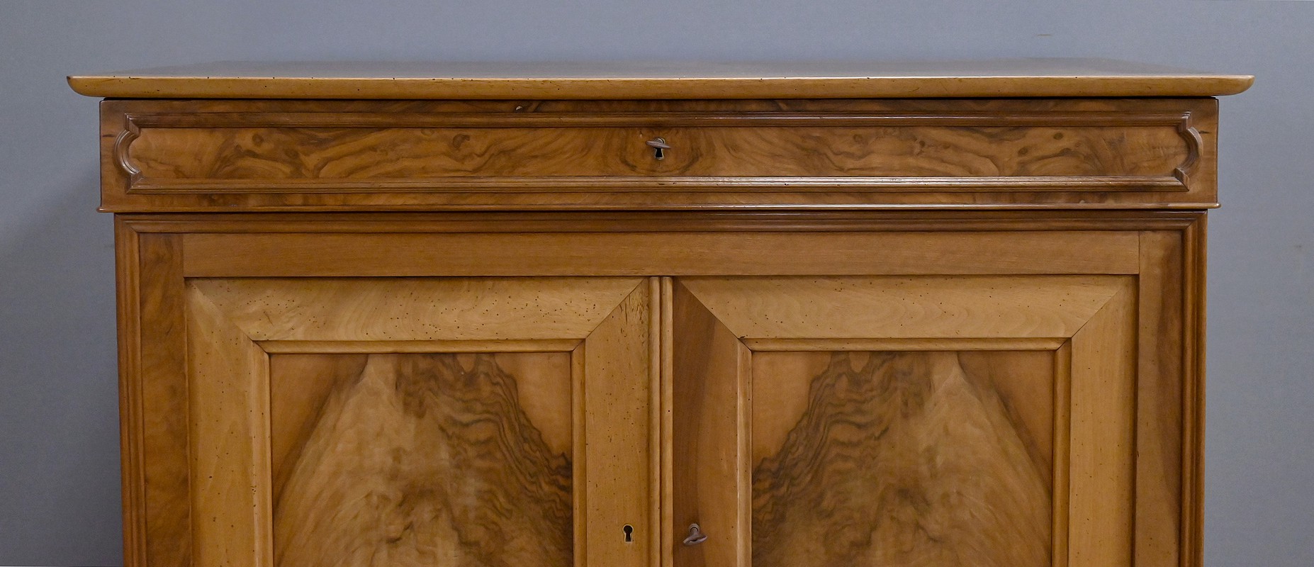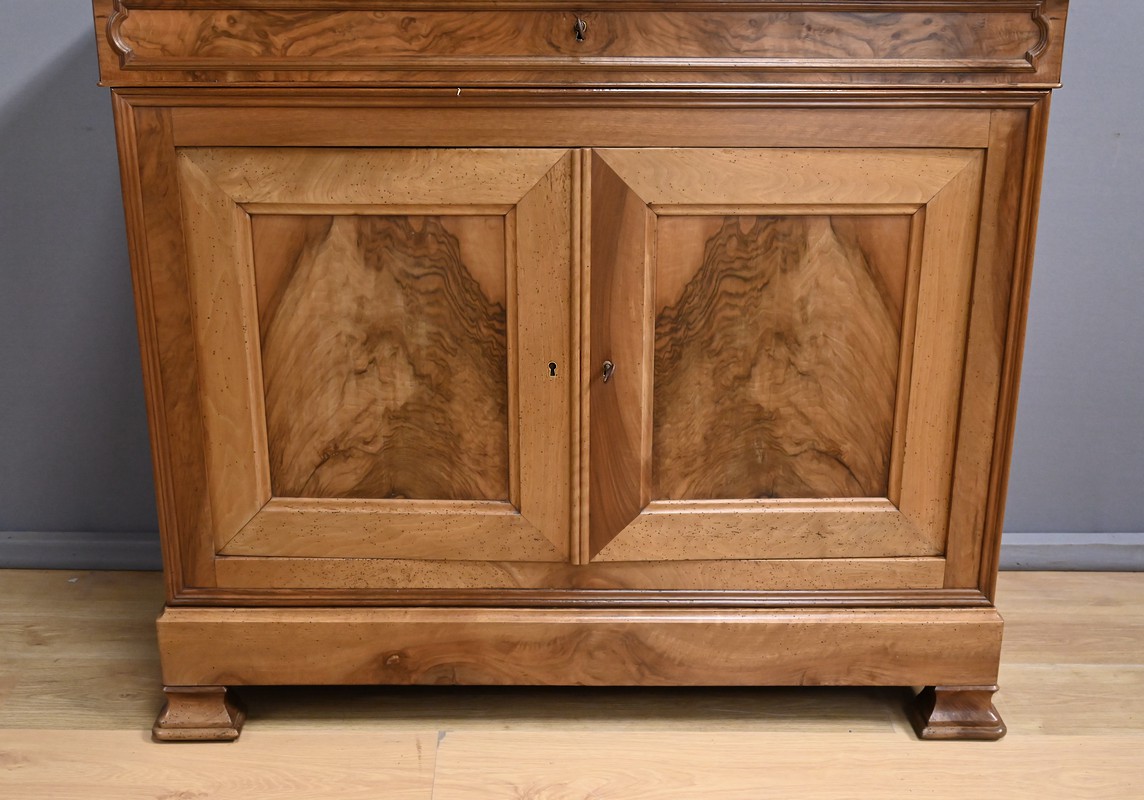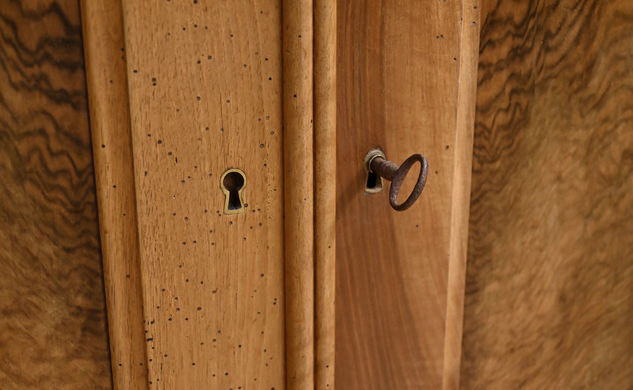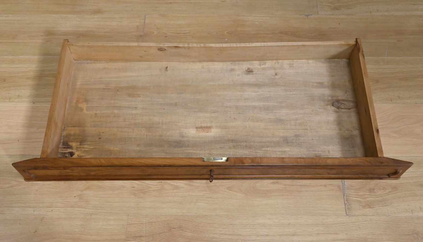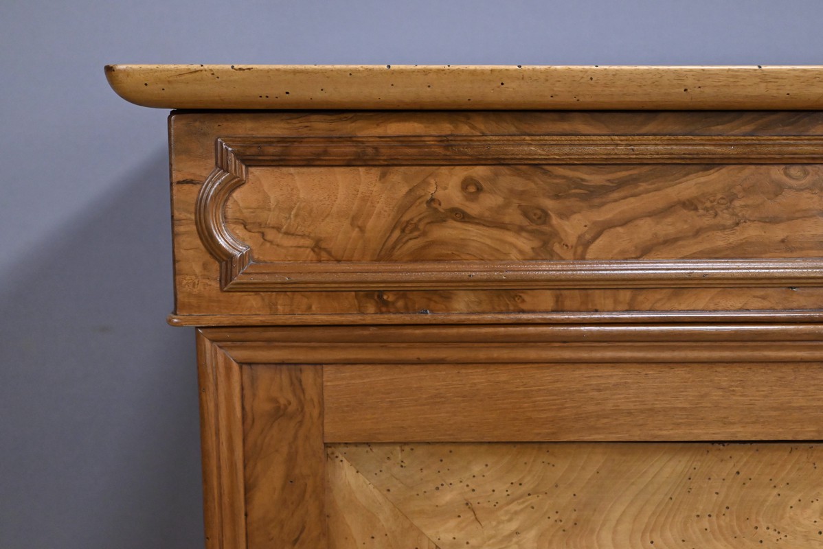 En partie basse, deux portes en noyer dévoilent de magnifiques panneaux encadrés à coupe d’onglet, dont le veinage naturel apporte chaleur et caractère. Une paire de baguettes décoratives vient rythmer le centre de la façade, renforçant la présence élégante du meuble. L’intérieur réserve une belle surprise : trois tiroirs de rangement, parfaits pour organiser linge de table, accessoires ou documents.