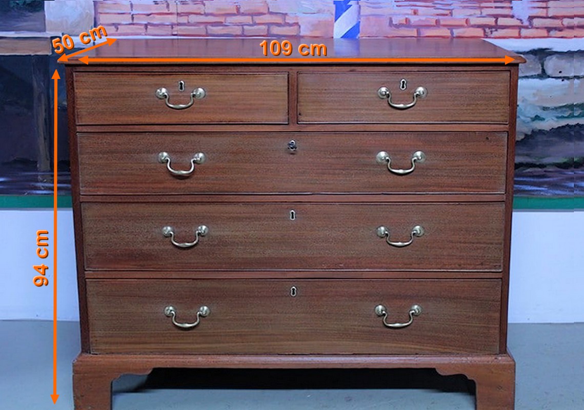 Petite Commode anglaise en acajou massif blond – avec finition cirée – ouvrant à 5 tiroirs sur 4 rangs d’une hauteur croissante de haut en bas. L’intérieur des tiroirs est en chêne et ils sont garnis de petites poignées en laiton. Époque Georgienne : première moitié du XIXe