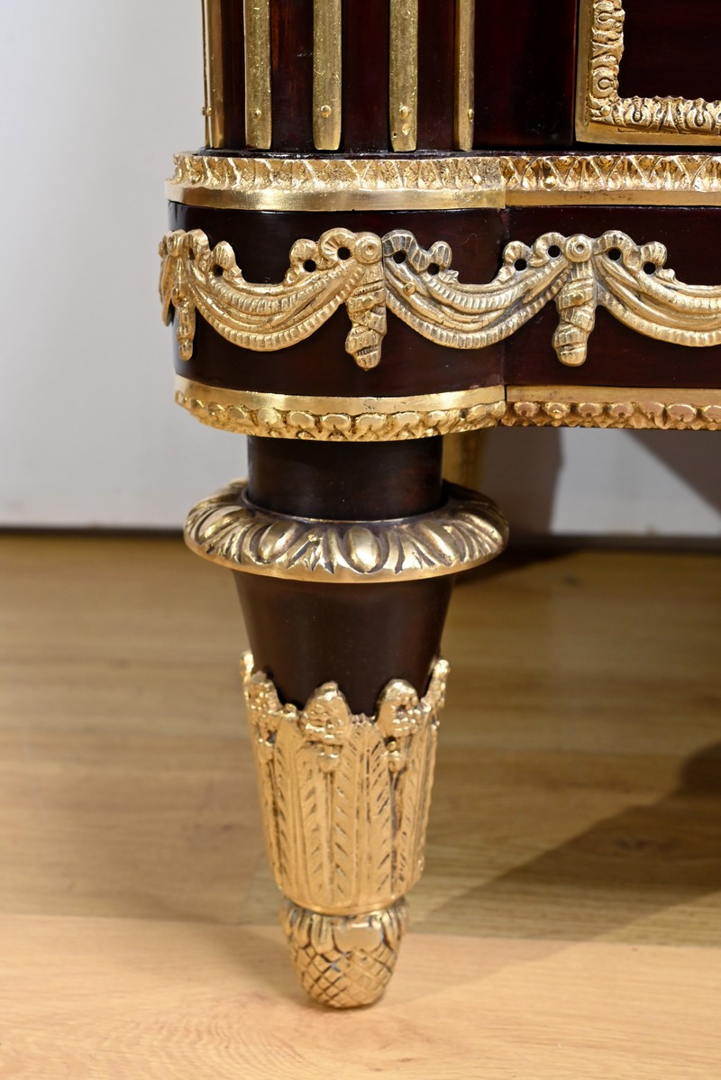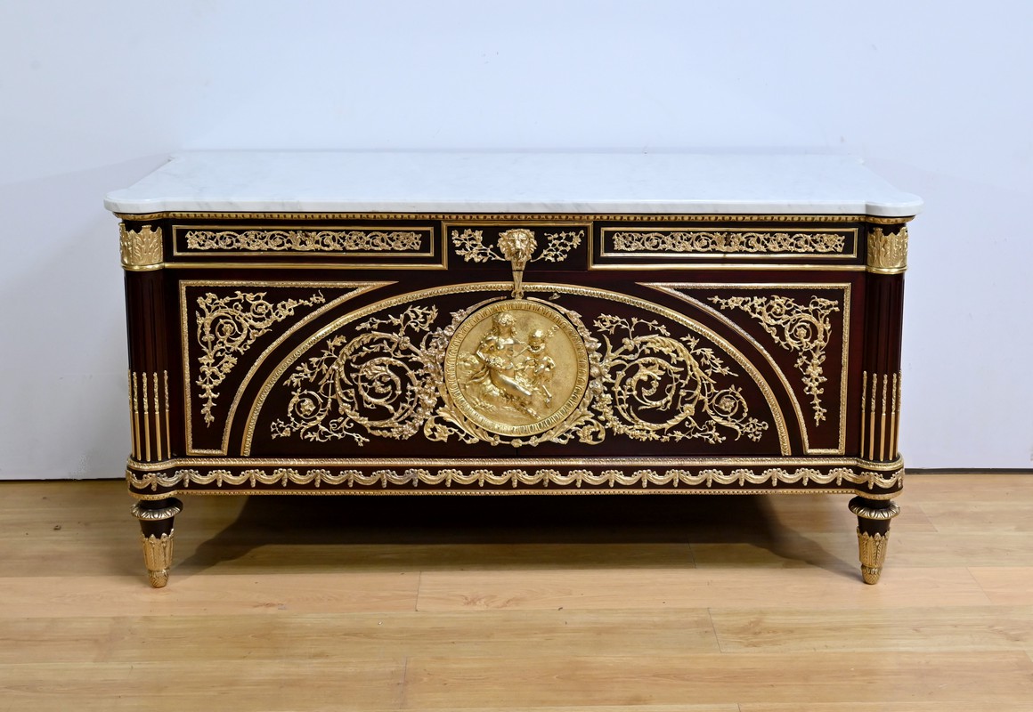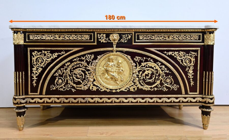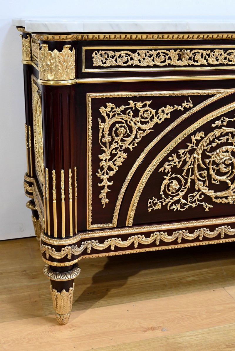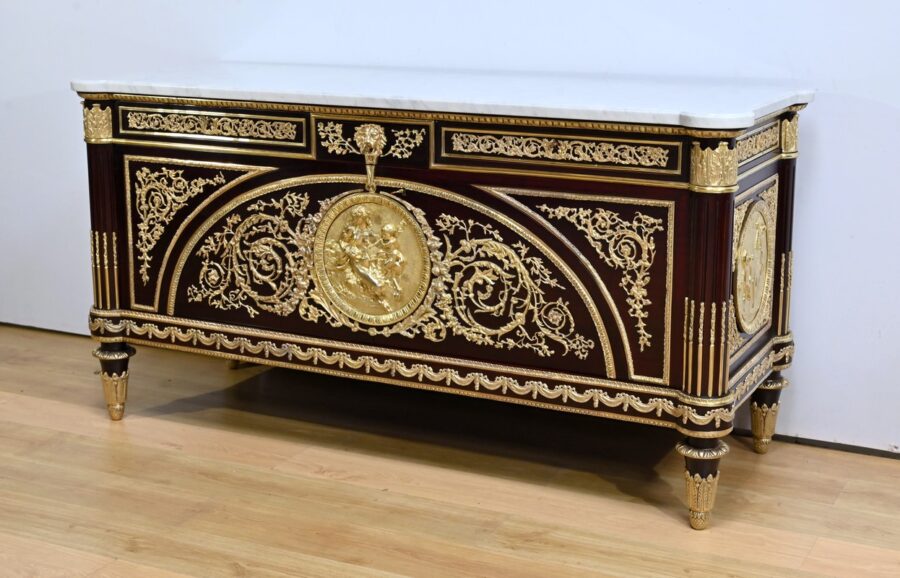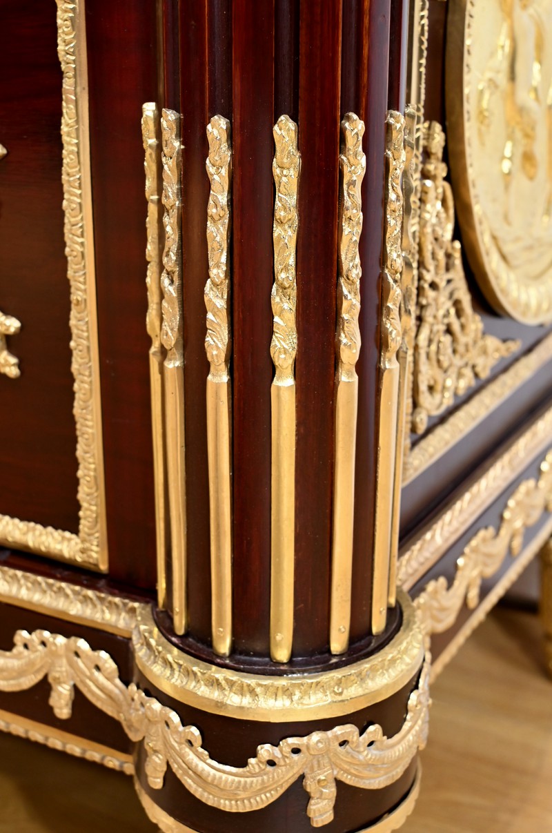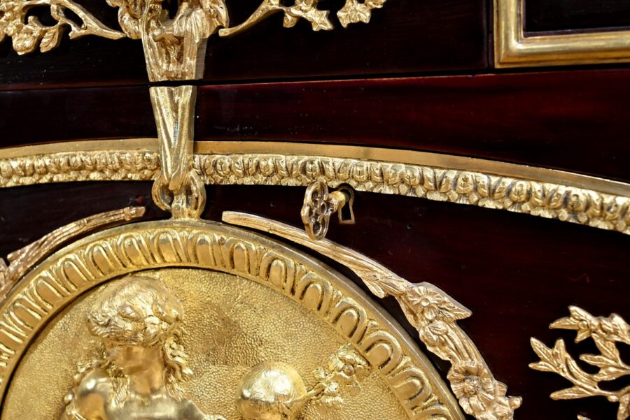 Les nombreuses heures d’ouvrage nécessaires à cette création, tant pour la partie ornement que pour la structure, révèlent un rendu époustouflant où la maitrise et l’art se sont liés pour donner naissance à cette commode Marie-Antoinette.