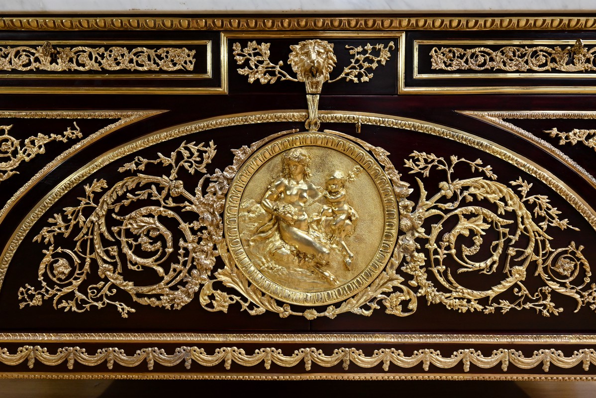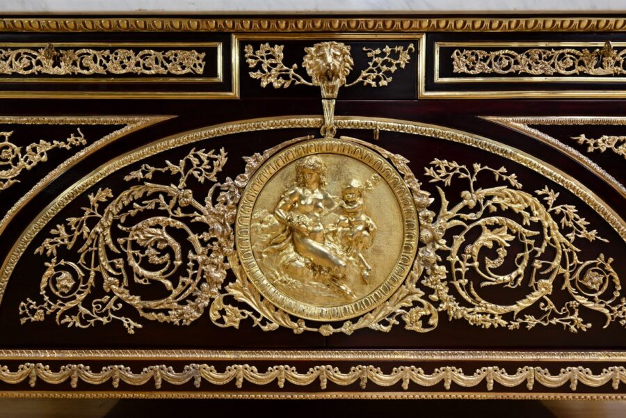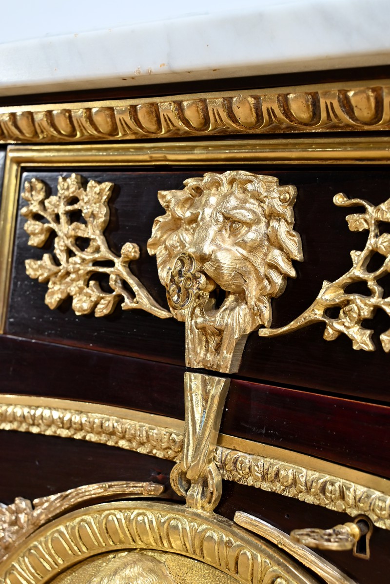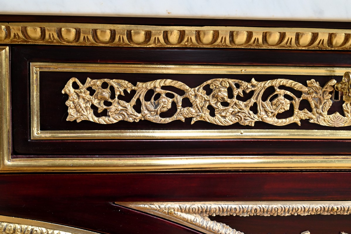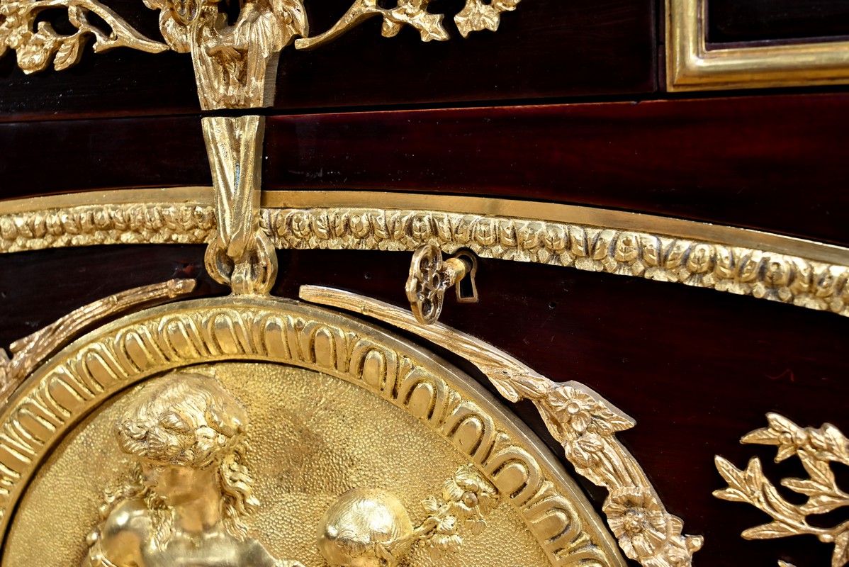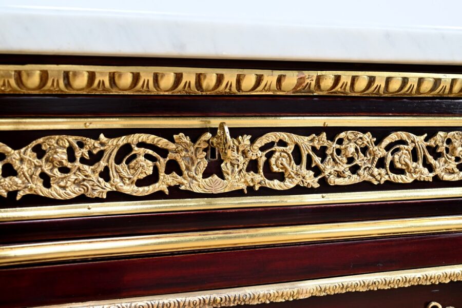 Cette commode ouvre par deux portes généreusement ornementées de bronzes dorés à décors de rinceaux, de frises et e feuilles d’acanthe.