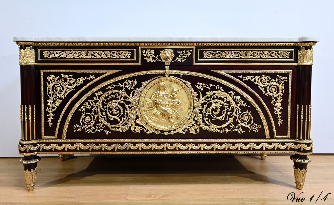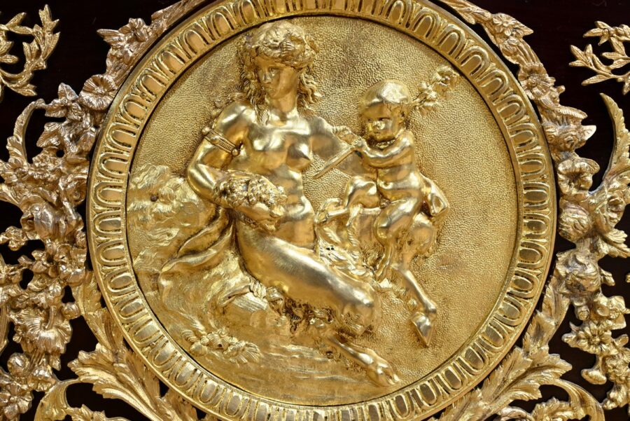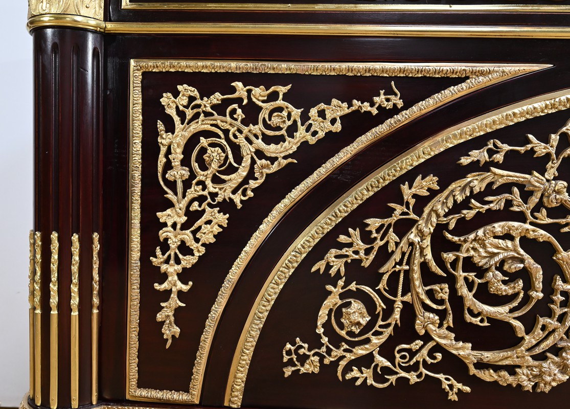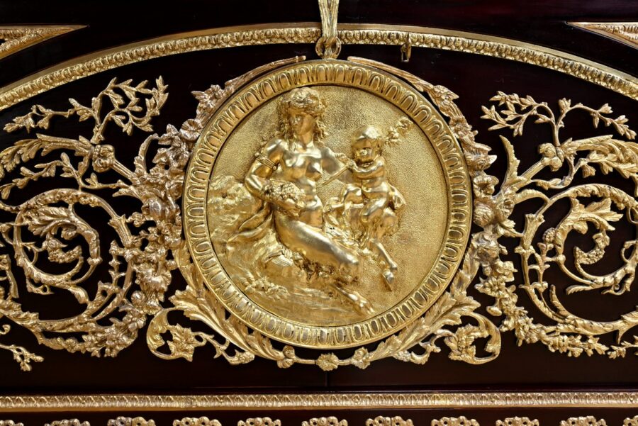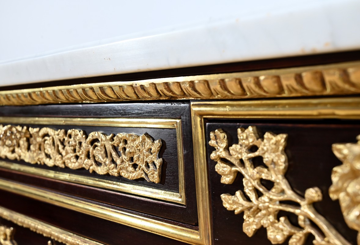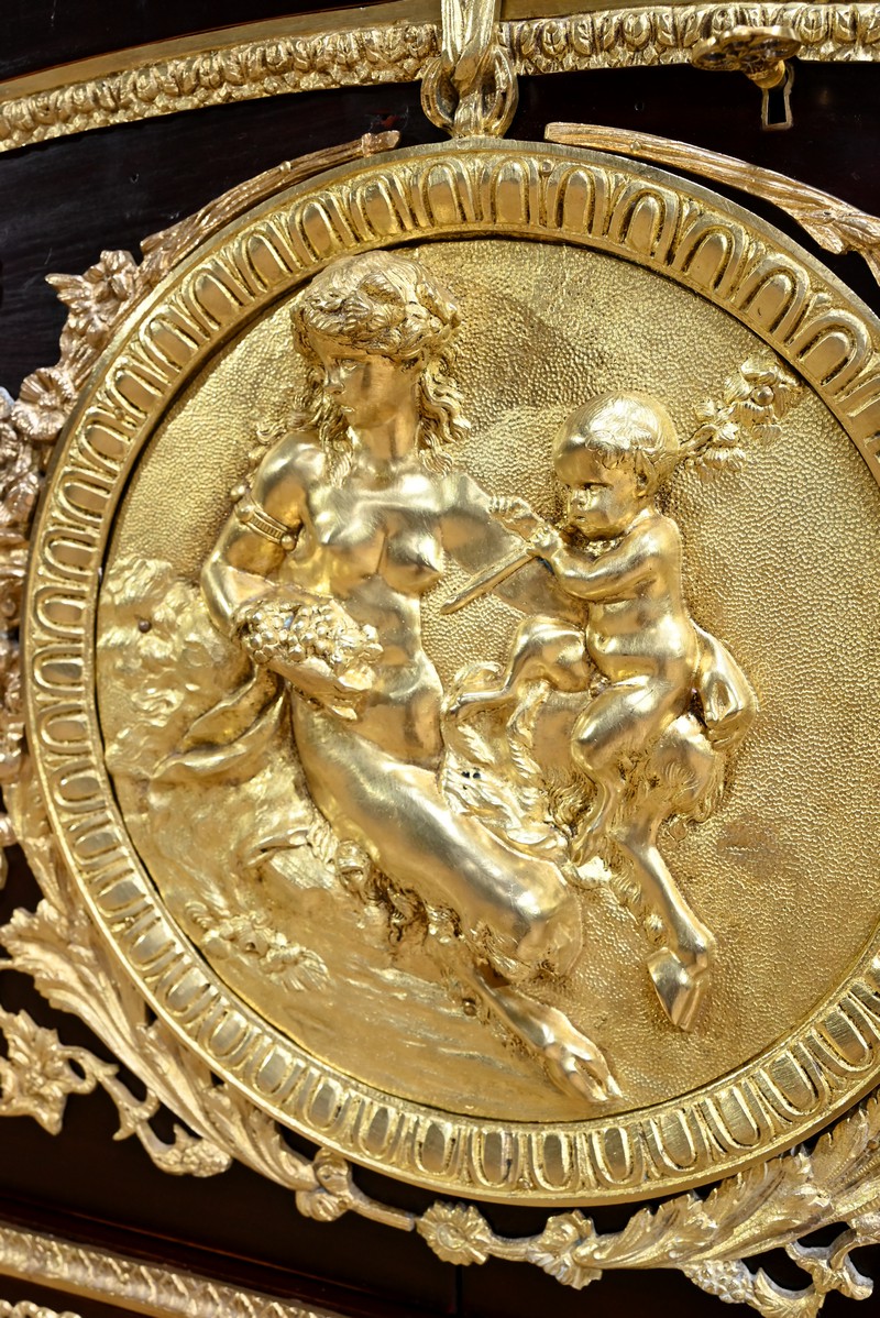 Cette commode ouvre par deux portes généreusement ornementées de bronzes dorés à décors de rinceaux, de frises et e feuilles d’acanthe.