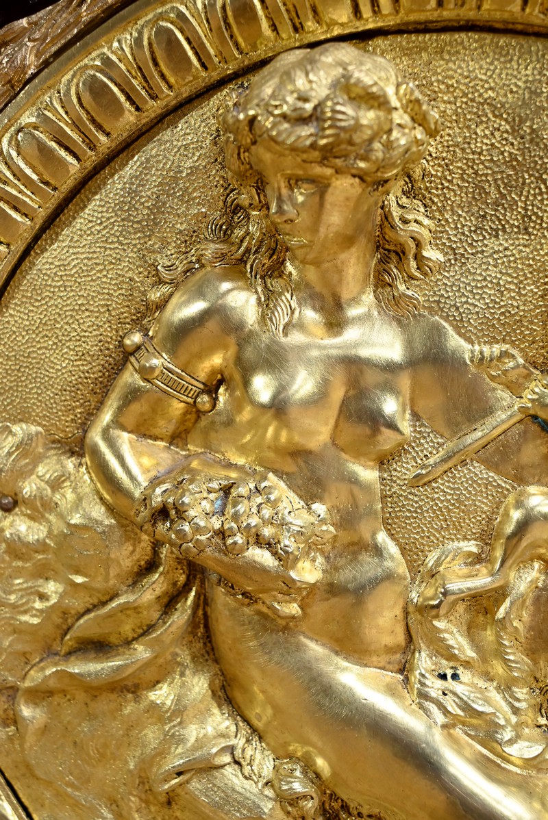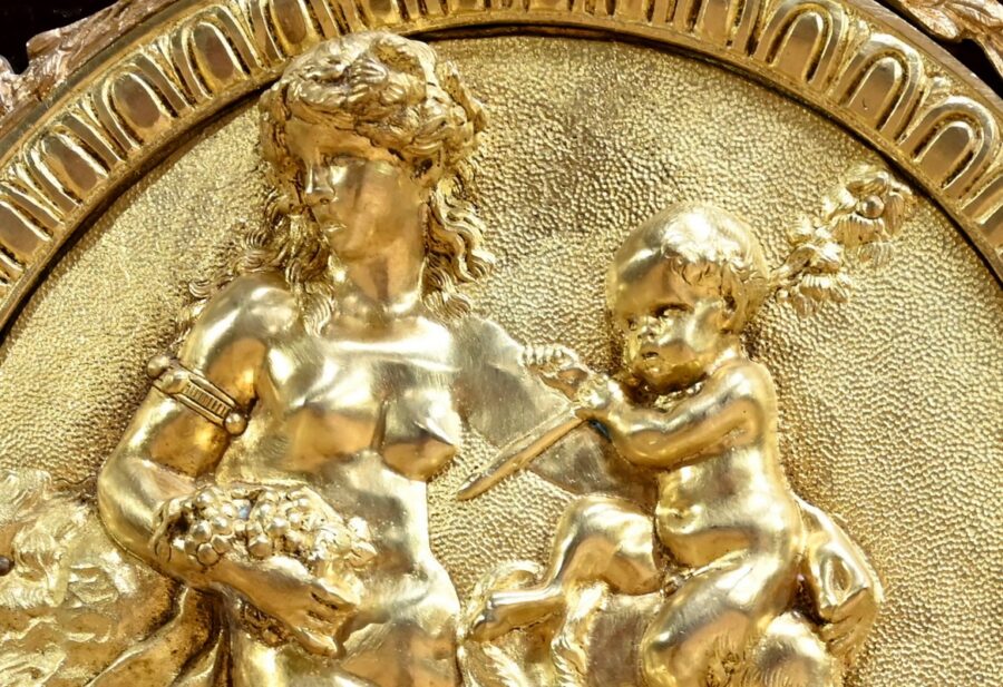 Les côtés sont ouvragés dans le même esprit avec mascarons de scènes.