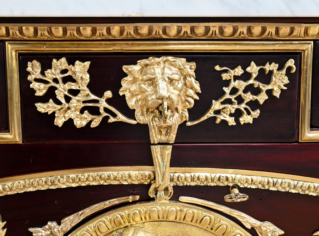 Le tiroir central présente une gueule de lion en bronze en guise d’entrée.