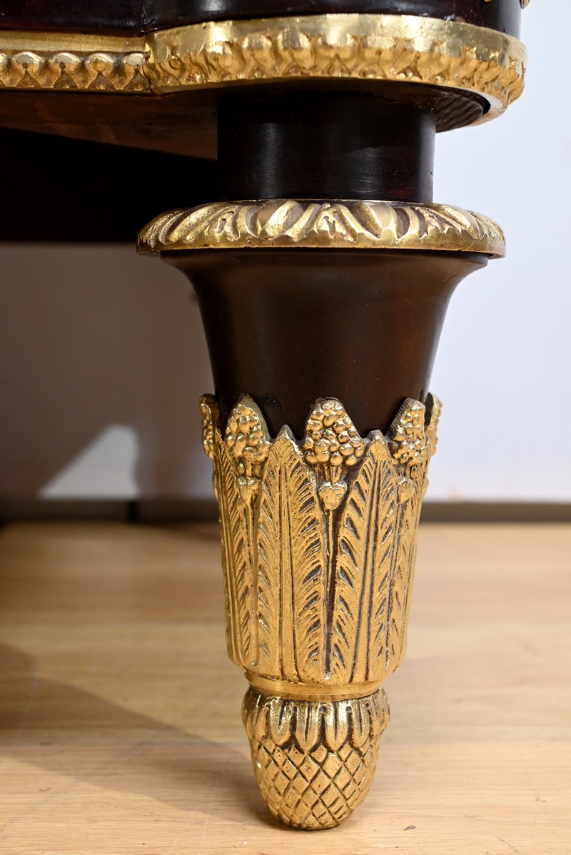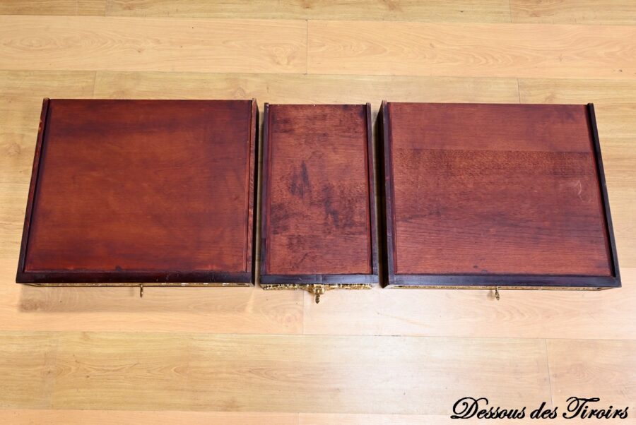 La ceinture dissimule trois tiroirs à décor d’entrelacs souligné de baguette en bronze.