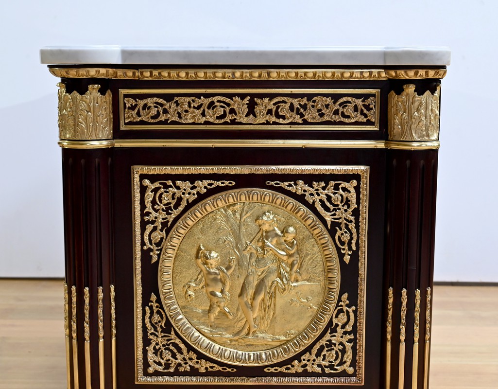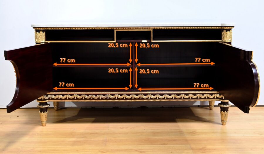 L’ensemble est coiffé d’un marbre de carrare épais suivant les lignes du meuble et bordé par une frise d’oves.