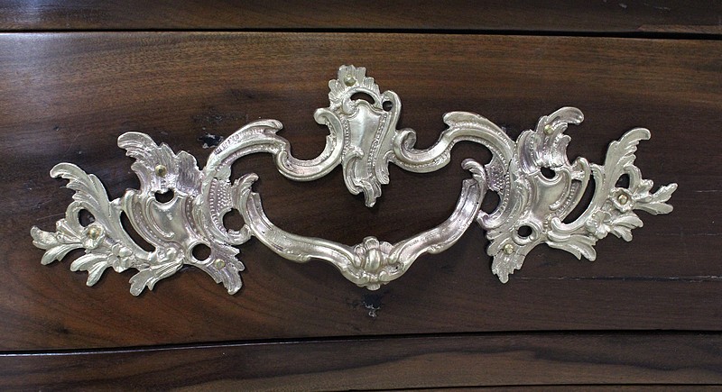 Ce Meuble ouvre par trois tiroirs disposés sur trois rangs et à traverses apparentes. D’une profondeur identique de 15 cm, ils sont Richement Agrémentés d’Importantes Poignées et Entrées en Bronze, d’esprit Rocaille, d’Origine et Authentiques. Chacun de ces tiroirs est équipé d’une serrure en état de fonctionnement accompagnée de sa clé, postérieures au reste de la Commode.