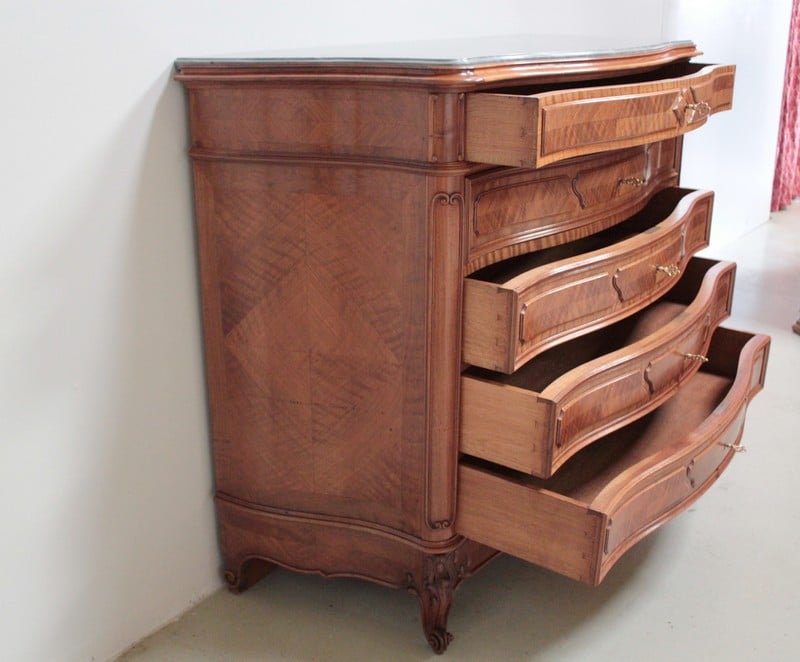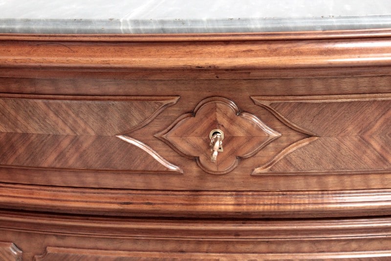 Commode Écritoire de style Louis XV en placage de noyer et dessus de marbre gris. Façade et côtés galbés. Pieds avants à enroulement et pieds arrières droits. Décor de coquille sur la traverse basse.