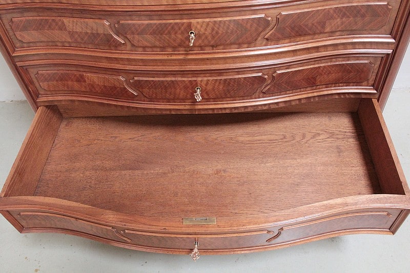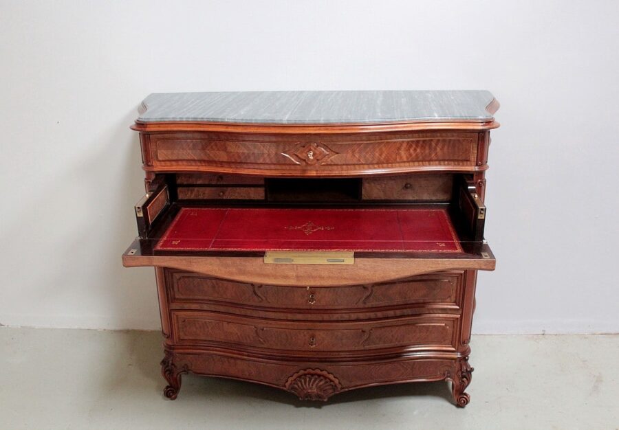Elle ouvre par 4 tiroirs dont les intérieurs sont en chêne et par un abattant recouvert d’un cuir rouge changé. L’intérieur de cet écritoire est en palissandre et il est garni d’un casier et de 3 petits tiroirs dont la façade est en moucheté d’érable.